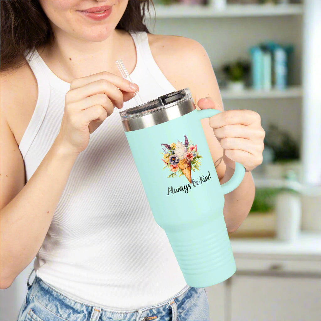 Brighten your day and everyone else’s with this uplifting 40 oz tumbler featuring a cheerful floral cone and the gentle reminder to Always Be Kind. With its soft pastel blue finish and inspiring design, this tumbler is as functional as it is heartwarming.