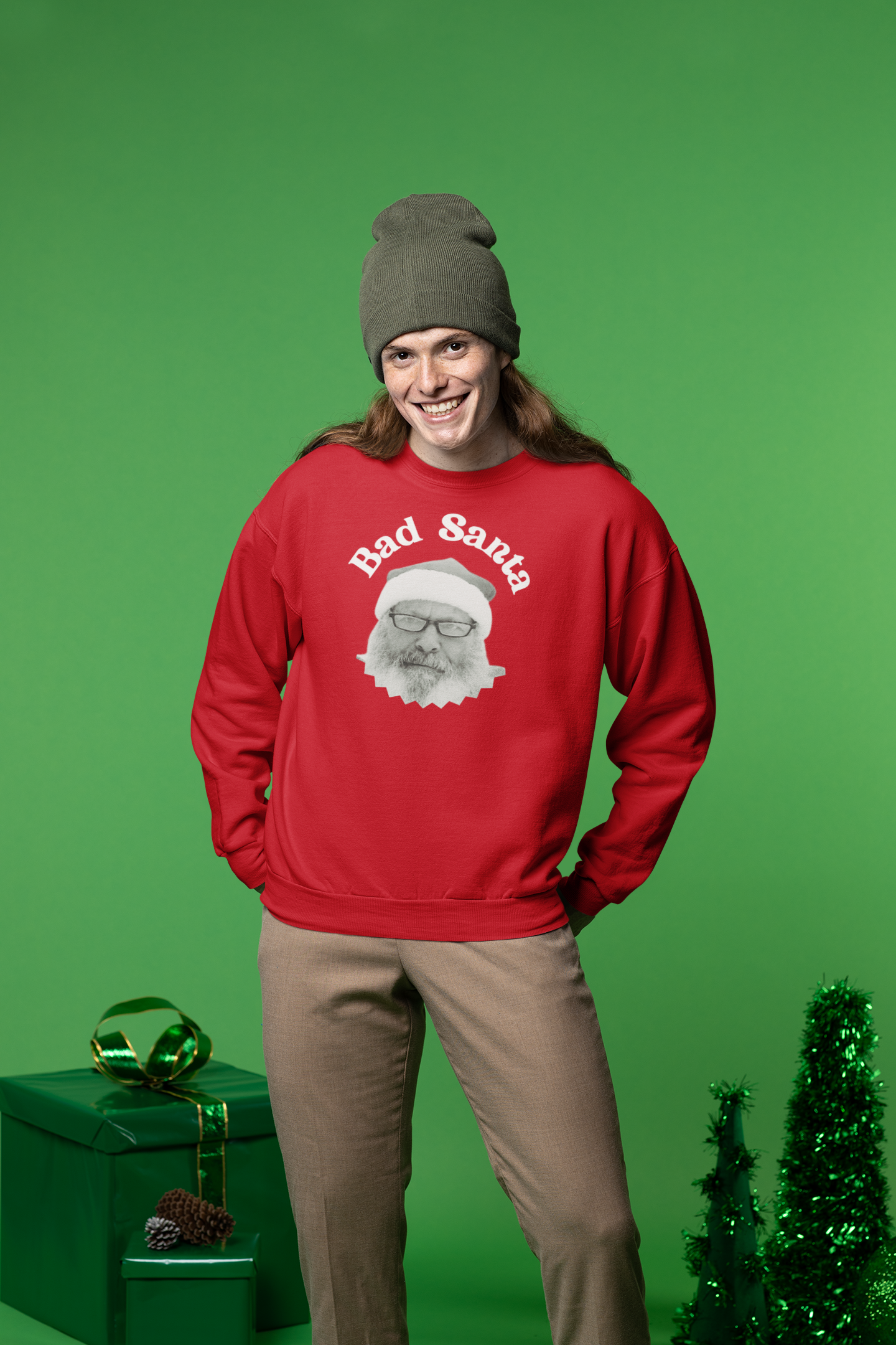 Fun Christmas design of a "Bad Santa". great conversation design in a pure comfort, unisex heavy blend crewneck sweatshirt.