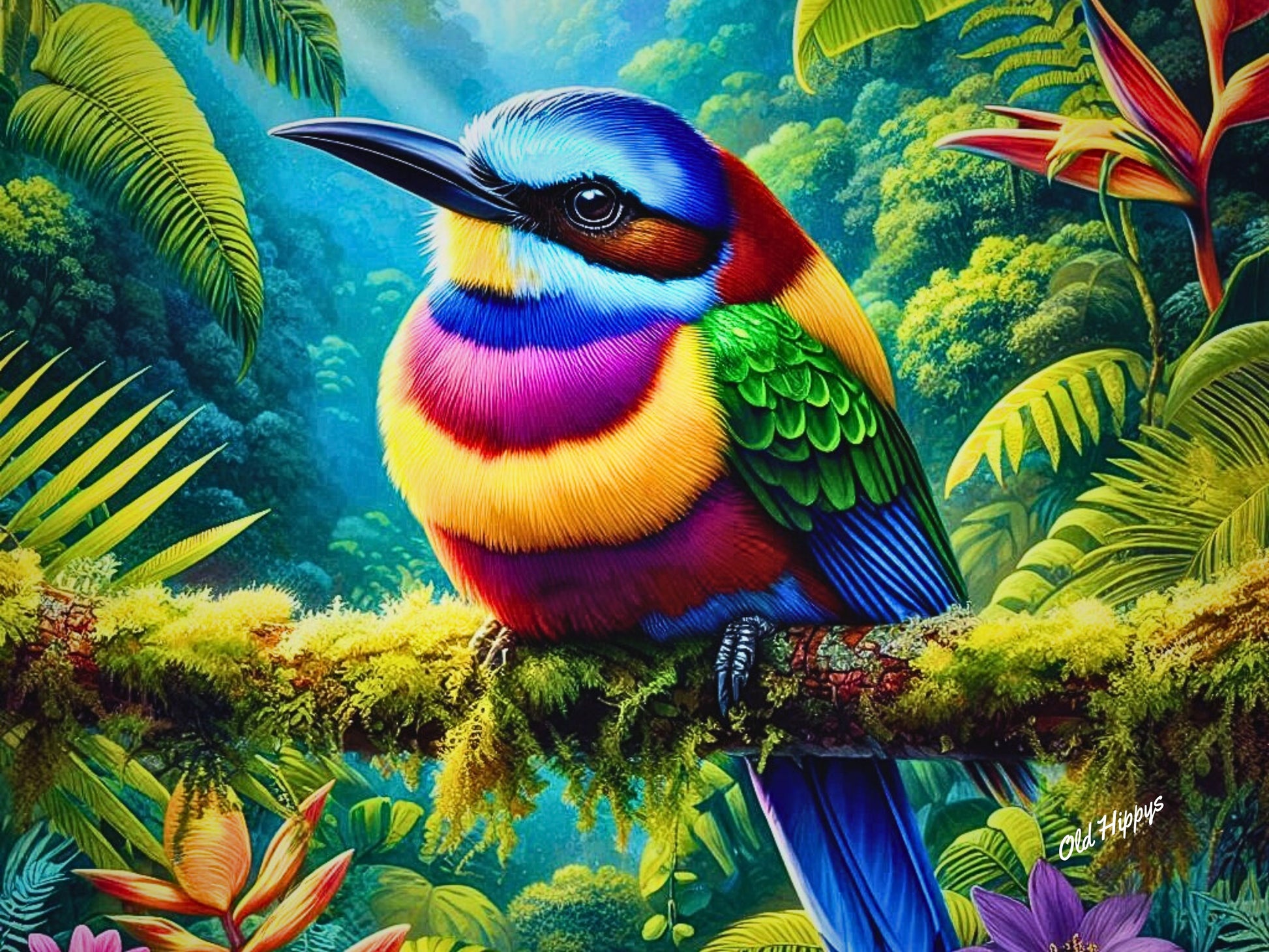 Immerse yourself in the heart of the rainforest with “Bel Oiseau,” a captivating digital masterpiece that bursts with color, life, and wonder. Bel Oiseau is French for Beautiful Bird and that's exactly what this digital art represents. Perched gracefully on a moss-draped branch, this radiant tropical bird dazzles with a breathtaking palette of electric blues, emerald greens, fiery oranges, and magentas — every feather rendered in exquisite detail.