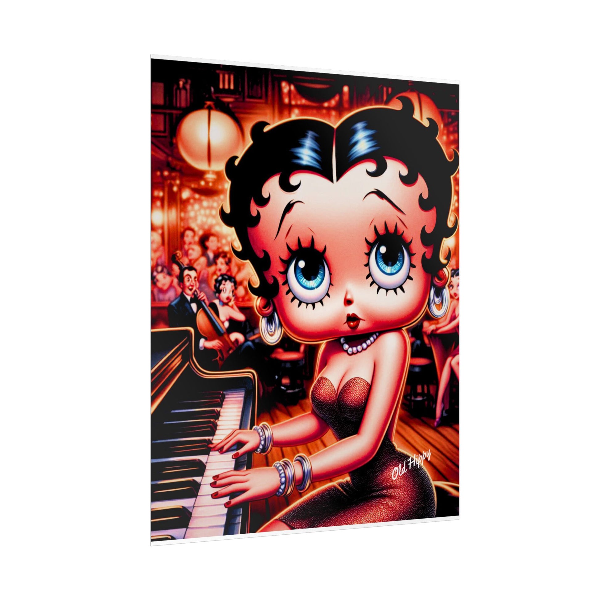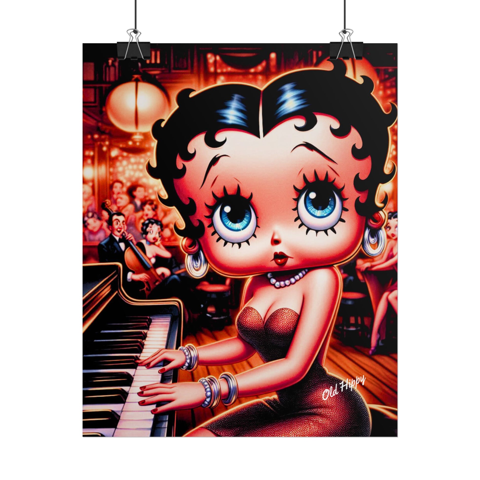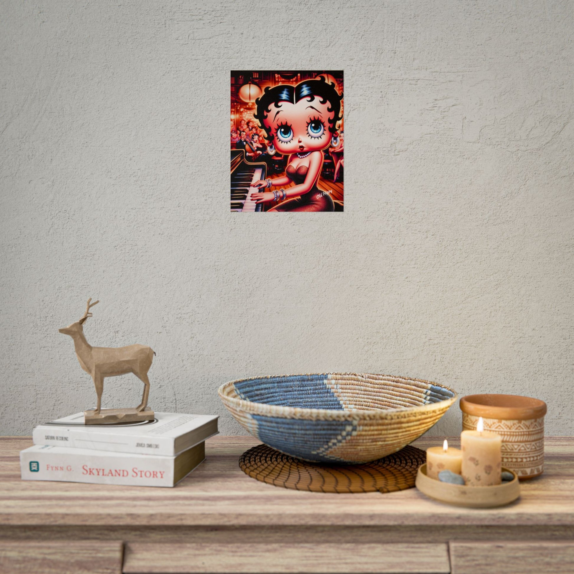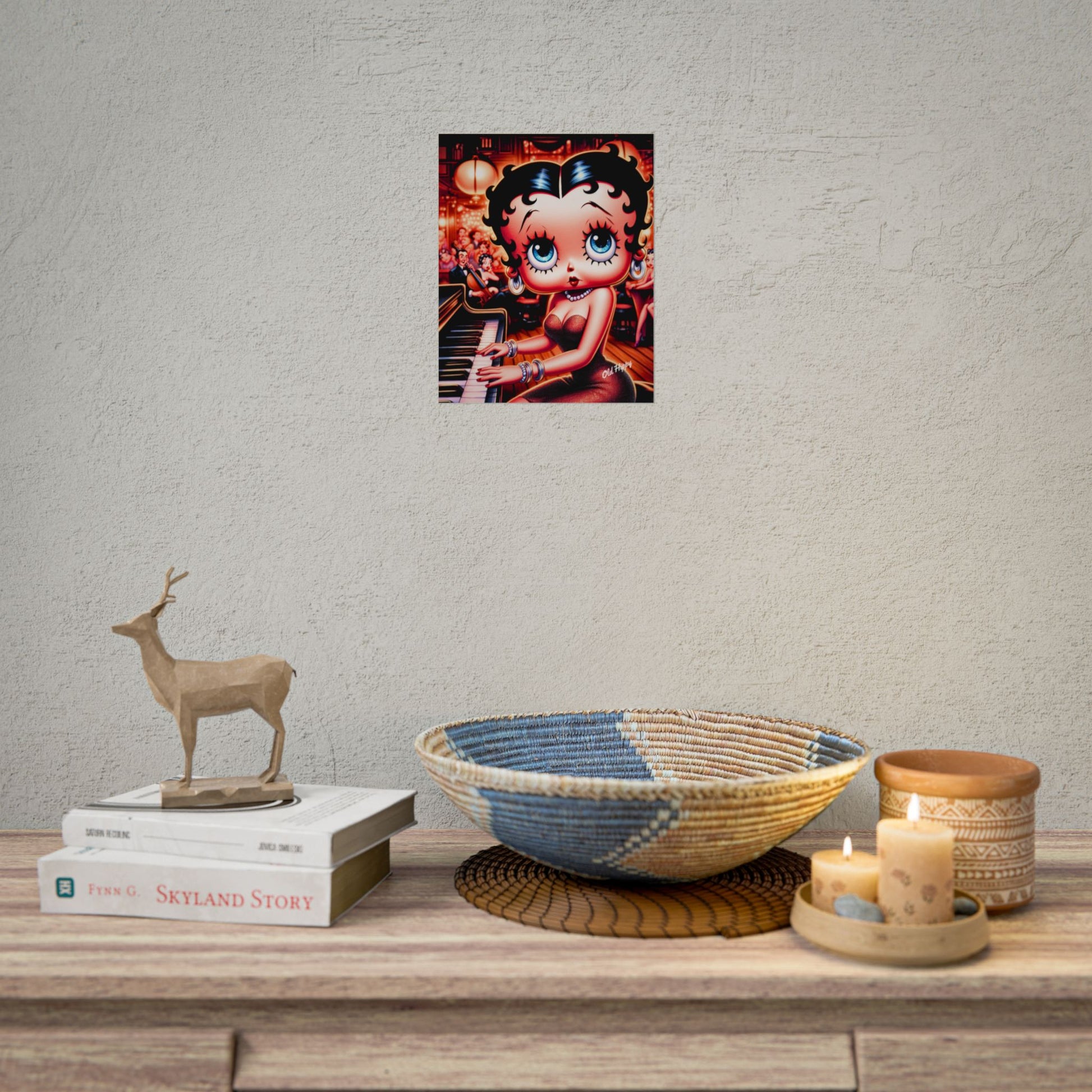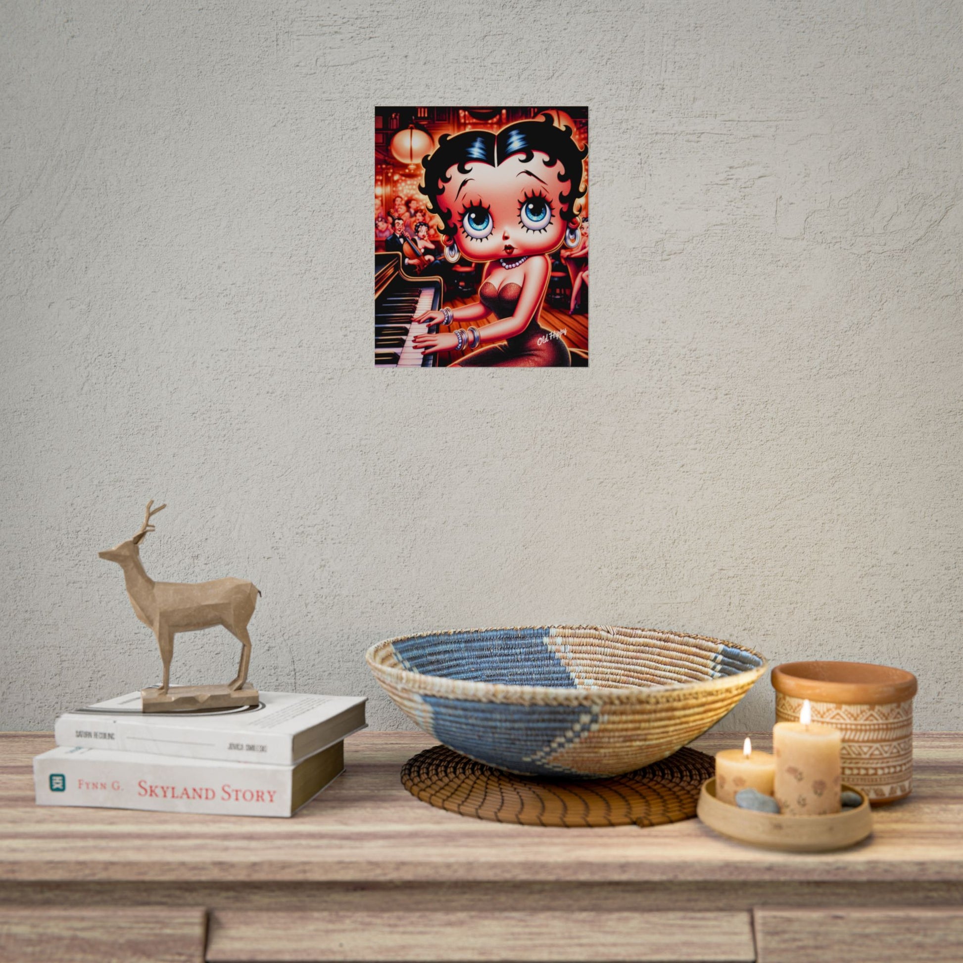 Capture the magic of a bygone era with 'Boop at the Keys' rolled posters. My AI interpretation of classic Betty Boop art. Under the golden glow of a vintage jazz lounge, a wide-eyed starlet takes center stage at the piano, stealing the spotlight with every elegant note. Her iconic curls, sparkling red dress, and playful pout evoke the glamour of a bygone era—channeling the spirit of 1930s cabaret with a modern pop-art twist. The background hums with life: musicians, admirers, and the soft blur of clinking glasses and smoky ambiance, frozen in time.