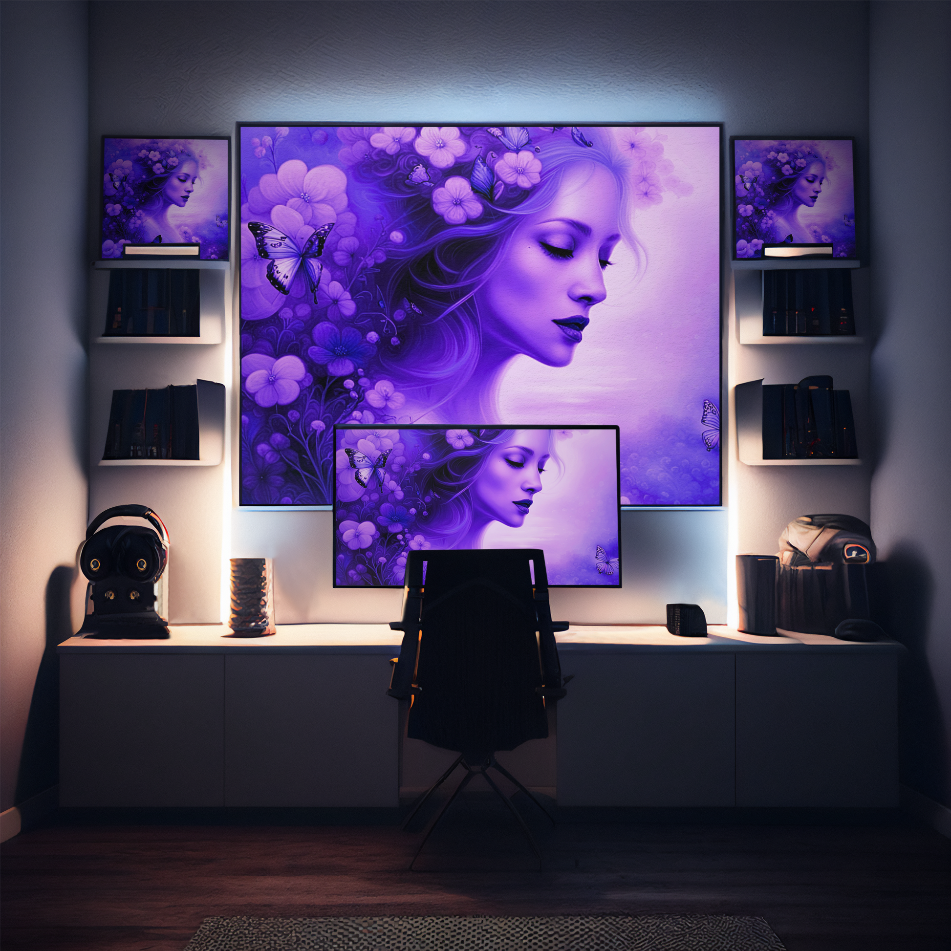 Overall, the digital art captures a moment of transcendent beauty, where the woman and the butterflies exist in perfect harmony, enveloped in a world of purple enchantment.