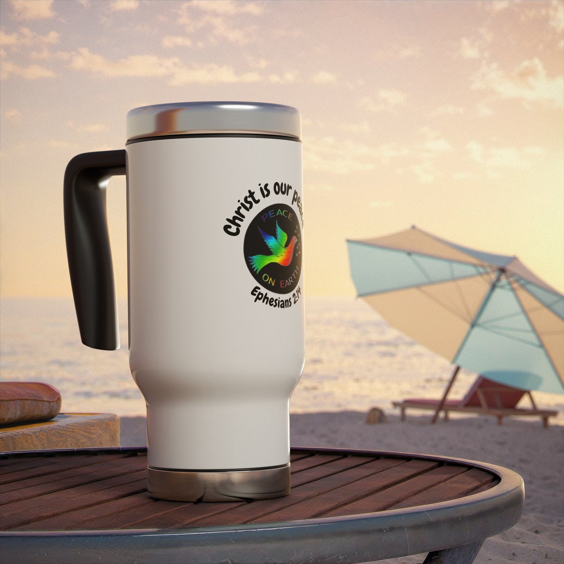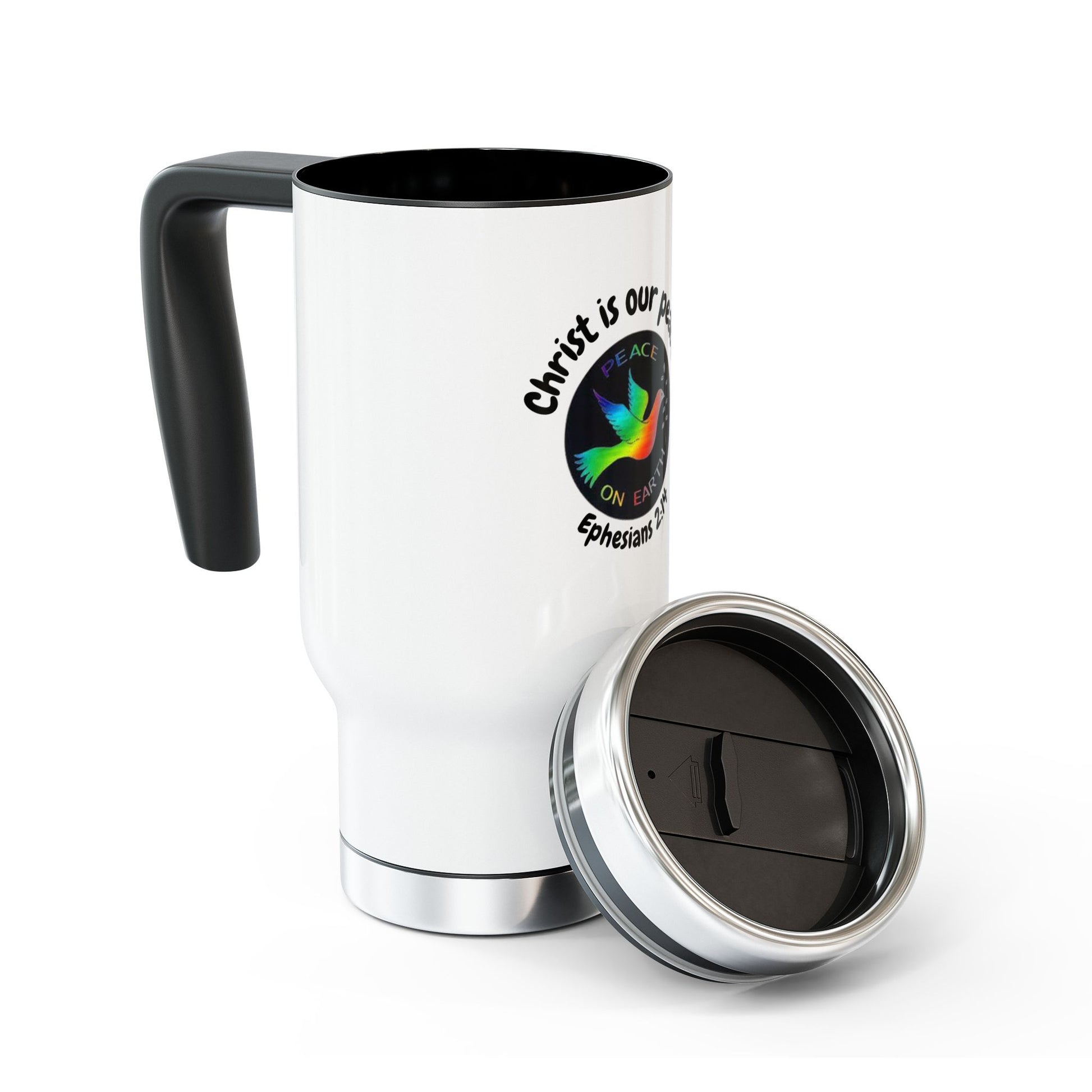 This Christ is Our Peace Ephesians 2:14 Stainless Steel Travel Mug is perfect for the individual who wants to start their day with a comforting message. Celebrate faith, unity, and hope with this inspirational "Christ Is Our Peace" Travel Mug, featuring the powerful scripture from Ephesians 2:14. The insulating plastic keeps drinks at the perfect temperature while the spill-resistant cap ensures no messes. Ideal for those who enjoy a warm beverage on the go, this mug is relevant for religious holidays and celebrations.