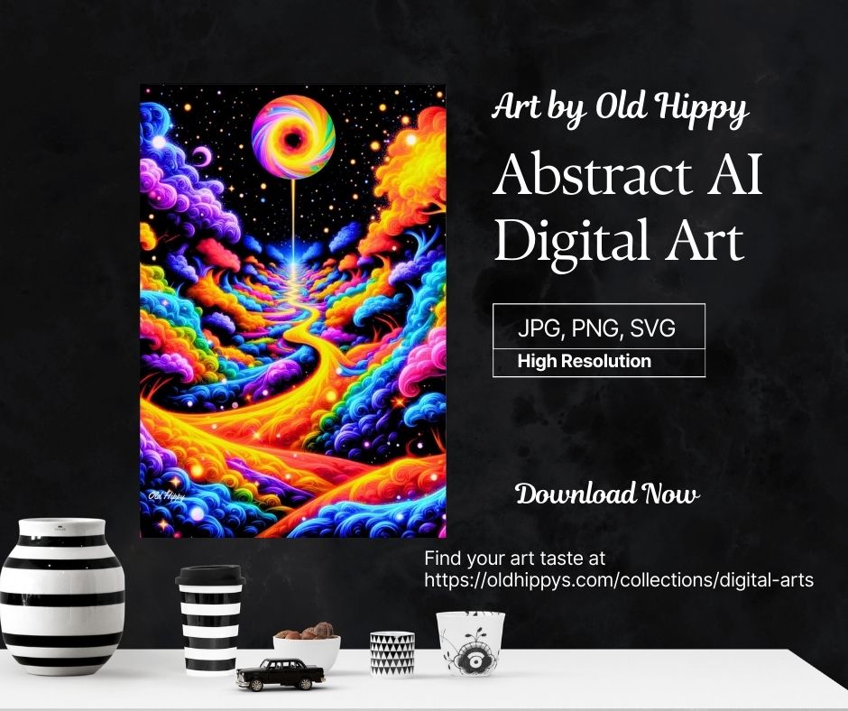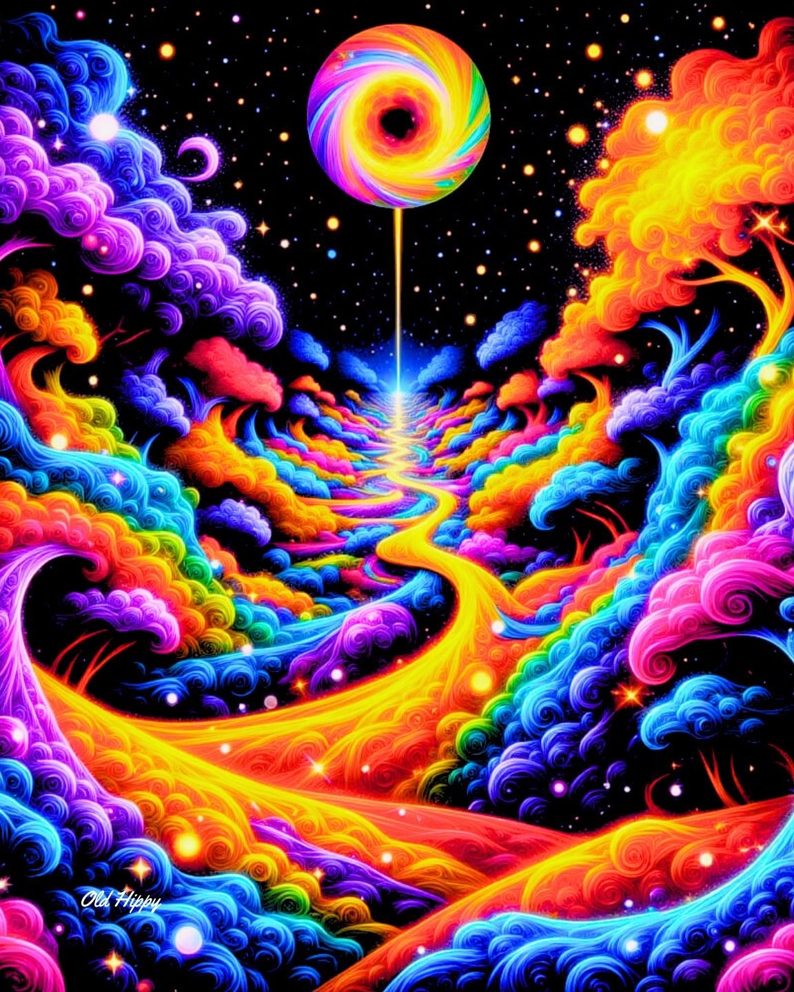Step into a world of vibrant imagination with Cosmic River of Light, an AI-generated digital masterpiece by Old Hippy. A glowing golden river winds through swirling neon skies, leading the eye to a radiant cosmic vortex suspended in the stars. Bursting with luminous color—fiery oranges, deep purples, cosmic blues, and radiant pinks—this artwork captures the essence of cosmic energy, psychedelic journeys, and infinite wonder.