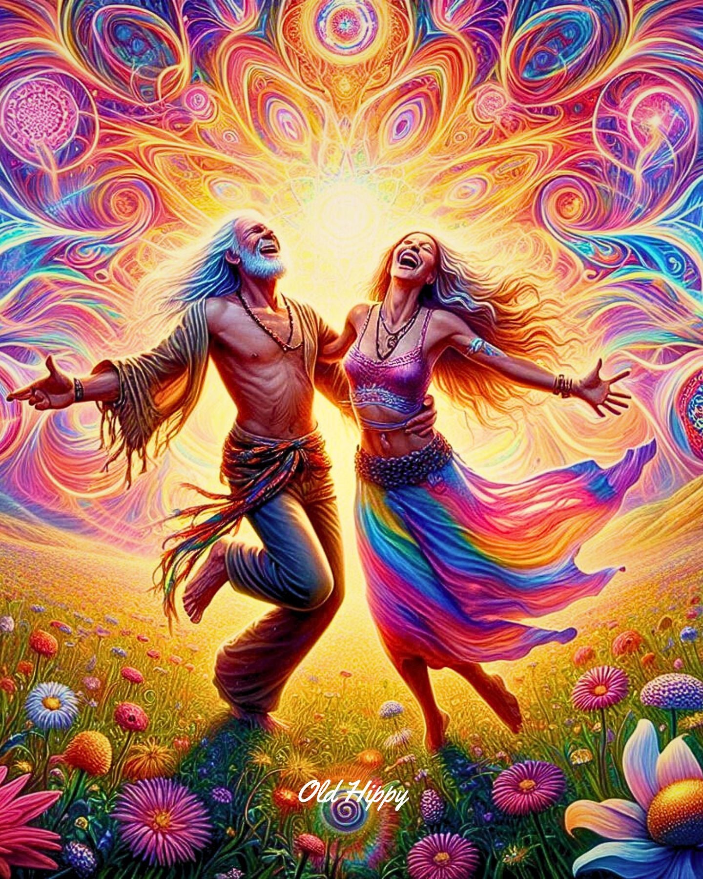 A breathtaking explosion of color and spirit, this psychedelic artwork captures a senior hippie couple in a moment of pure, unfiltered joy. With arms wide open and faces turned to the heavens, they dance barefoot in a glowing meadow of radiant, oversized flowers. Their laughter becomes energy — merging with the cosmic patterns that spiral and burst from the center of the sky like a sun made of love, light, and swirling mandalas.