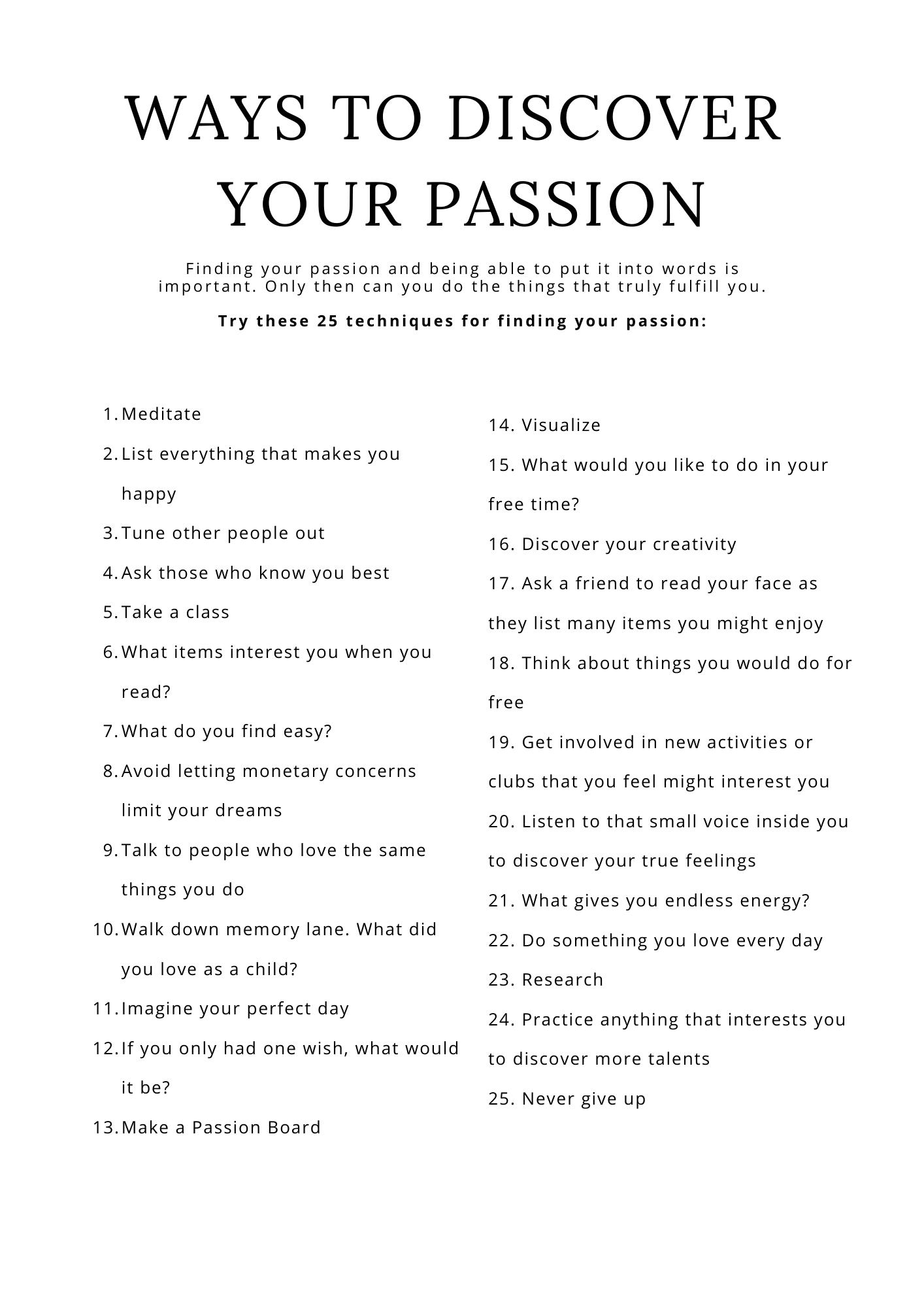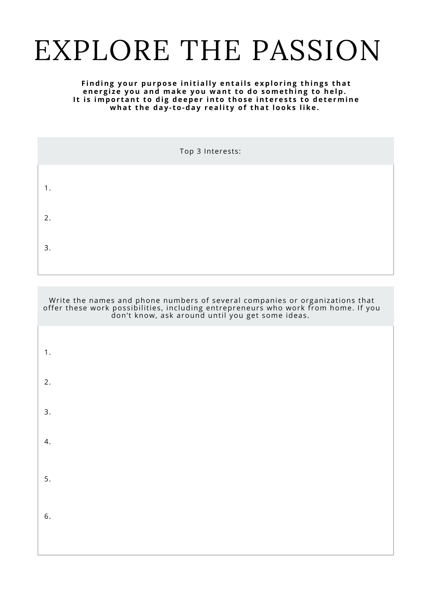 This journal provides a documented formula for you to engage in real reflection and introspection to explore what your true passion(s) is or are.. By having a systematic approach to examine your interests, you can come to solid results and open the path to realizing your true passion.