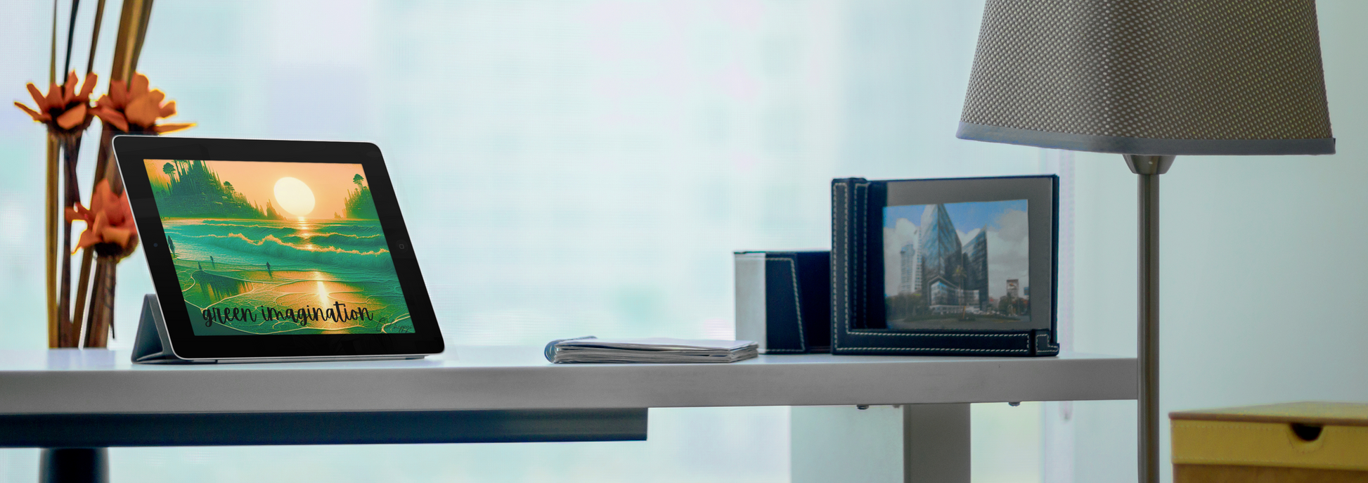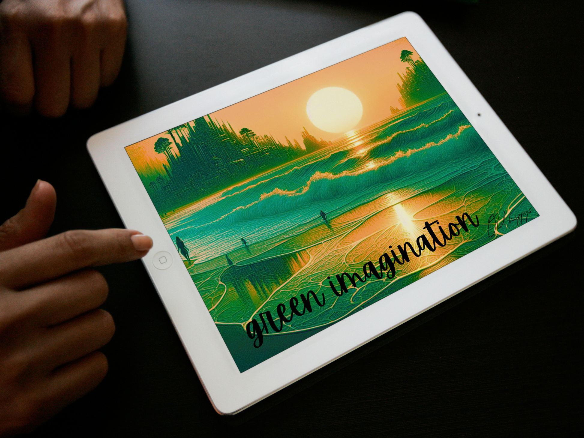 Imagine a beach setting with people leisurely strolling and admiring the waves, set against a backdrop of fantasy islands in various shades of green, creates a tranquil and enchanting scene. The blending of the natural beach environment with strange island images evokes a sense of wonder and escapism for the viewer. The green hues give the scene a dreamy and ethereal quality, enhancing the feeling of being transported to a magical realm.