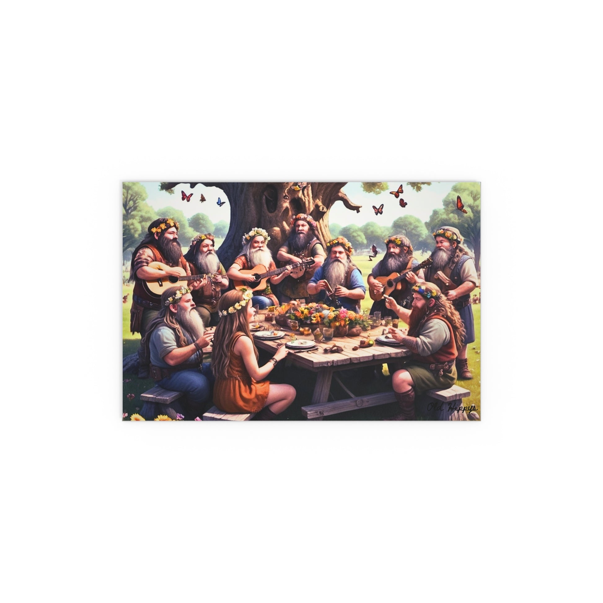 In the serene, sun-dappled woods, a young hippie woman sits gracefully at a large outdoor table under a sprawling oak tree. Her long, flowing hair is adorned with a headband made of vibrant flowers, adding to her ethereal, free-spirited appearance. Around the table, young hippie dwarves are gathered, each with a distinct personality and colorful attire. Some of the dwarves are playing instruments, filling the air with melodious tunes.