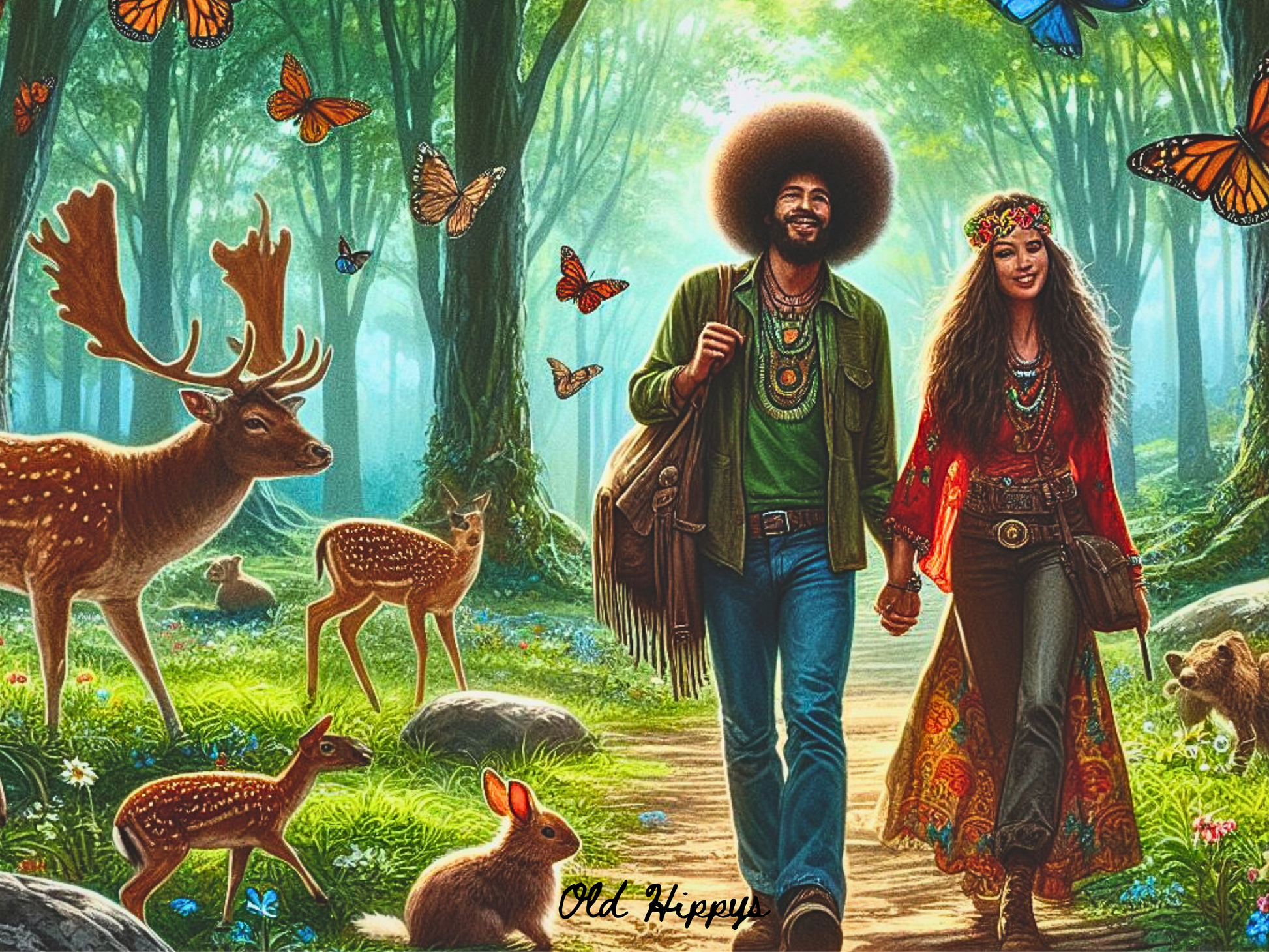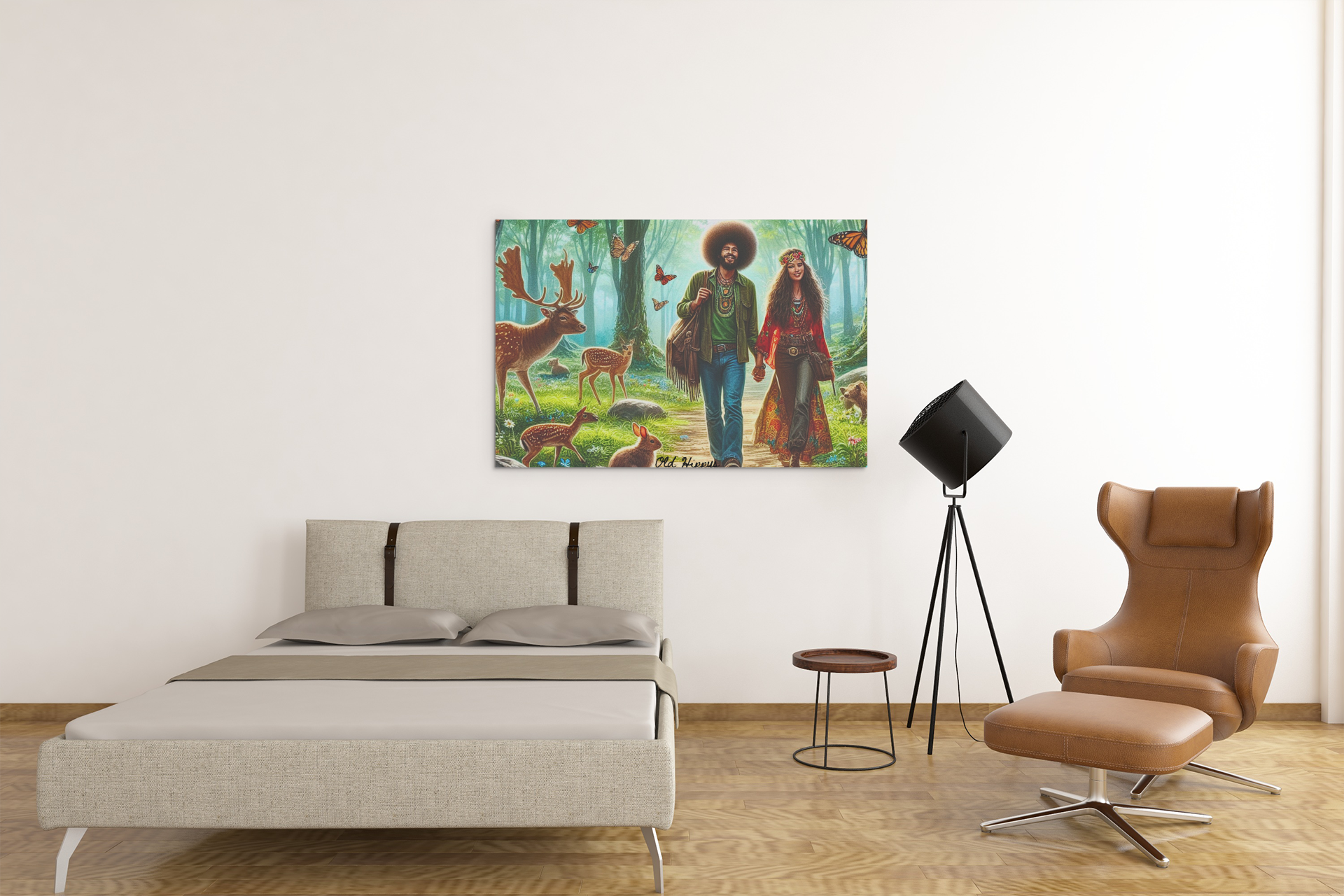 This delightful Digital Art captures a young Hippie or Bohemian Couple strolling through the forest accompanied by Forest Animals