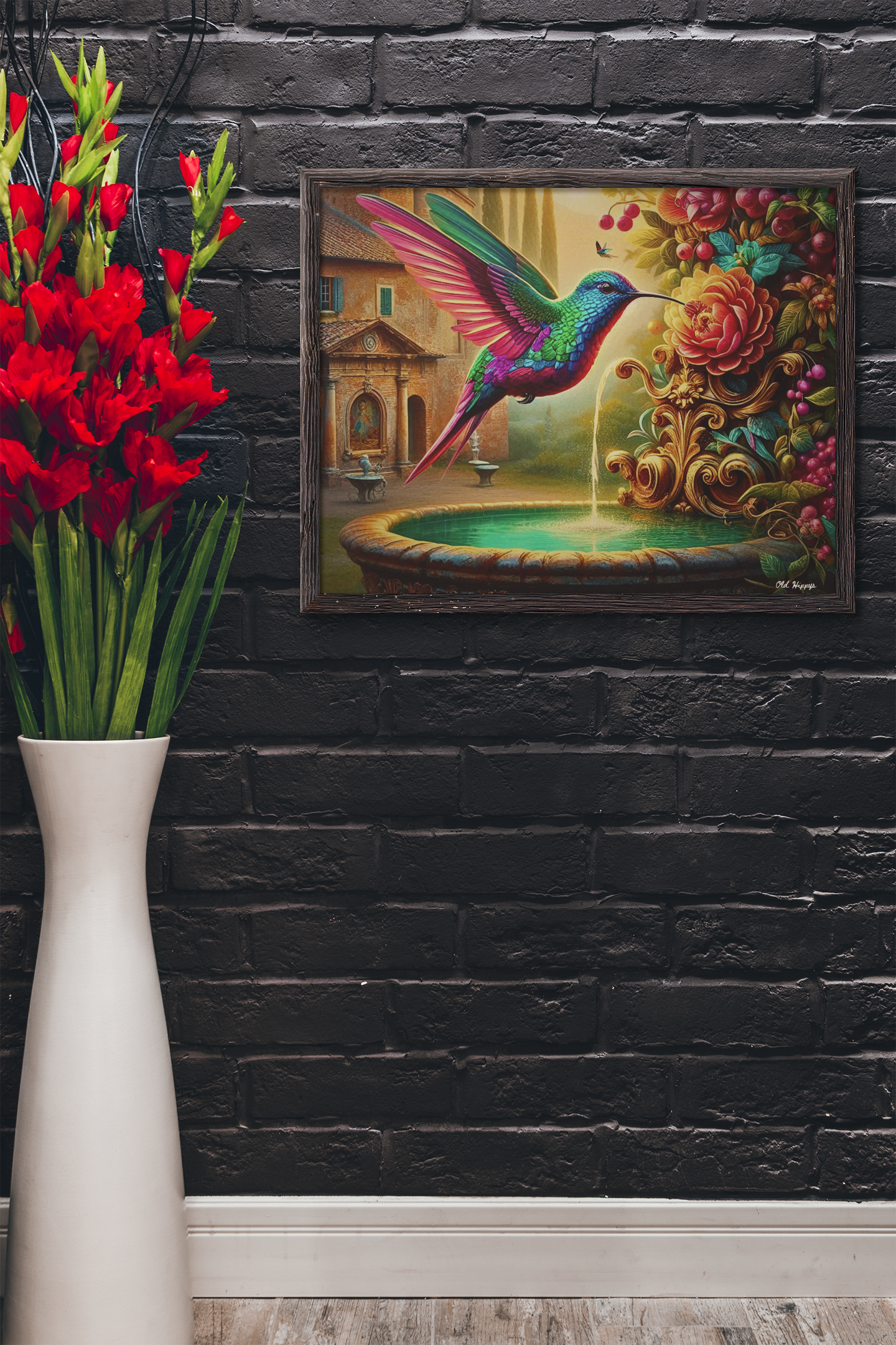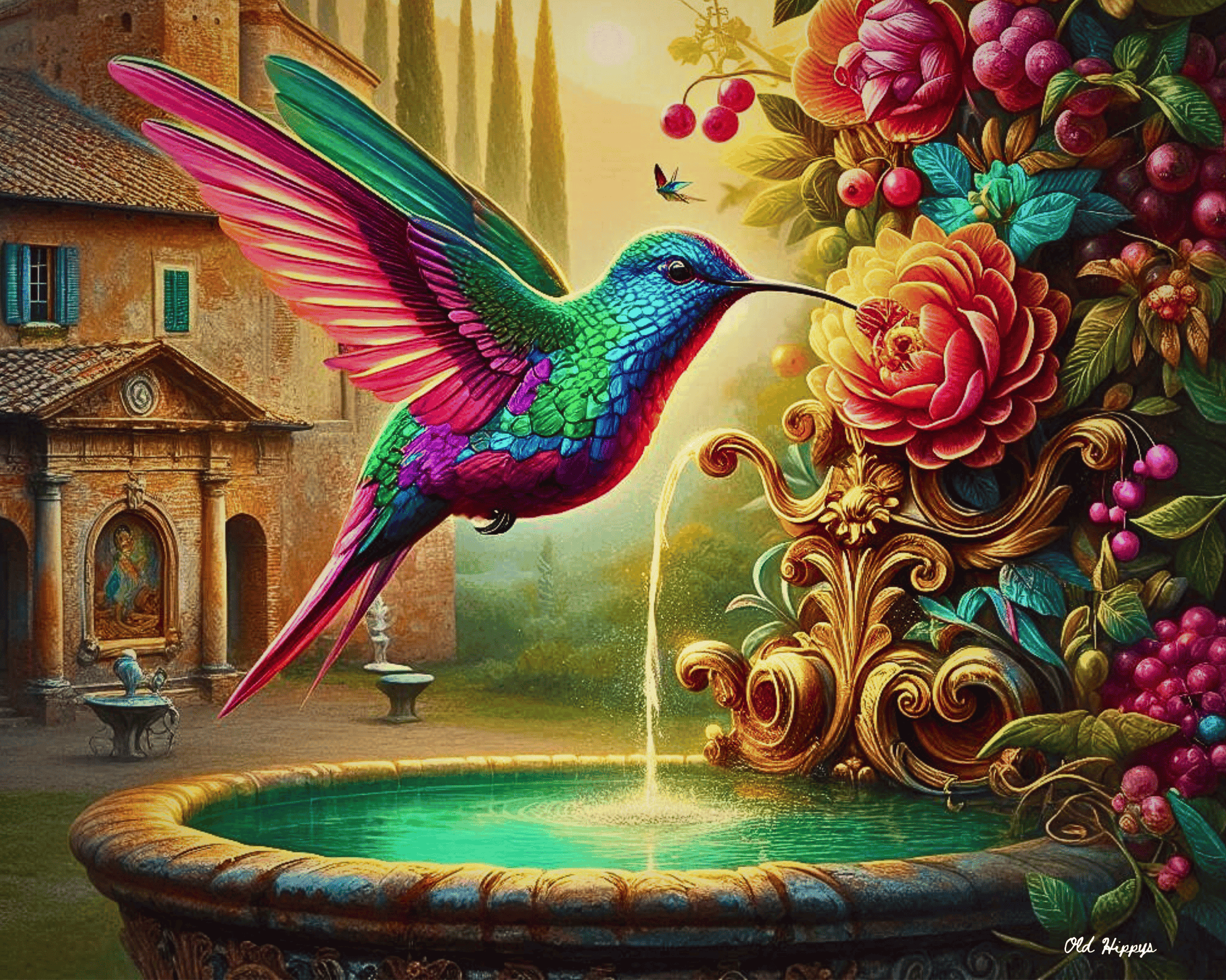 An image of a beautiful brightly colored hummingbird with a jewel sheen sipping from a flower. Nearby is an antique fountain. It is early in the morning and a Tuscan Villa is nearby