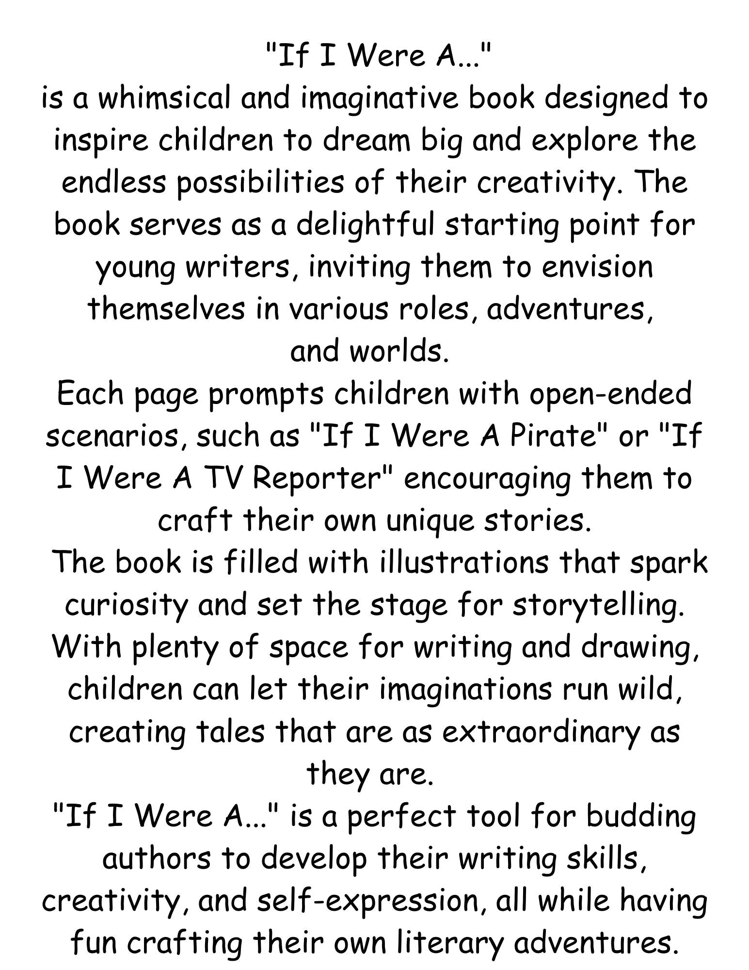 "If I Were A..." is a whimsical and imaginative book designed to inspire children to dream big and explore the endless possibilities of their creativity. The book serves as a delightful starting point for young writers, inviting them to envision themselves in various roles, adventures, and worlds. Each page prompts children with open-ended scenarios, such as "If I were a pirate" or "If I were a newspaper" encouraging them to craft their own unique stories. The book is filled with vibrant illustrations that spark curiosity and set the stage for storytelling. With plenty of space for writing and drawing, children can let their imaginations run wild, creating tales that are as extraordinary as they are. "If I Were A..." is a perfect tool for budding authors to develop their writing skills, creativity, and self-expression, all while having fun crafting their own literary adventures.
