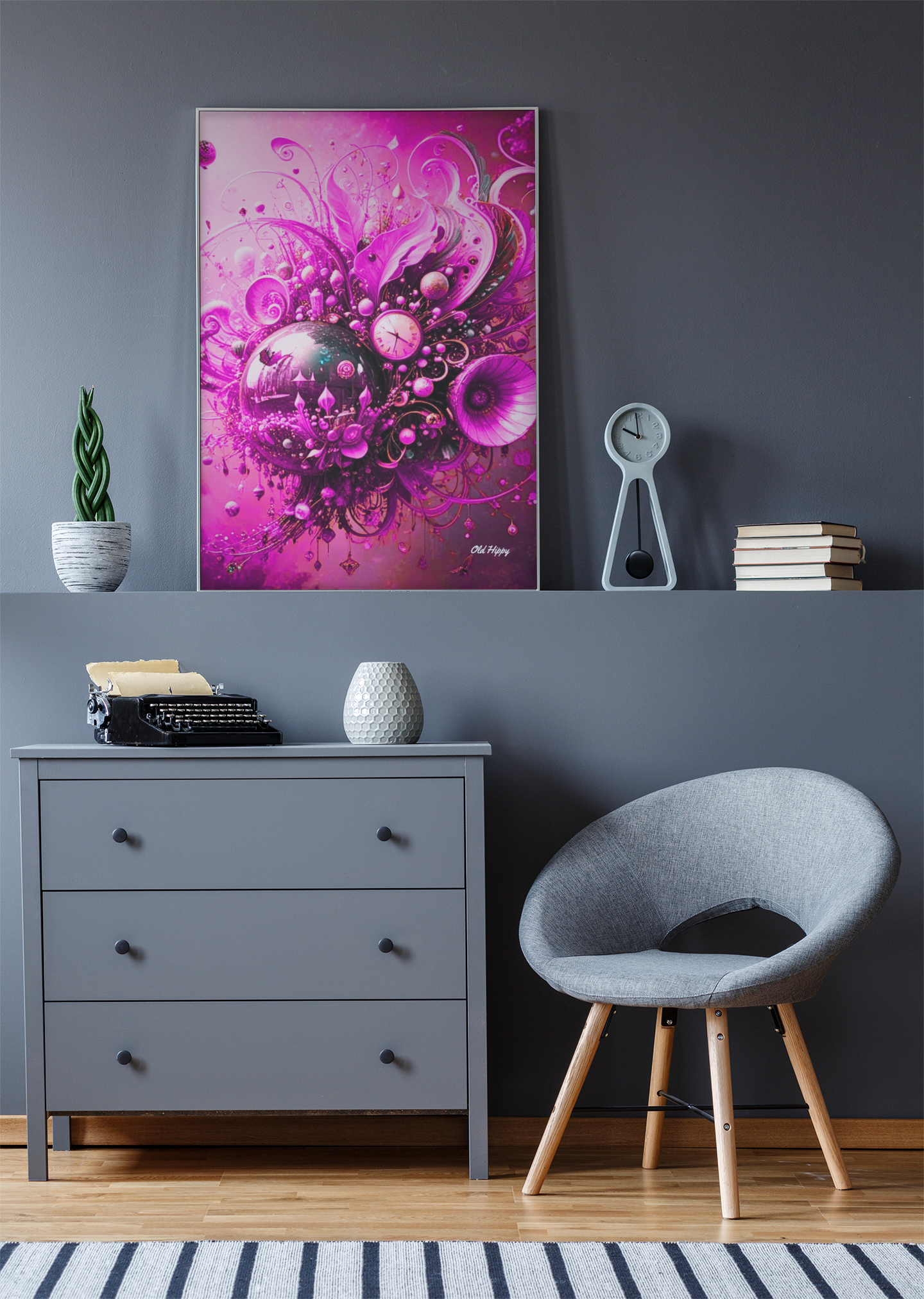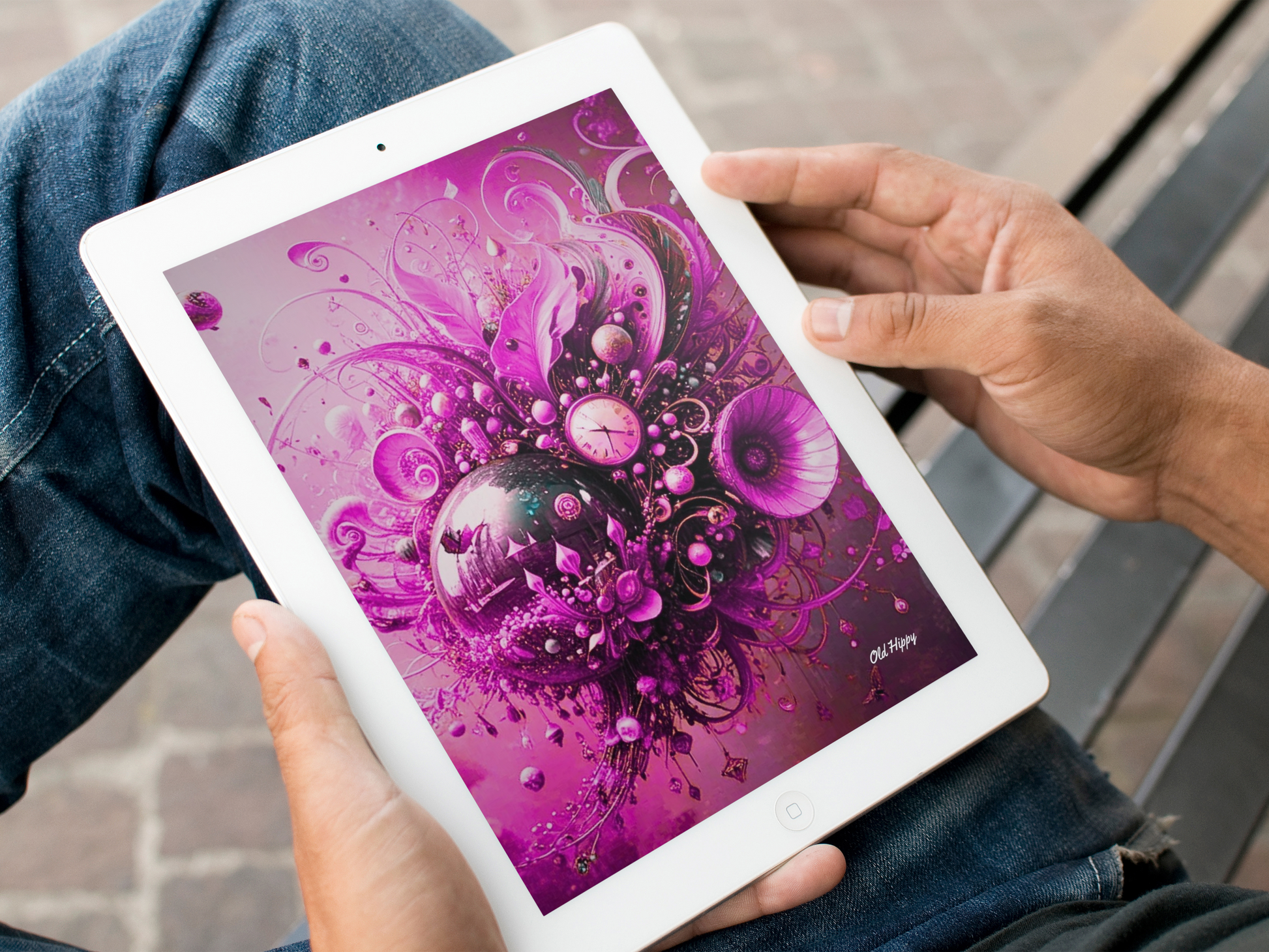 Step into a world where time spirals, petals whisper, and galaxies blossom in violet light. “Lavender Mechanica” is a mesmerizing AI-generated art piece by Old Hippy, exploding with surreal detail and cosmic elegance. At its heart lies a reflective orb capturing a distant fairytale scene, surrounded by dreamlike flora, floating gears, curling feathers, and a softly glowing timepiece.