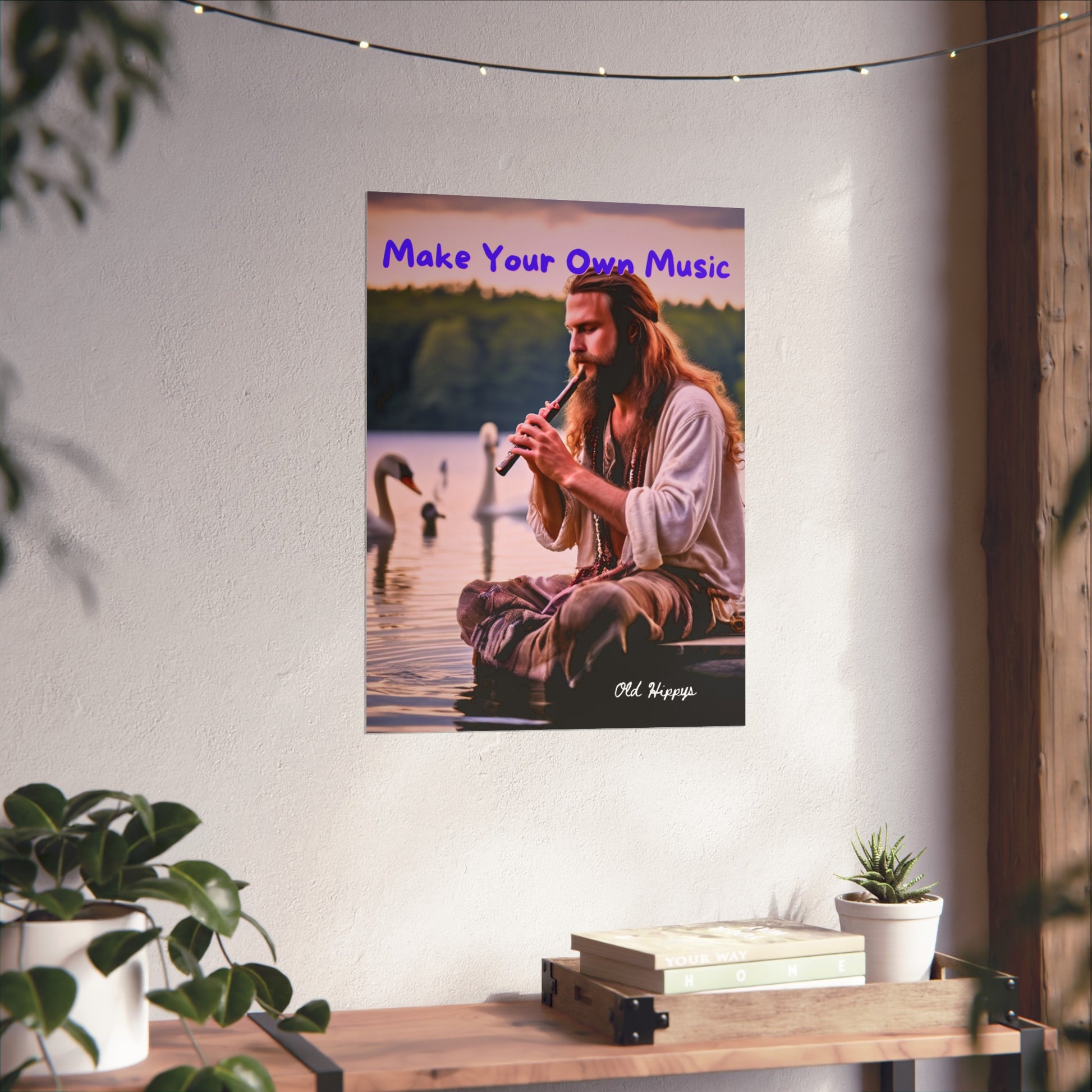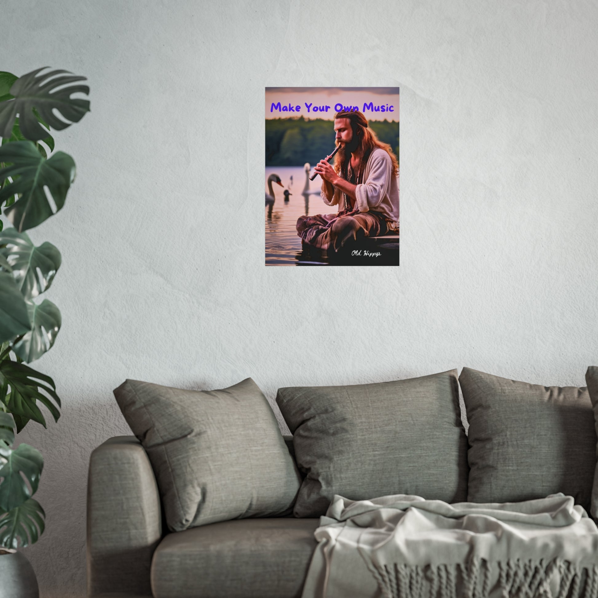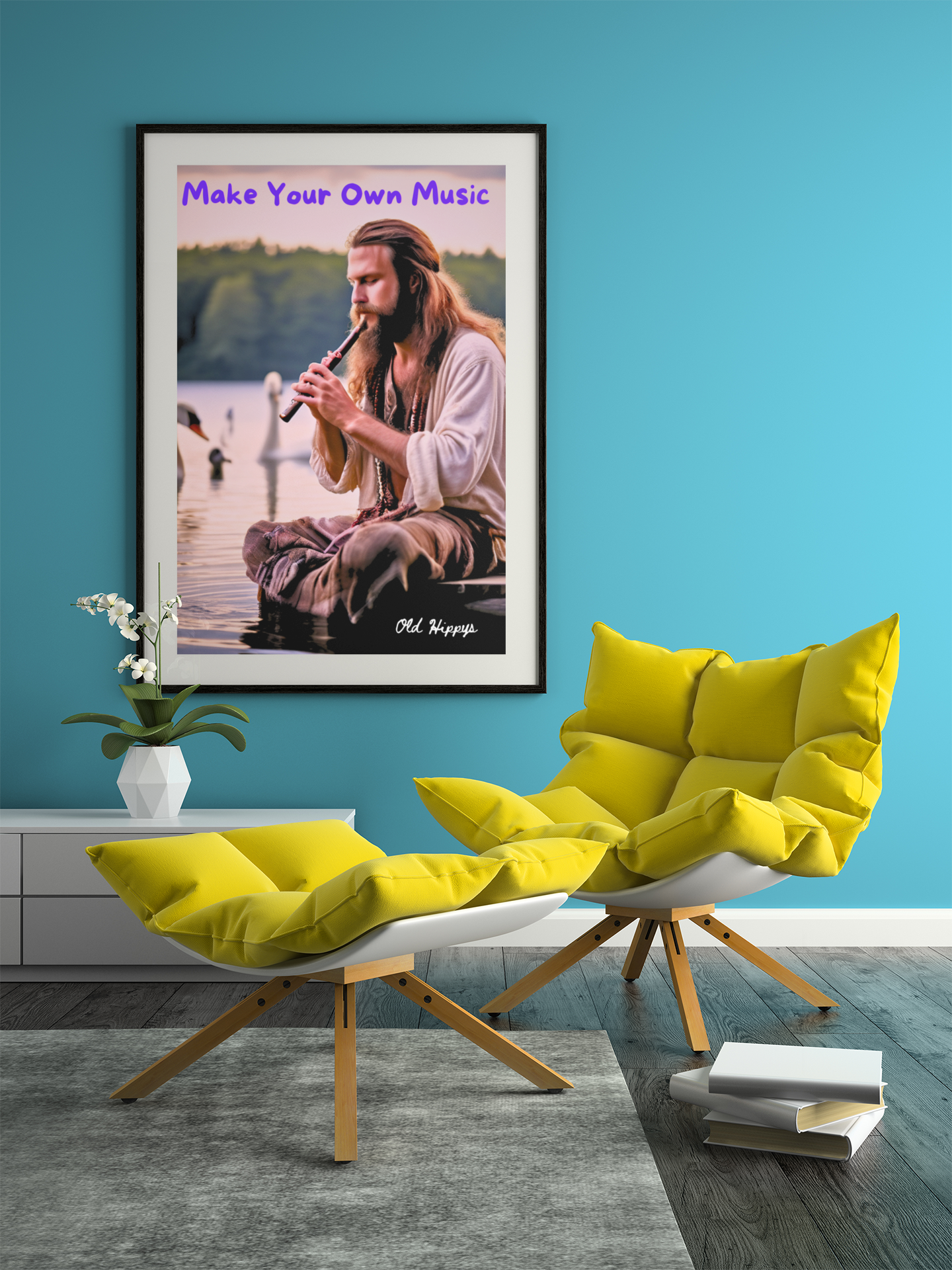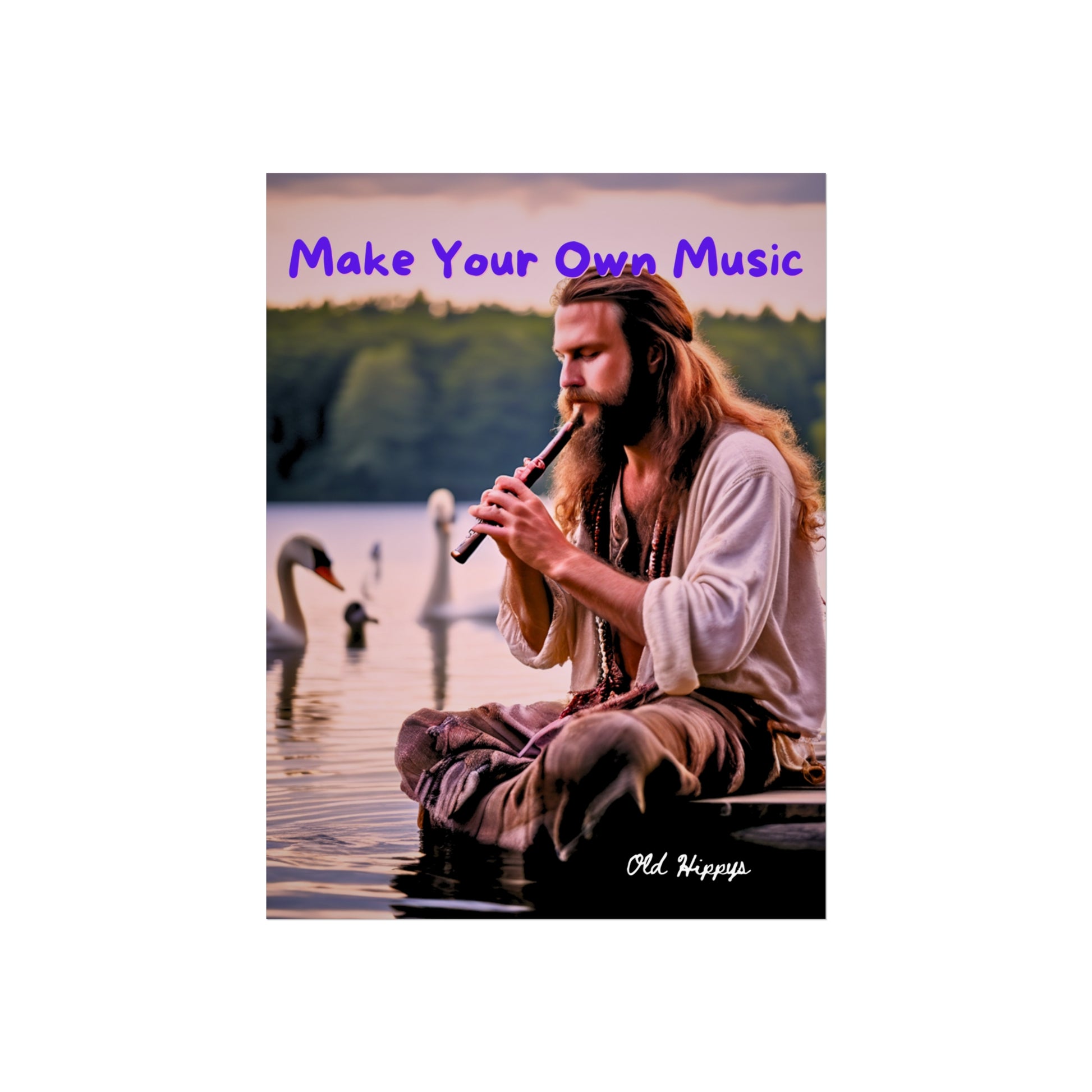 The image depicts a serene and tranquil scene at the dock of a calm lake. A young man with long, flowing hair, dressed in a loose, bohemian outfit typical of a hippie, sits cross-legged at the edge of the wooden dock. He is deeply engrossed in playing a wooden flute, his fingers deftly moving over the holes as he plays a melodious, self-composed tune.