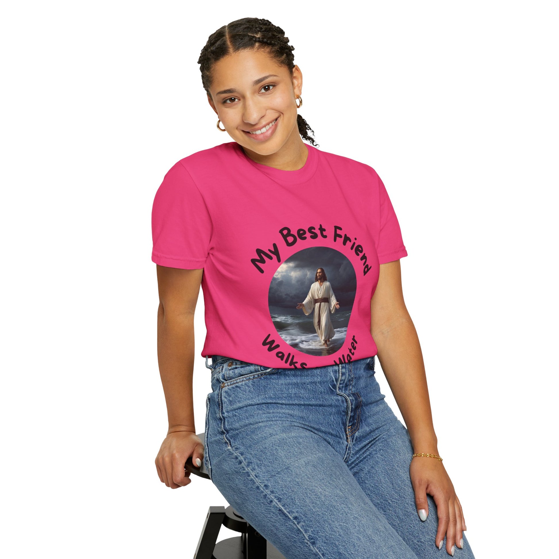 Walk in faith and confidence with this stunning Comfort Colors T-shirt featuring an image of Jesus walking on water. This design captures a powerful moment from Scripture in Matthew 14—when Christ meets us in the storm and calls us to trust Him by walking on water in faith. Set against a backdrop of stormy skies and crashing waves, Jesus stands serene and strong, a reminder that He is always in control.