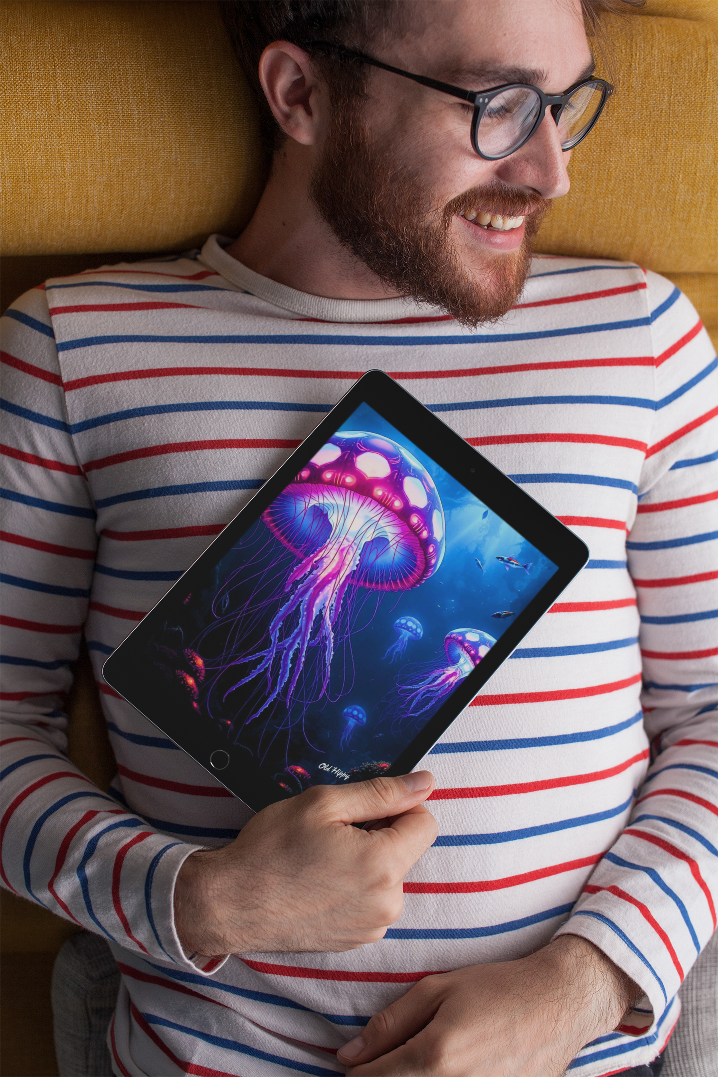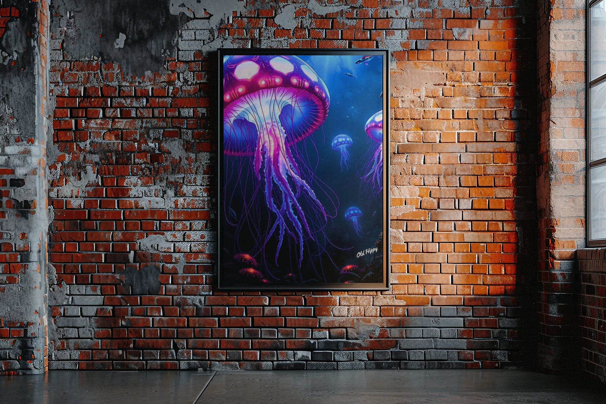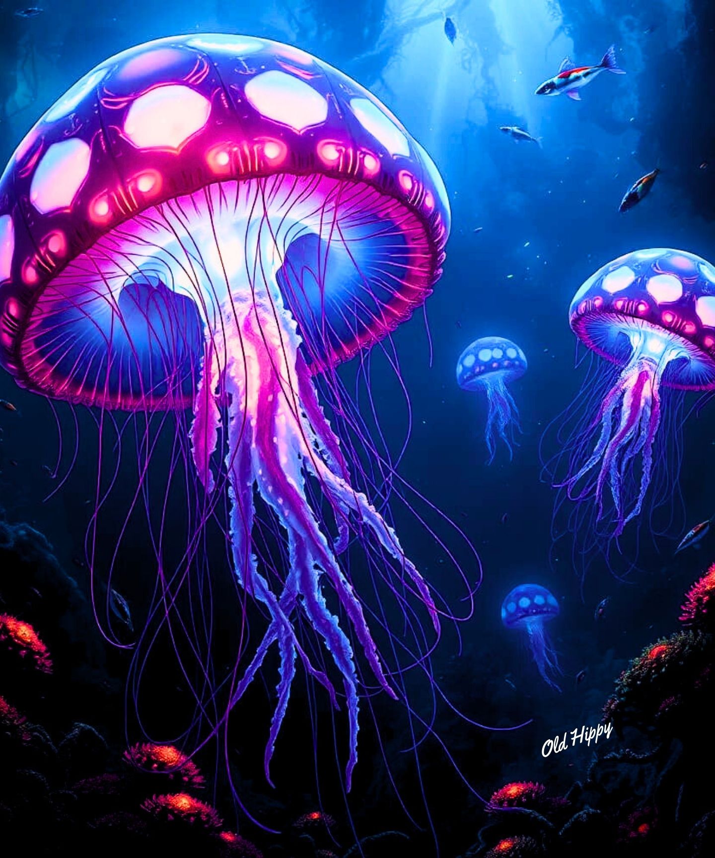Dive into a surreal underwater universe with "Neon Drifters of the Deep," a stunning AI-generated digital art piece by Old Hippy. This vibrant, high-resolution artwork captures the mesmerizing beauty of glowing jellyfish as they float gracefully through a radiant ocean abyss. With luminous pinks, purples, and electric blues illuminating the dark sea, the piece evokes wonder, peace, and a touch of the psychedelic.