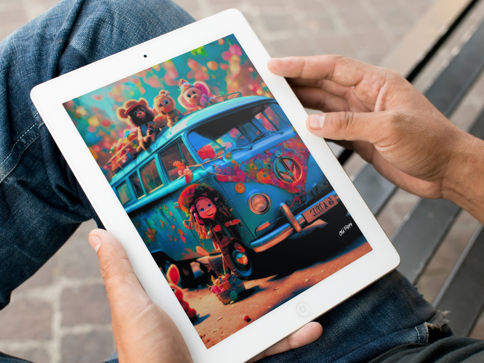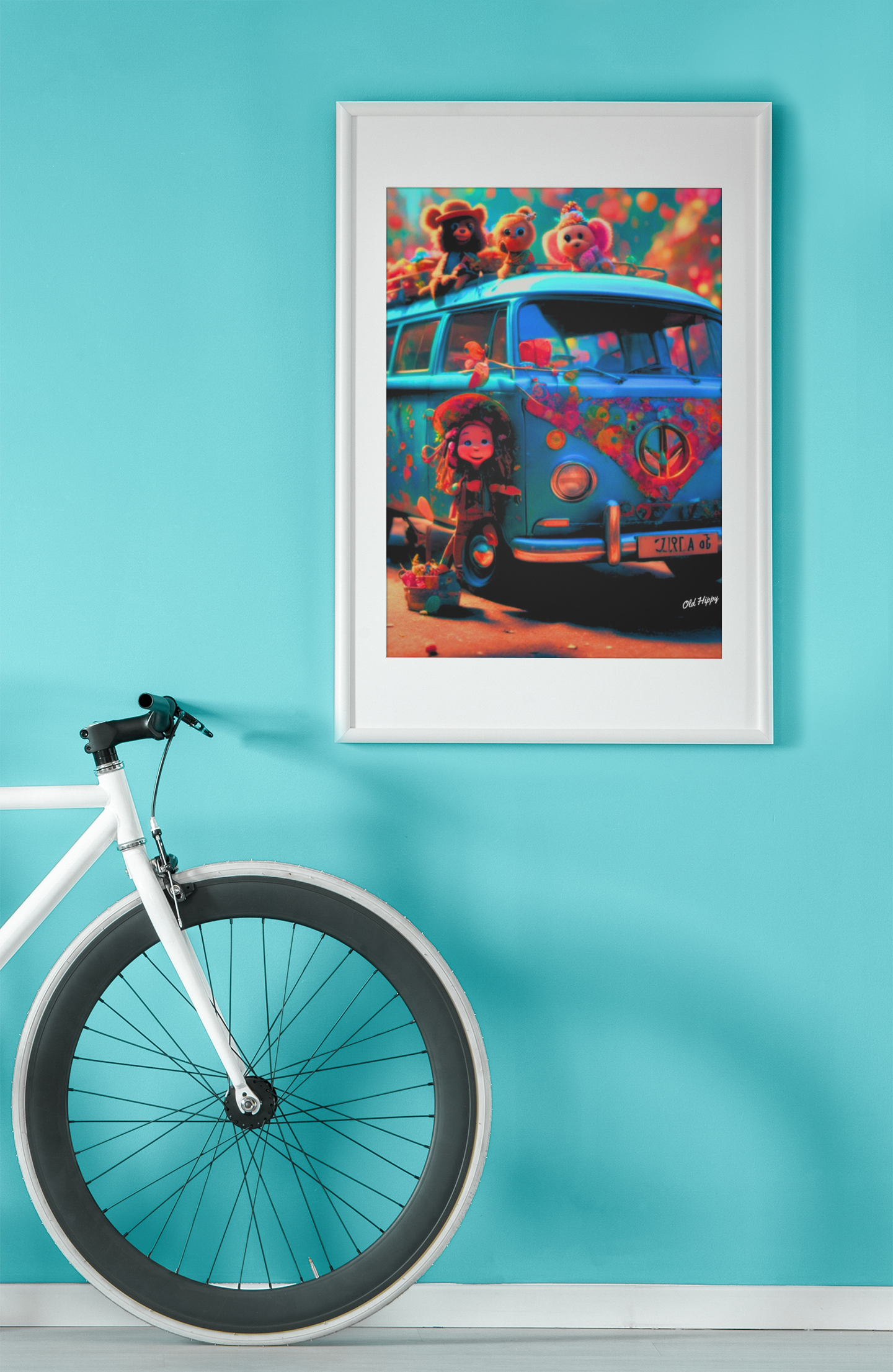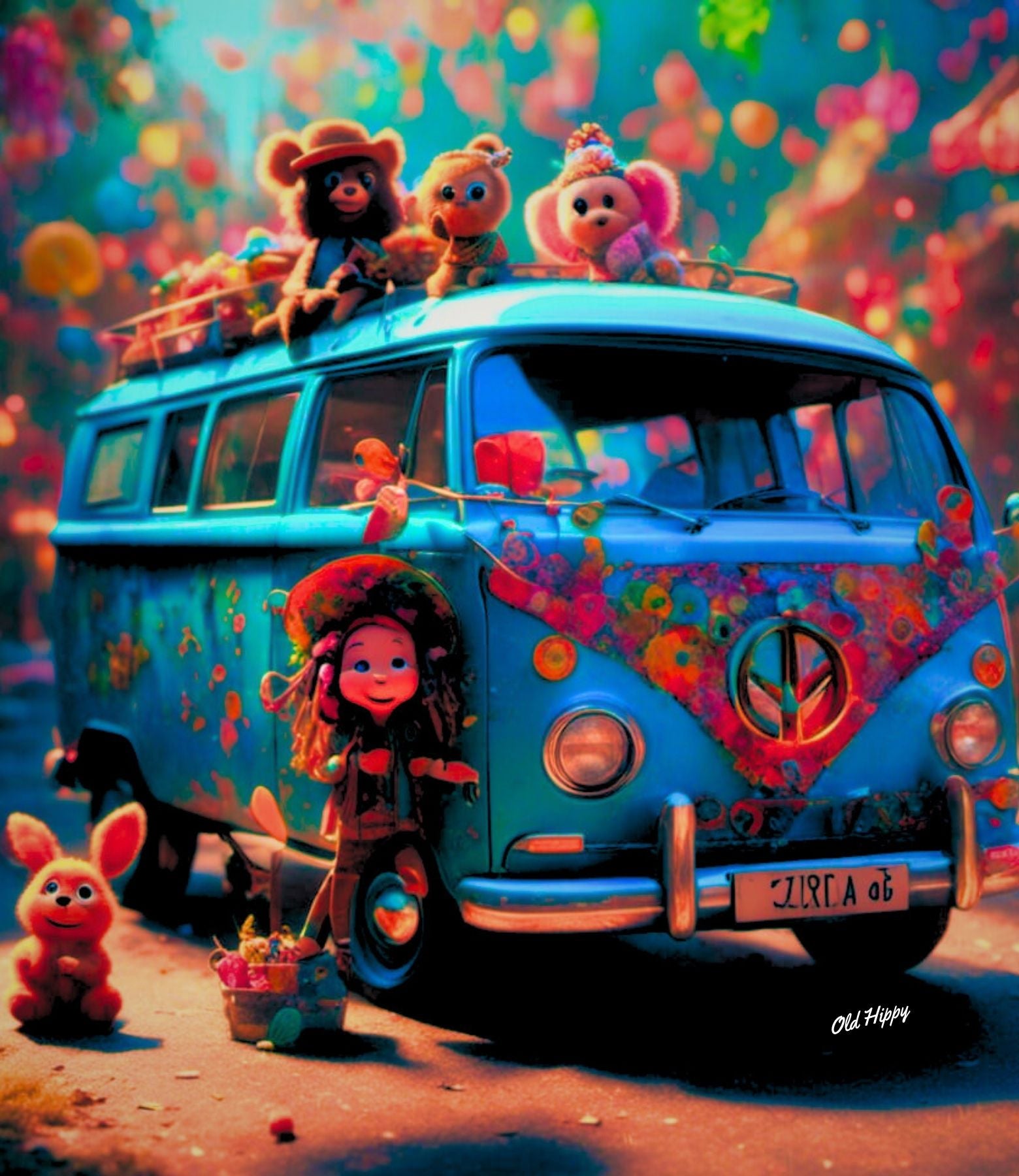 Bring joy and nostalgia into your space with this vibrant digital download, Peace, Love, and Plushies.” This AI-generated artwork captures a whimsical moment where a flower-powered hippie van rolls down a colorful, lantern-lit street. A cheerful girl in boho attire is surrounded by adorable animal friends, plush companions, and festive details that evoke peace, love, and playful adventure.