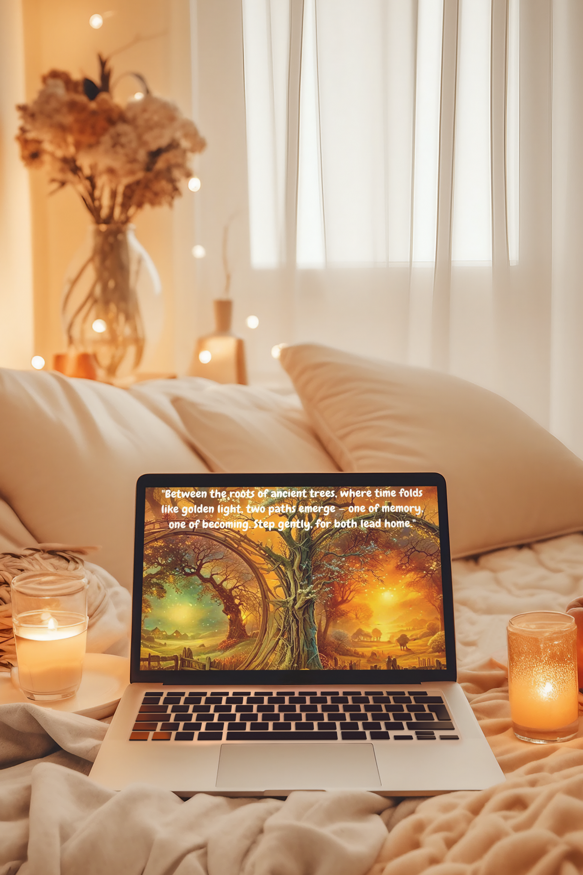 In a forest where the trees have grown wise with time, two circular gateways rise from the earth like ancient eyes — one glowing with the soft light of memory, the other ablaze with the fire of becoming. Each path unfolds beneath golden skies, framed by twisted trunks and blossoms caught in eternal bloom.