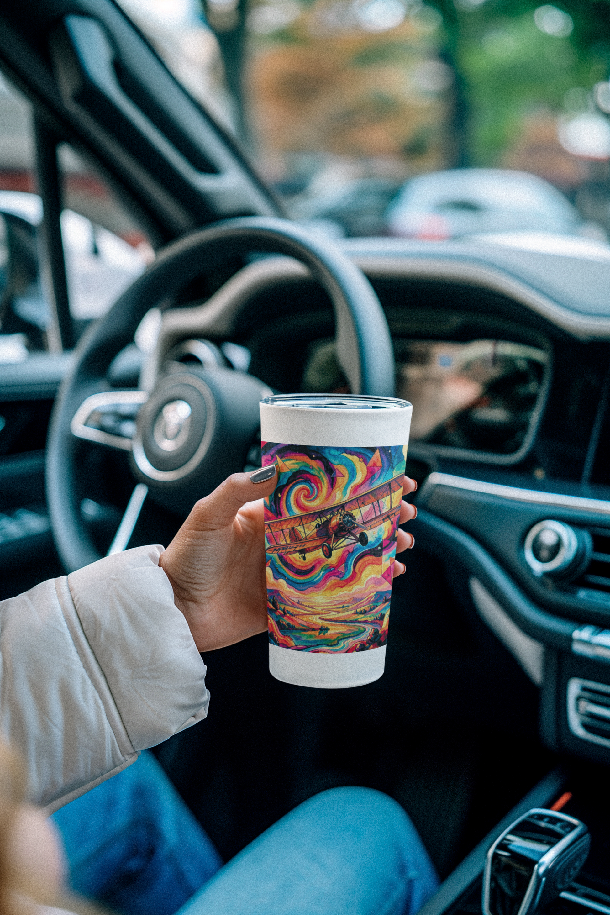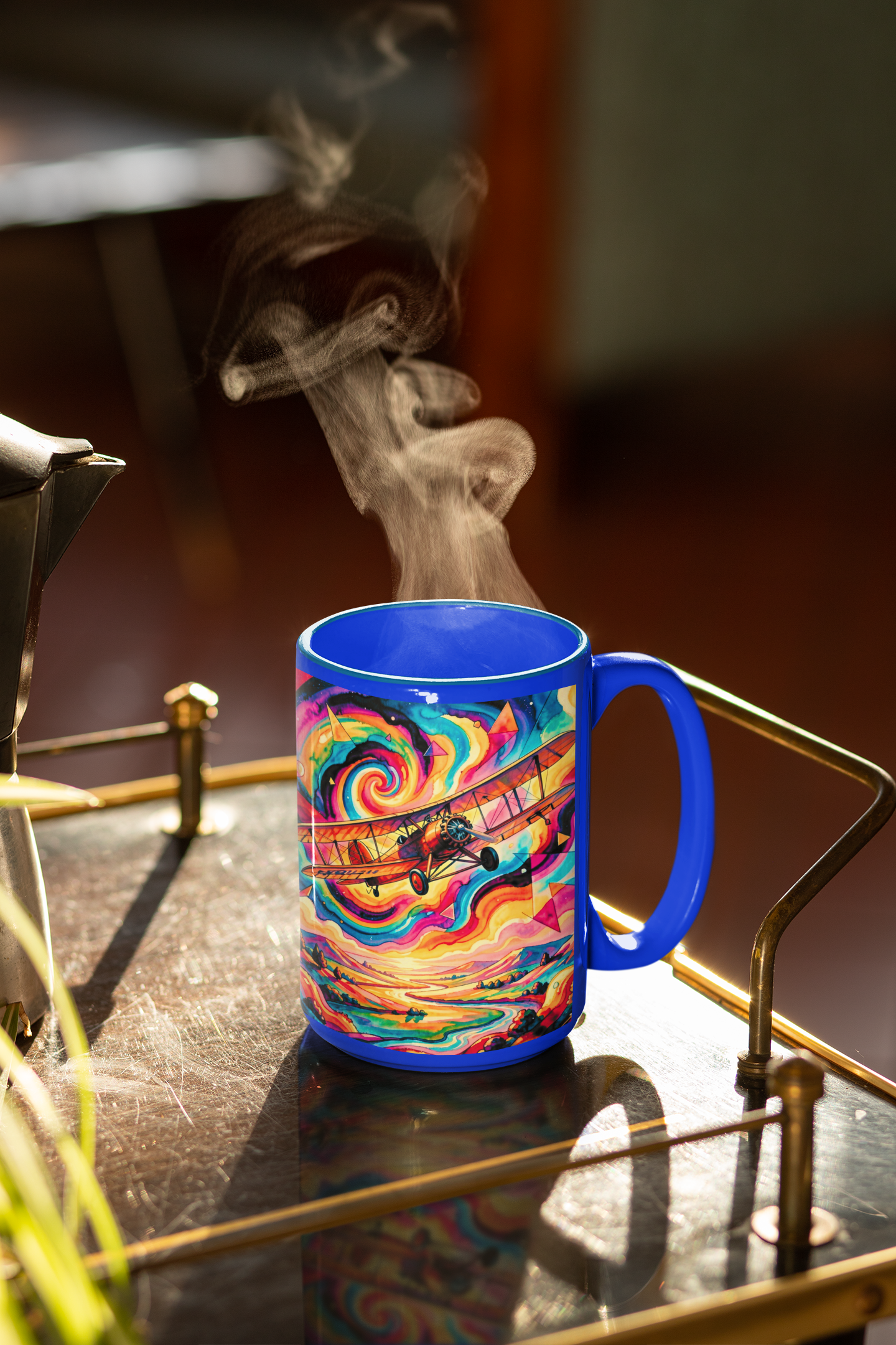 A vintage biplane soars across a sky bursting with color, swirling galaxies, and geometric shapes in a dazzling display of psychedelic energy. Beneath the aircraft, a winding river flows through a vibrant dreamlike landscape, creating a sense of motion, exploration, and boundless imagination.