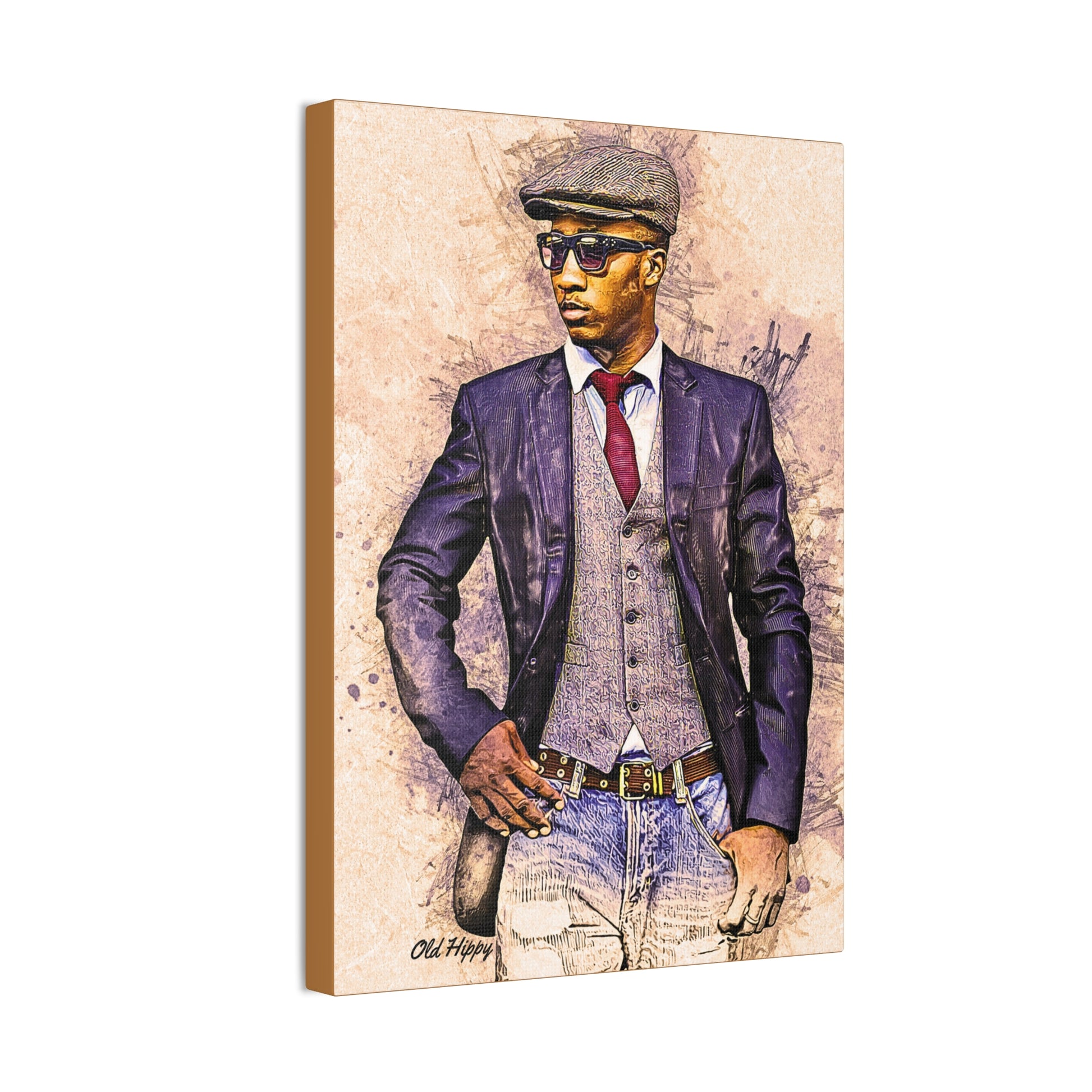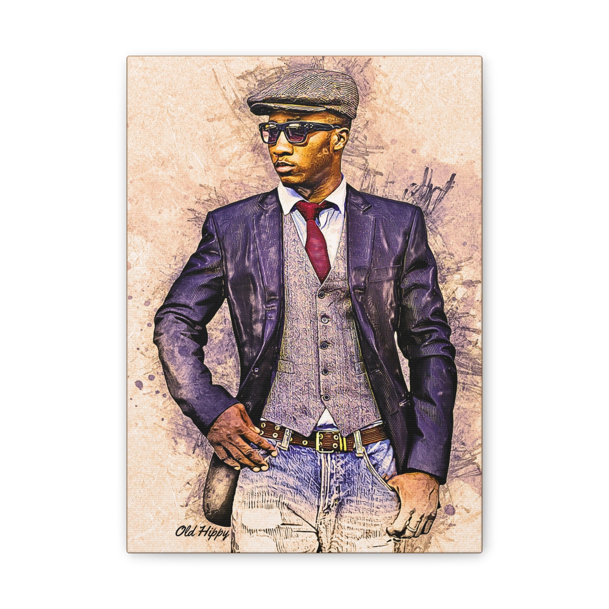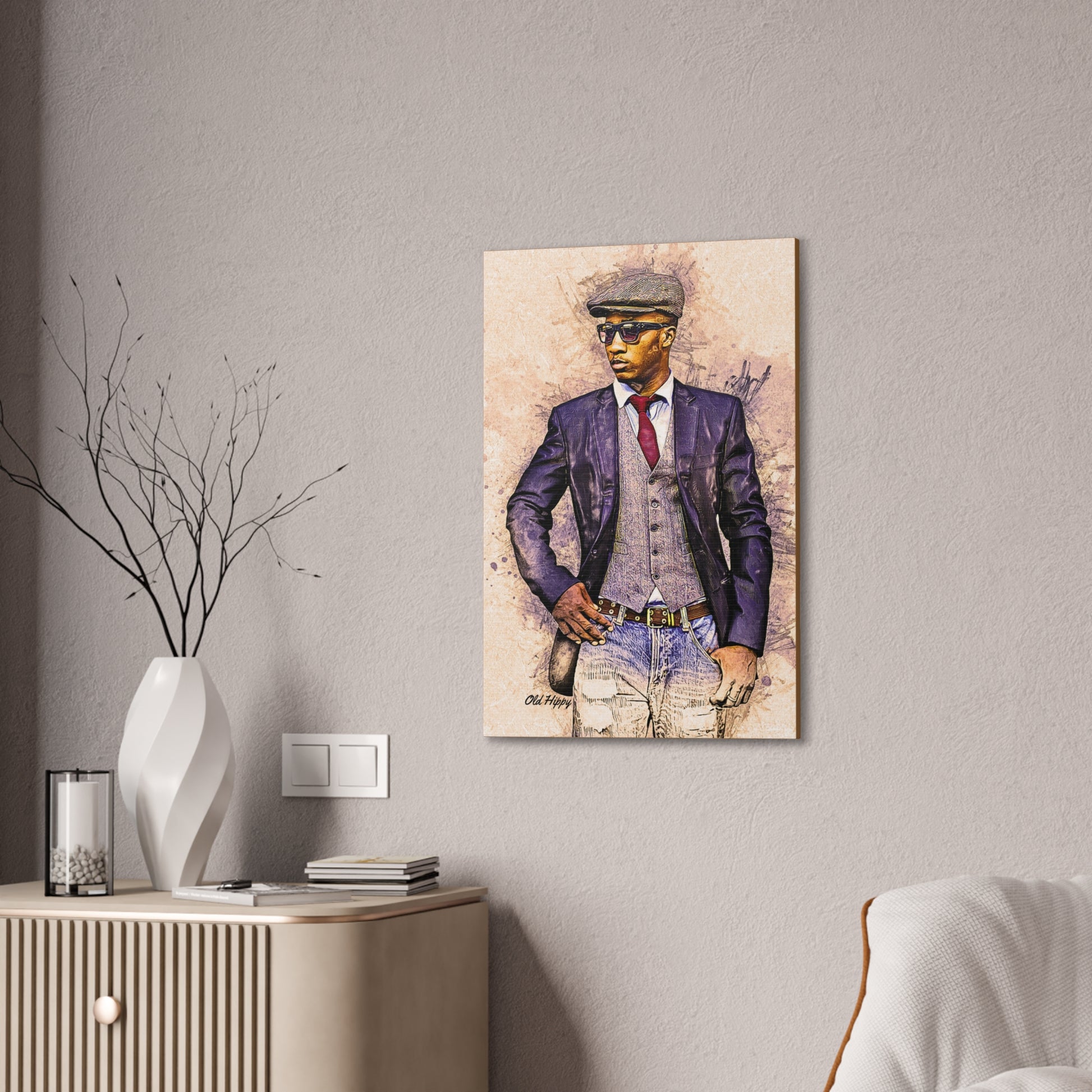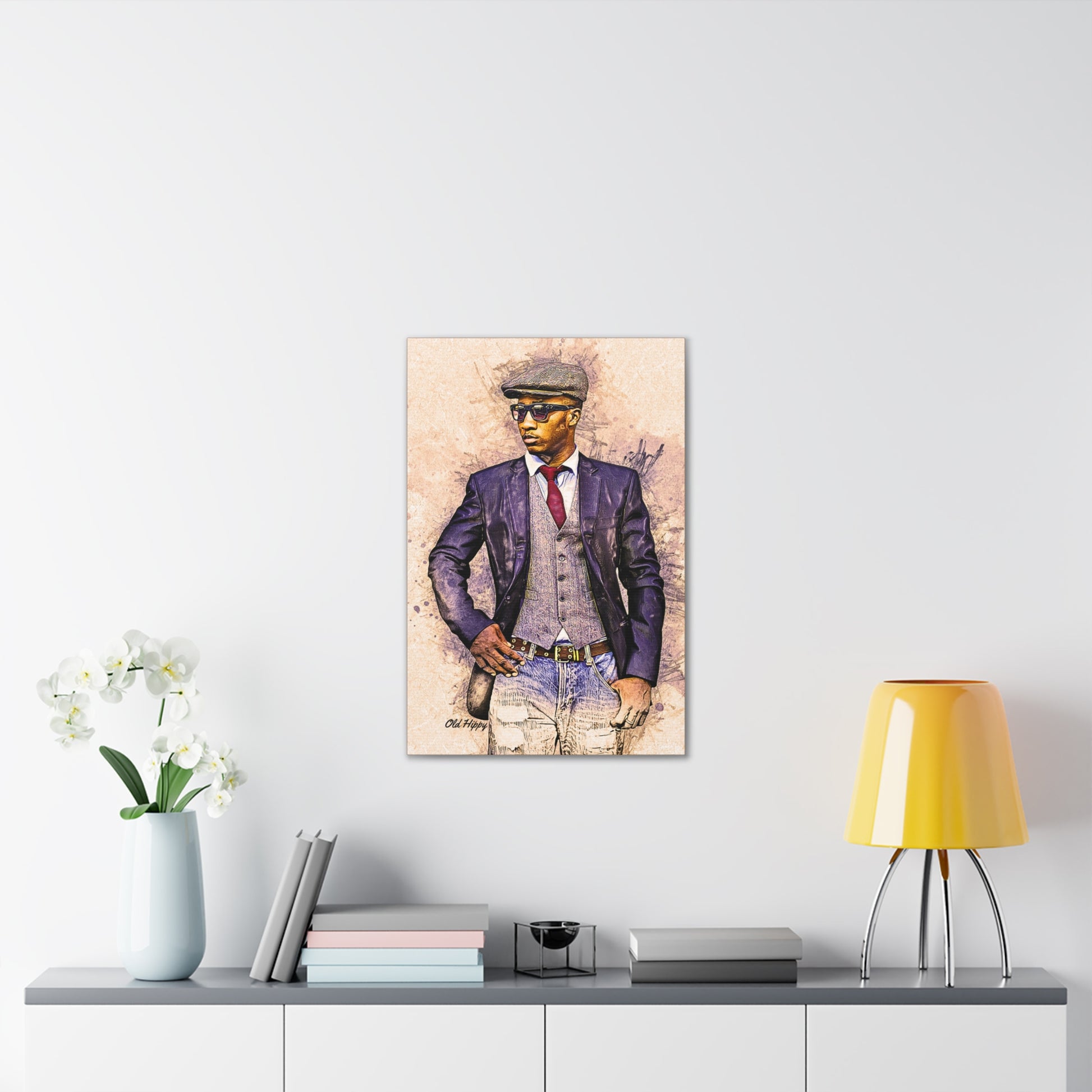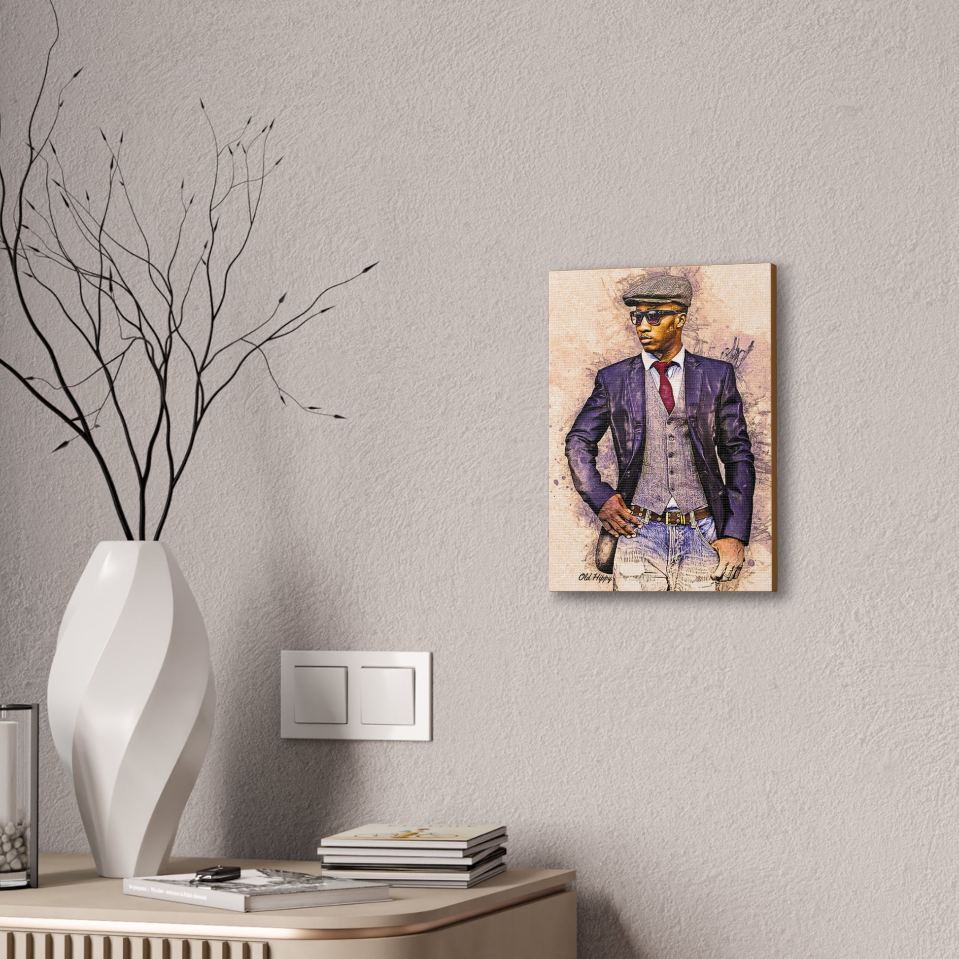 Command the room without saying a word. "Quiet Confidence" captures the essence of modern masculinity and effortless cool in this striking canvas art. Featuring a sharply dressed man in a tailored vest, leather jacket, flat cap, and sunglasses, the composition merges urban edge with vintage flair. With his hand resting on his belt and his gaze set in quiet determination, he radiates self-assurance and style.