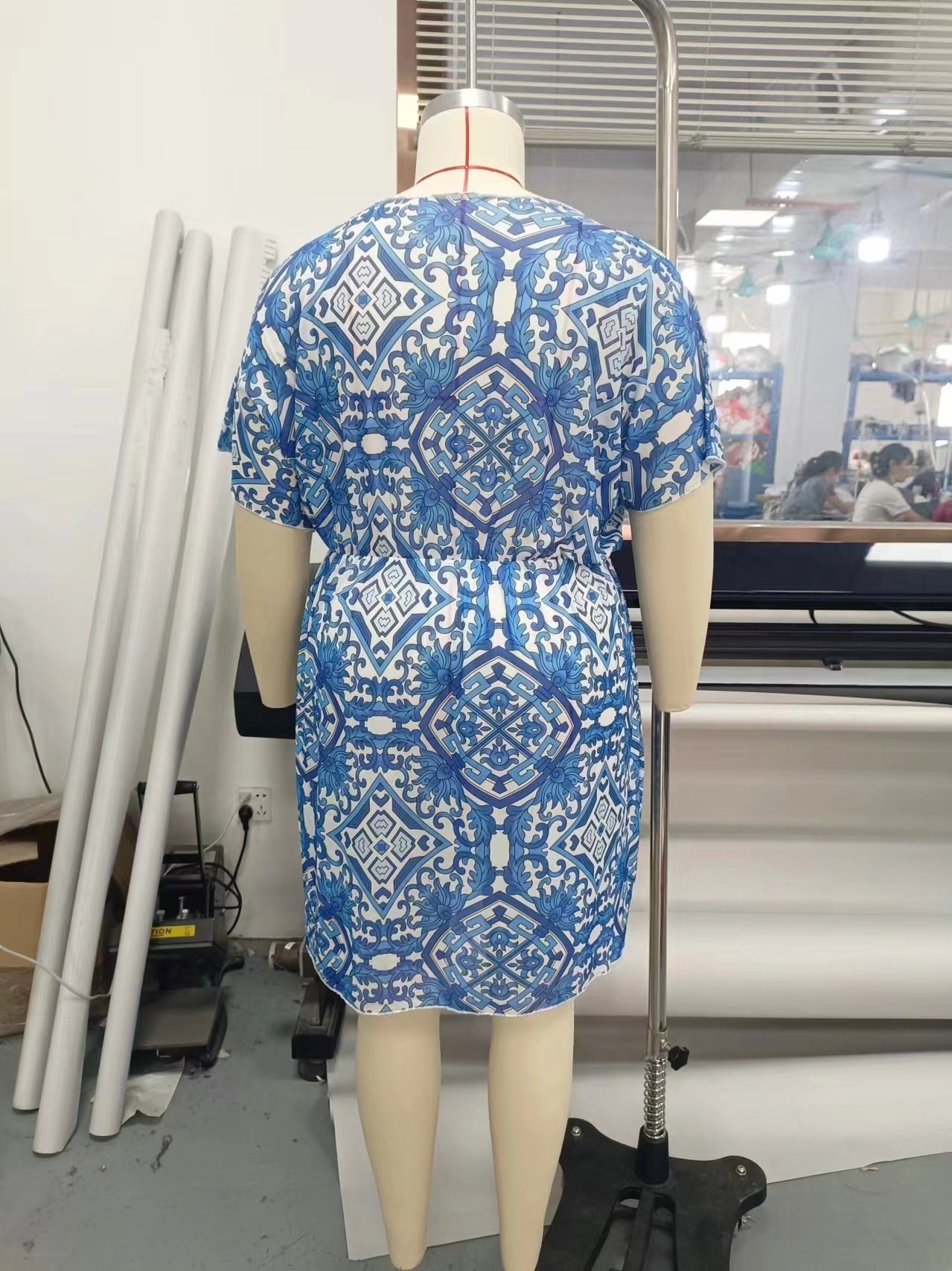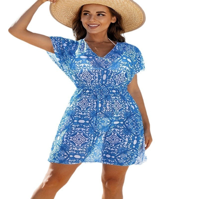 Bring effortless elegance to your beachside look with this Blue Printed Beach Cover-Up Dress, crafted from soft, breathable polyester for all-day comfort in the sun. Featuring a vibrant Mediterranean-inspired print, a flattering V-neckline, and a cinched waist for a breezy, feminine silhouette, this piece is the perfect blend of style and function.