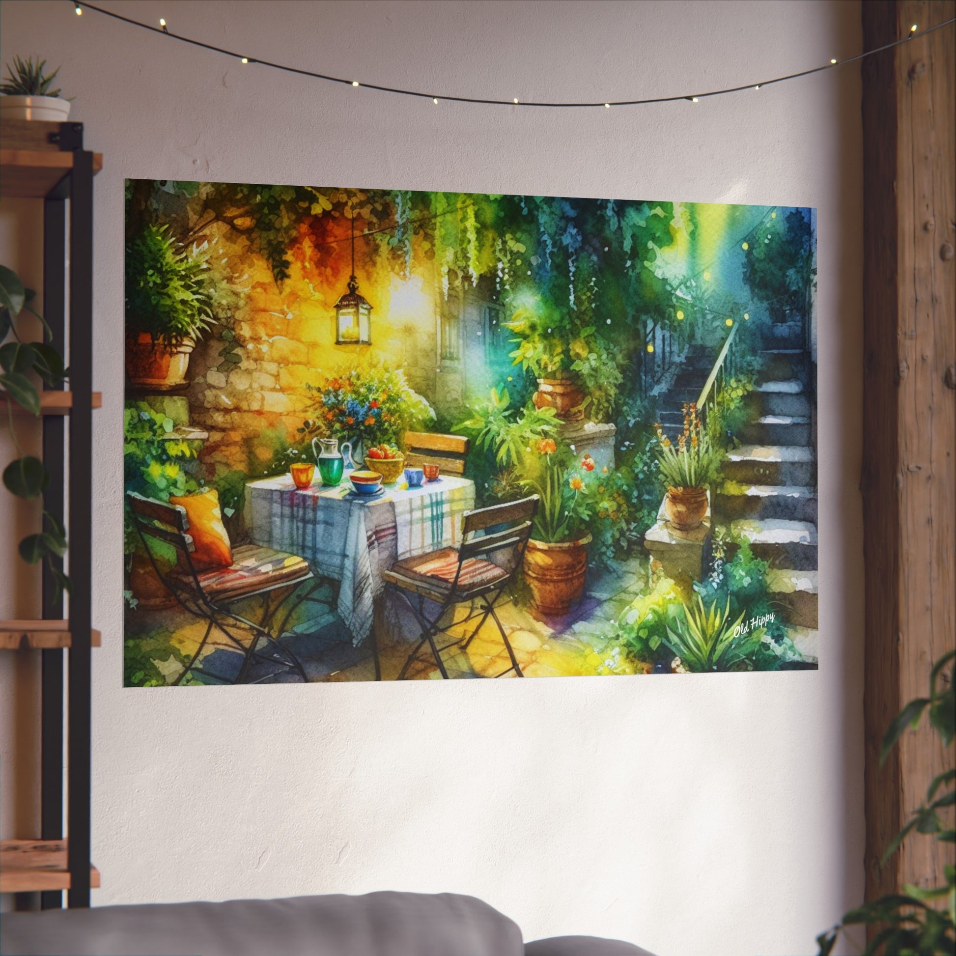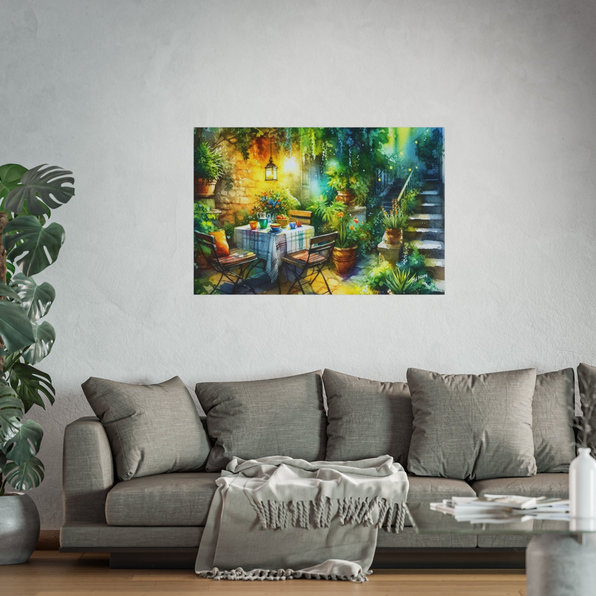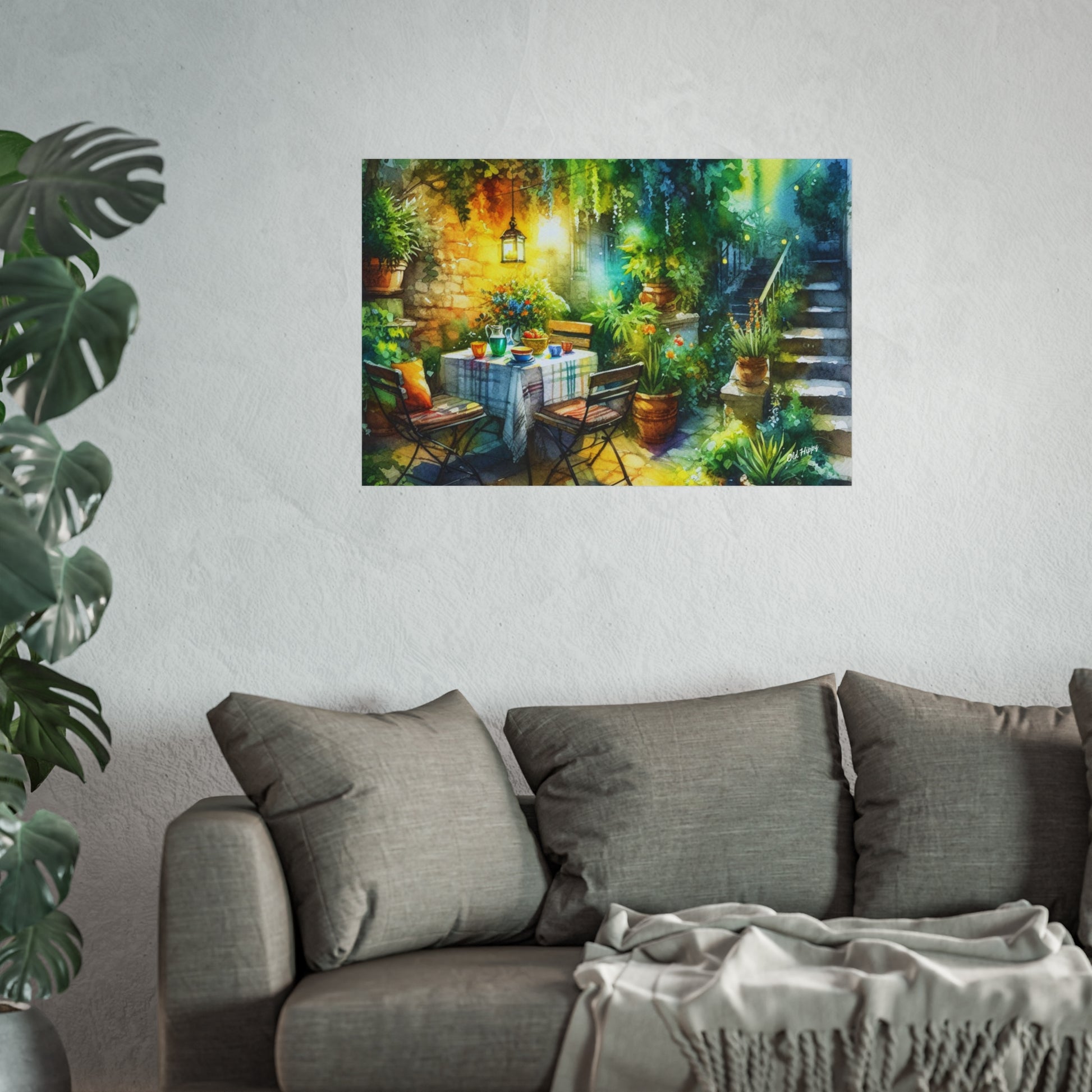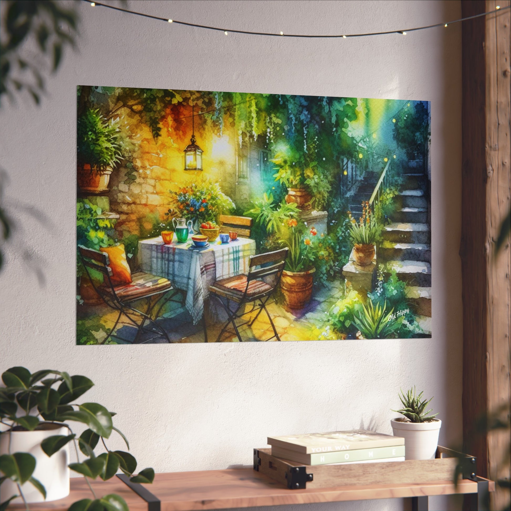 Bring the warmth of a Mediterranean morning into your home with “Serene Garden #2” a fine art Giclée print created by AI artist Old Hippy. This enchanting piece captures the tranquil beauty of a garden courtyard bathed in golden sunlight, with rustic stone walls, lush greenery, and a cozy table set for a peaceful morning gathering.
