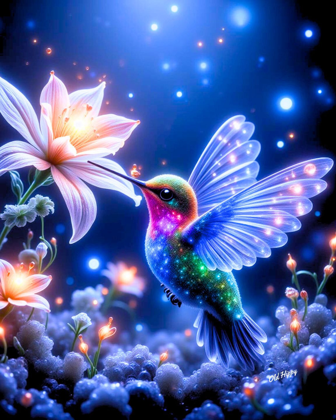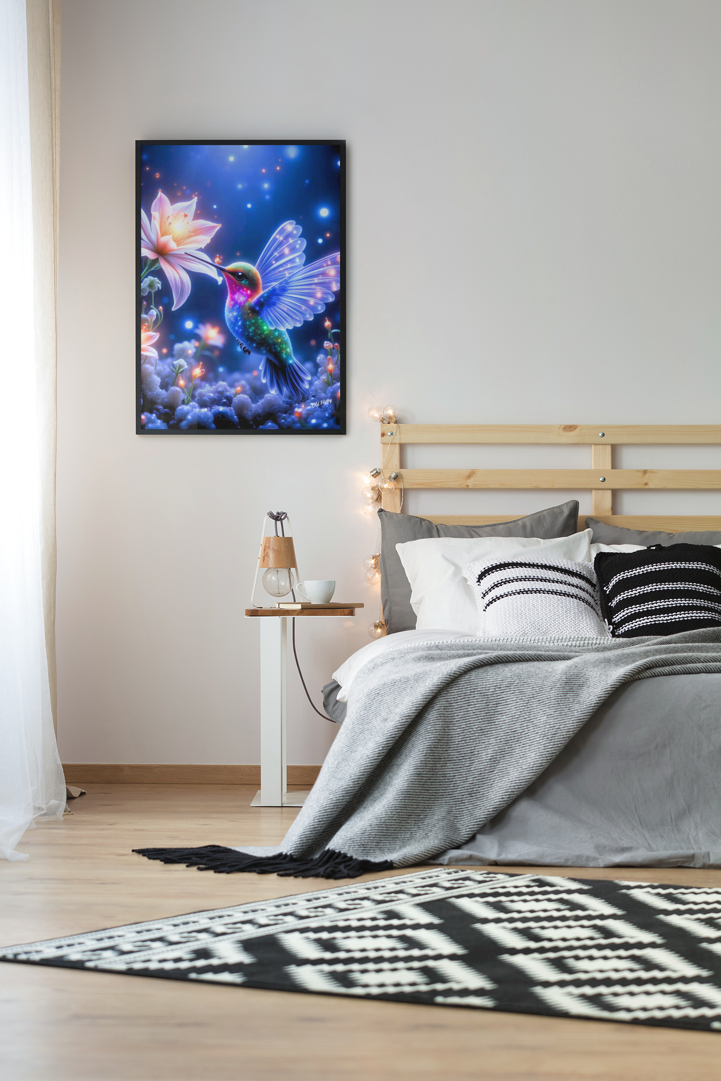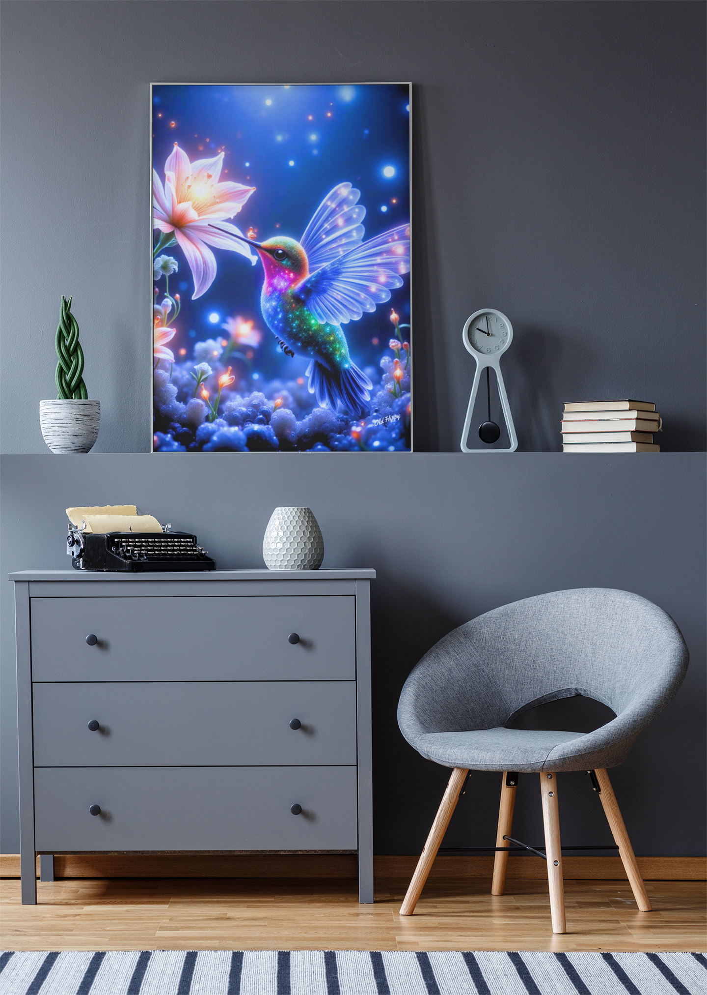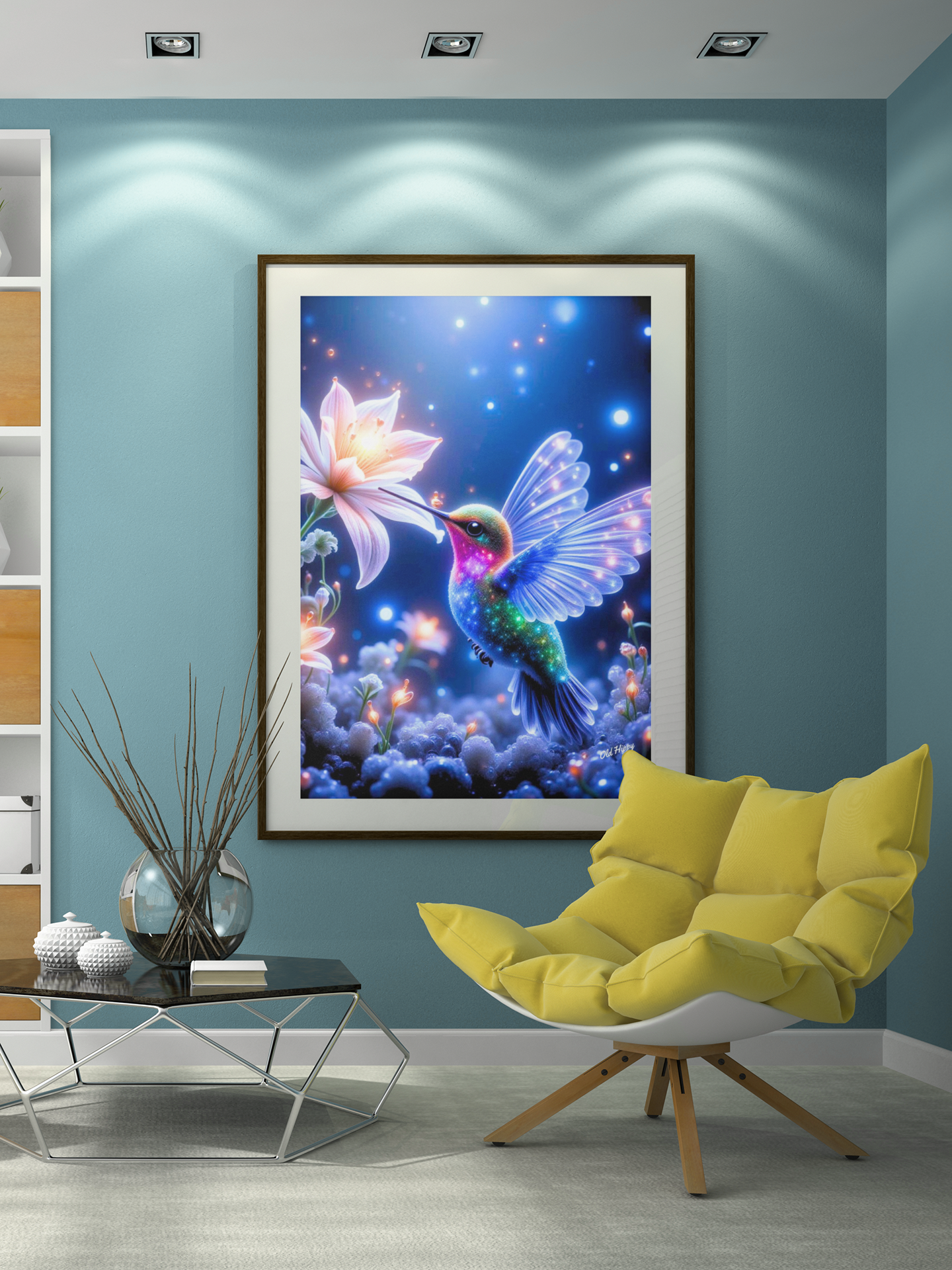 Step into a dreamlike realm where light dances in color and nature reveals its celestial soul. "Starlight Nectar" captures a radiant hummingbird mid-flight, sipping from a glowing bloom amidst a twilight garden brimming with ethereal wonder. Each feather shimmers like a galaxy, painting the sky with iridescent hues of violet, emerald, and sapphire.