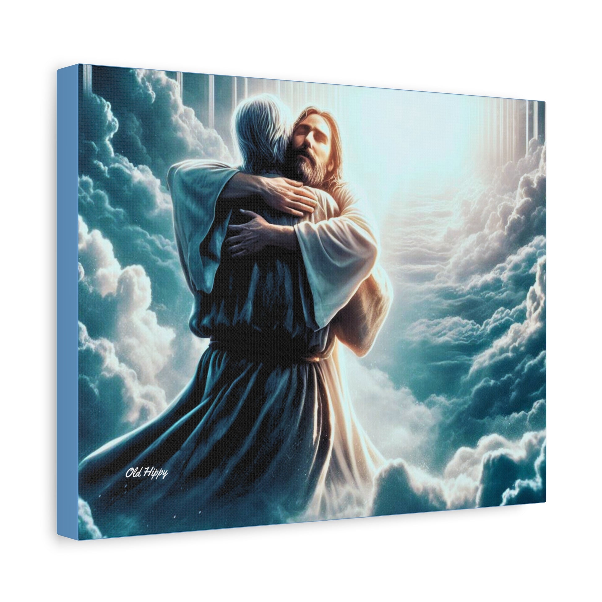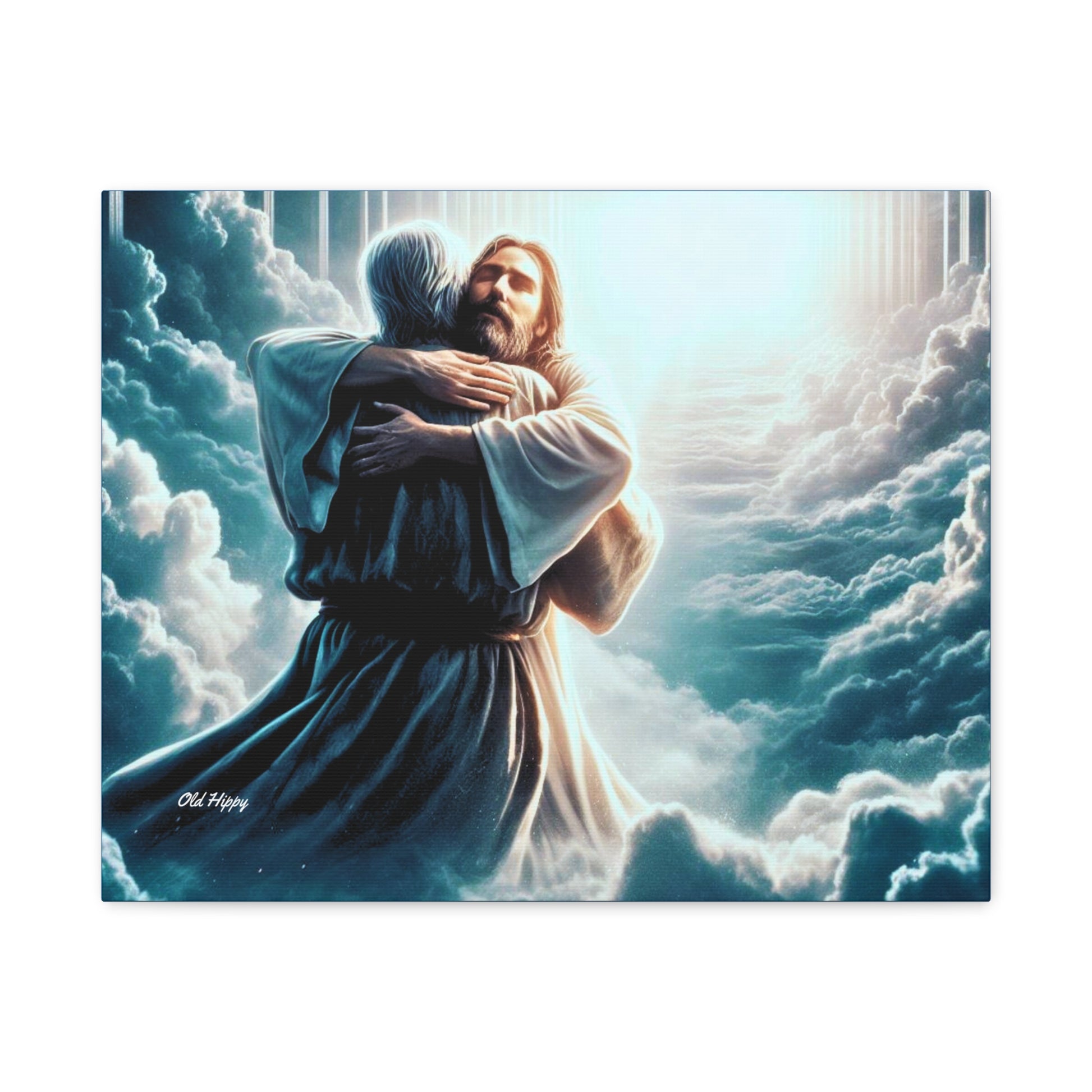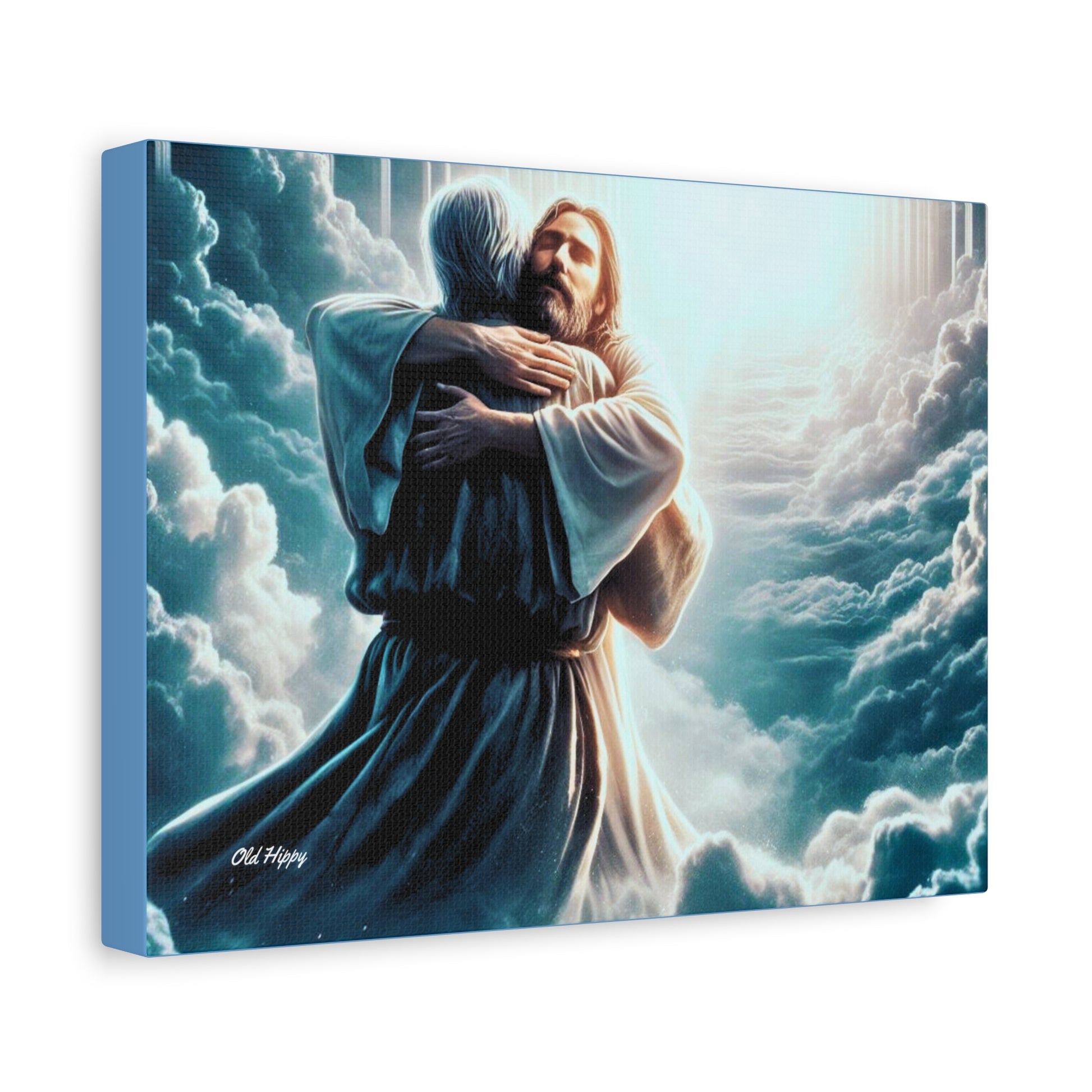 Experience the joy, peace, and hope of eternity with “Welcome Home,” a moving AI-generated canvas artwork by Old Hippy. This powerful image depicts a soul embraced by Jesus in a radiant heavenly scene—surrounded by clouds, glowing light, and the promise of everlasting peace. The embrace speaks volumes: redemption, reunion, and the fulfillment of every promise.