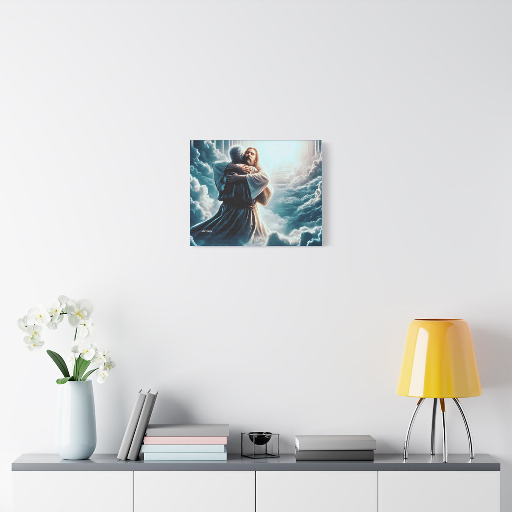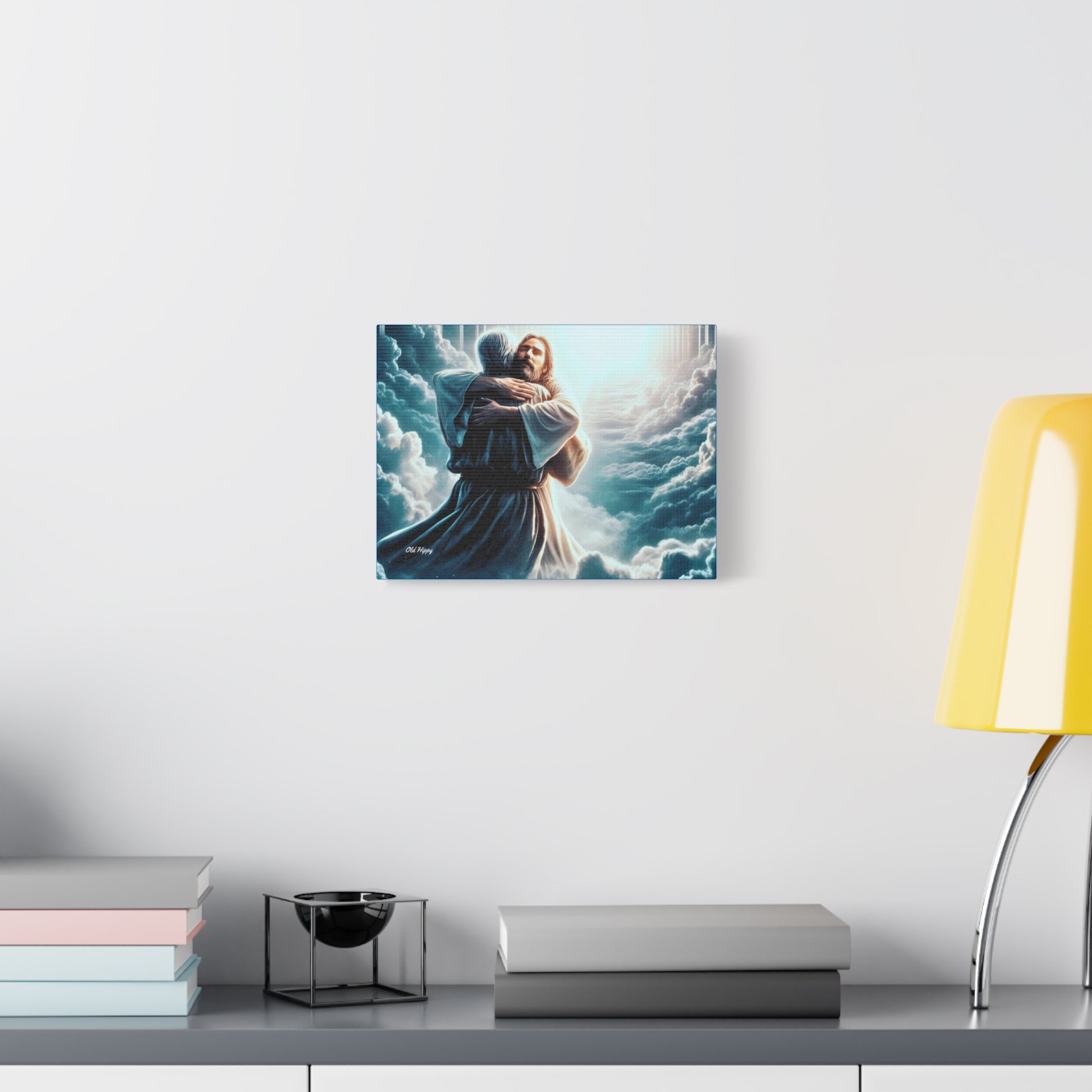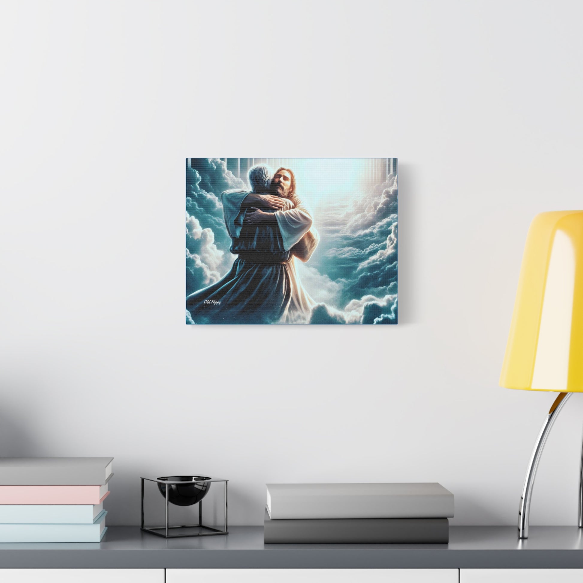 Experience the joy, peace, and hope of eternity with “Welcome Home,” a moving AI-generated canvas artwork by Old Hippy. This powerful image depicts a soul embraced by Jesus in a radiant heavenly scene—surrounded by clouds, glowing light, and the promise of everlasting peace. The embrace speaks volumes: redemption, reunion, and the fulfillment of every promise.