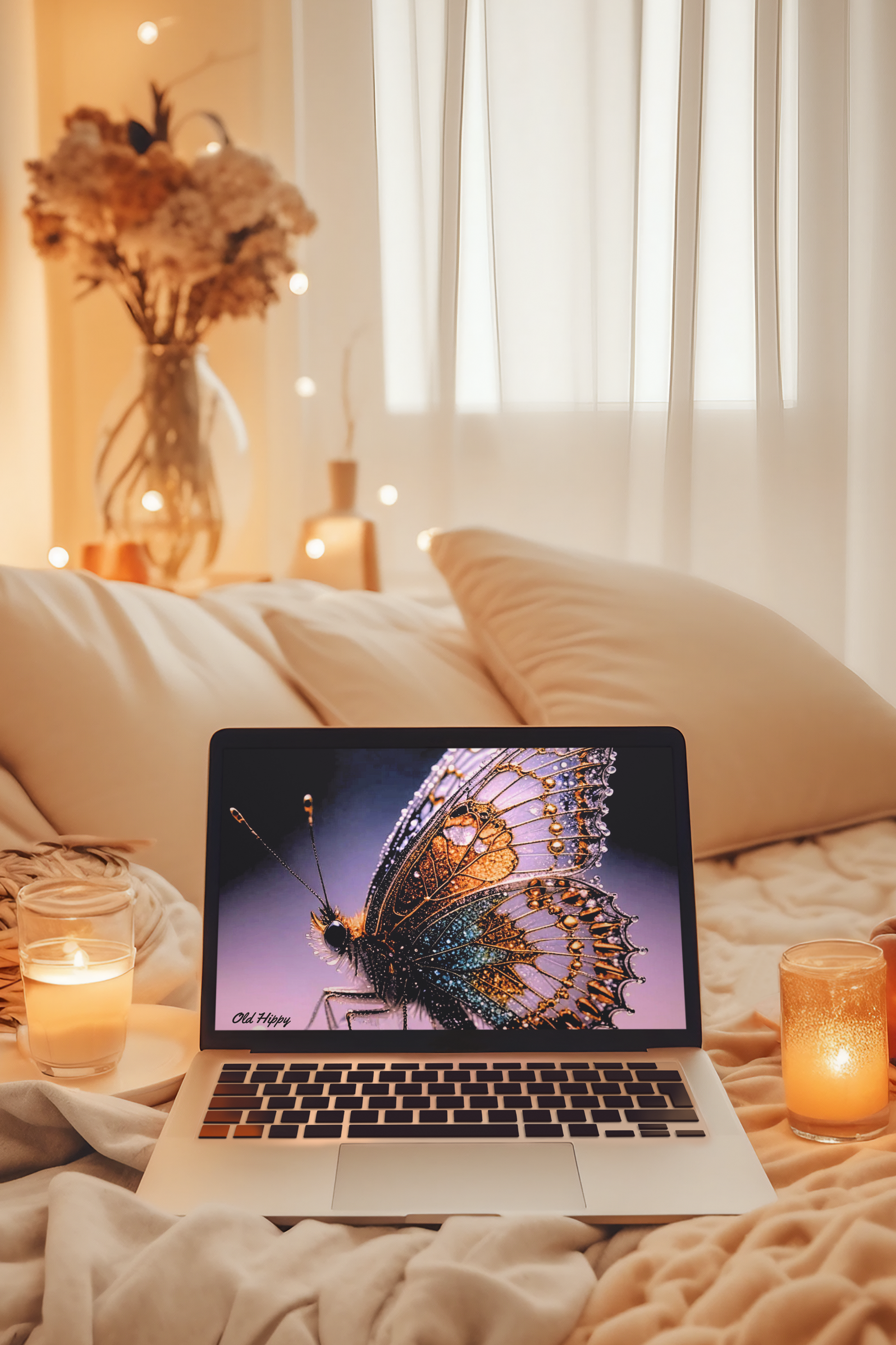 Set against a soft, twilight-toned backdrop, the butterfly becomes a radiant focal point—a symbol of transformation, delicacy, and divine detail. The metallic and crystalline textures evoke a sense of surreal magic, as if this creature emerged from a dream, frozen in time yet forever in motion.