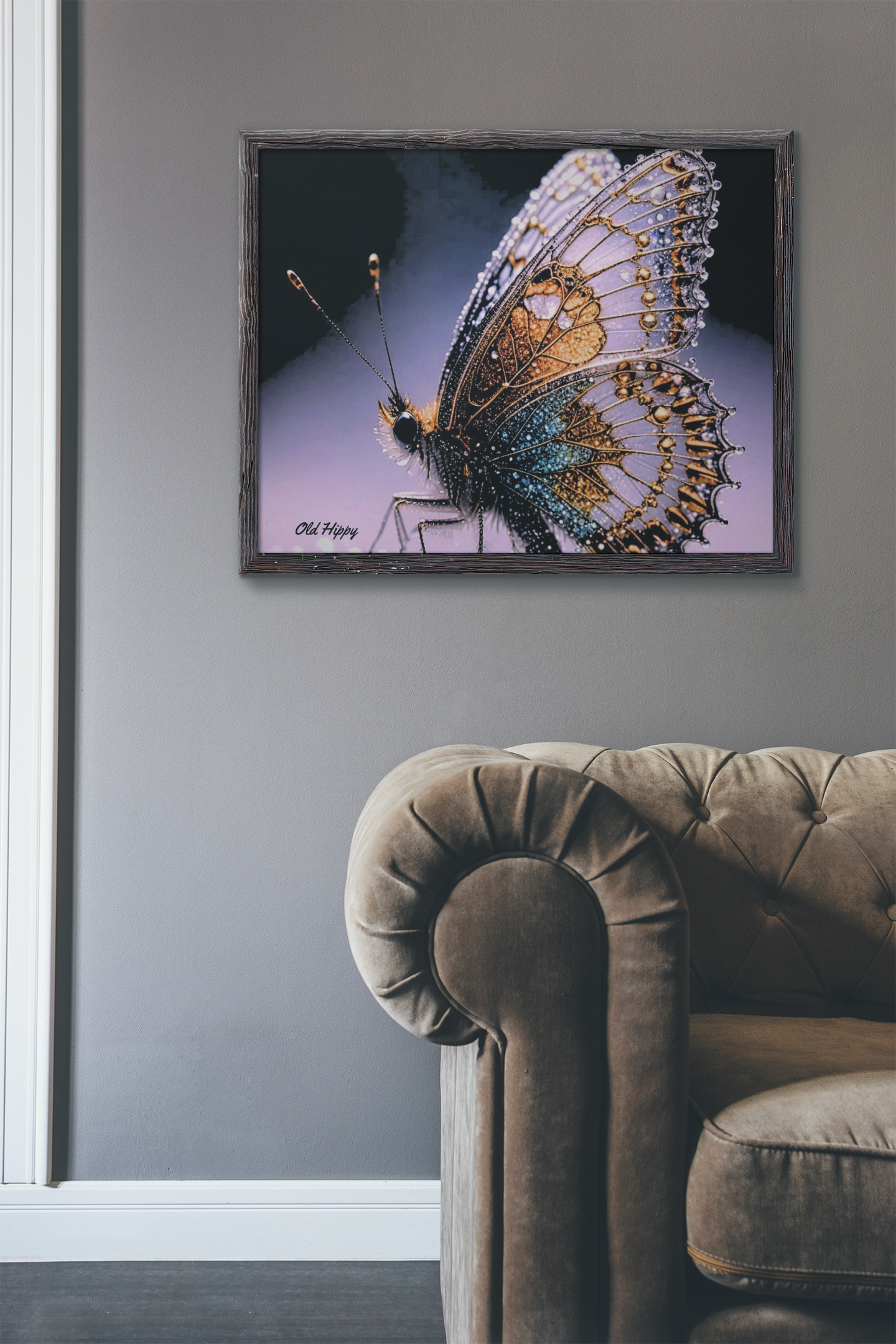 A marvel of intricate design and fragile beauty, this butterfly appears not of earth but of some enchanted realm. Its wings, laced with veins of gold and dusted in shimmering blues, ambers, and silvers, glisten like they were spun from jewels and stardust. Tiny droplets cling to its form like pearls, enhancing the illusion of a living gem caught in a moment of stillness.