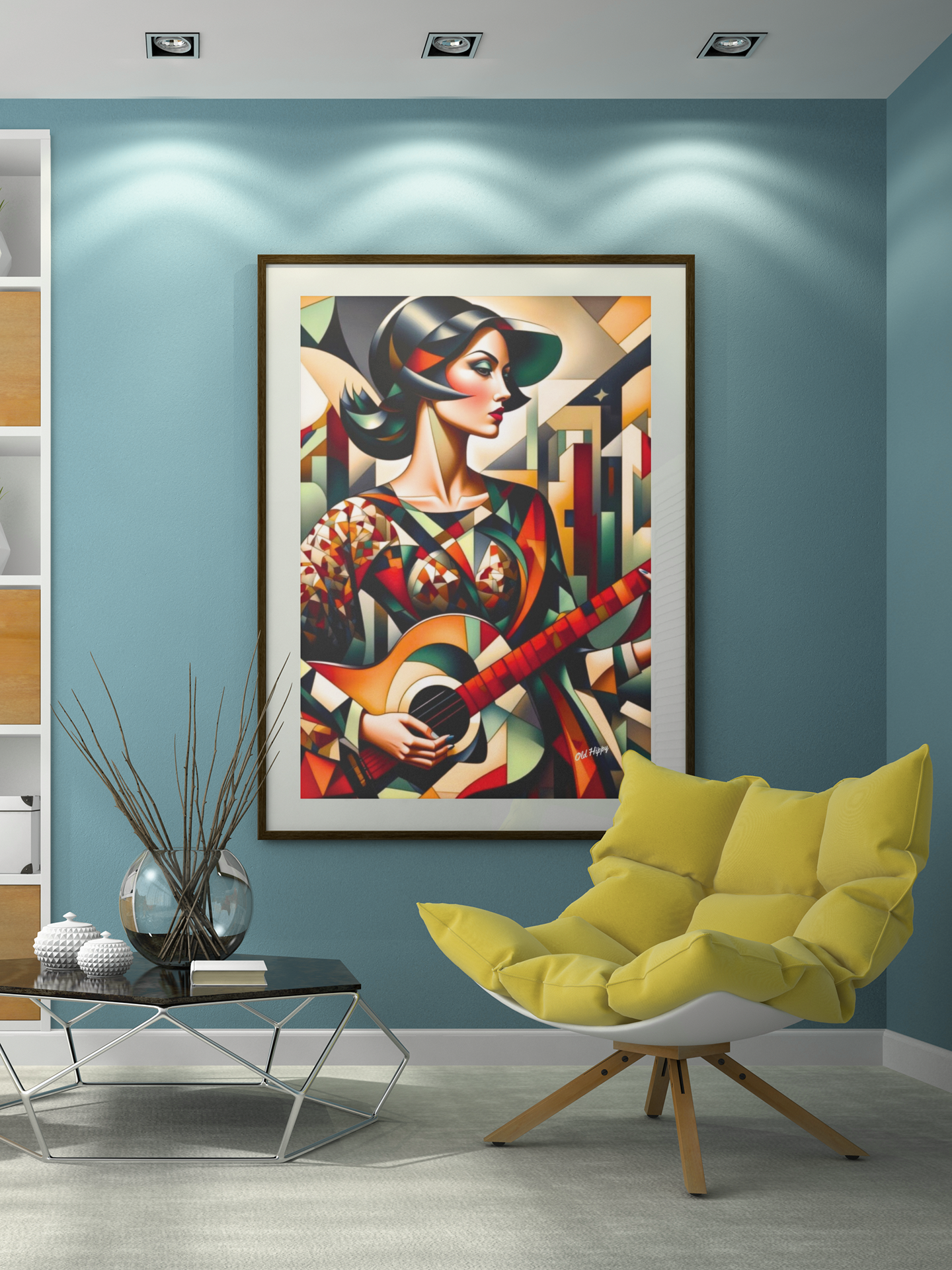 Step into a world of color, rhythm, and abstract expression with “The Music Within”, a limited edition AI-generated digital art piece inspired by the iconic Cubist style of Pablo Picasso. This bold and modern composition features a poised woman strumming her guitar against a geometric cityscape, blending musical emotion with sharp angles and vibrant contrasts.