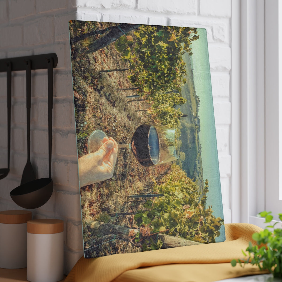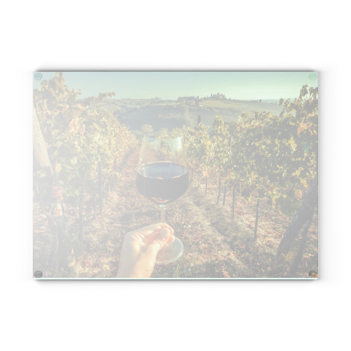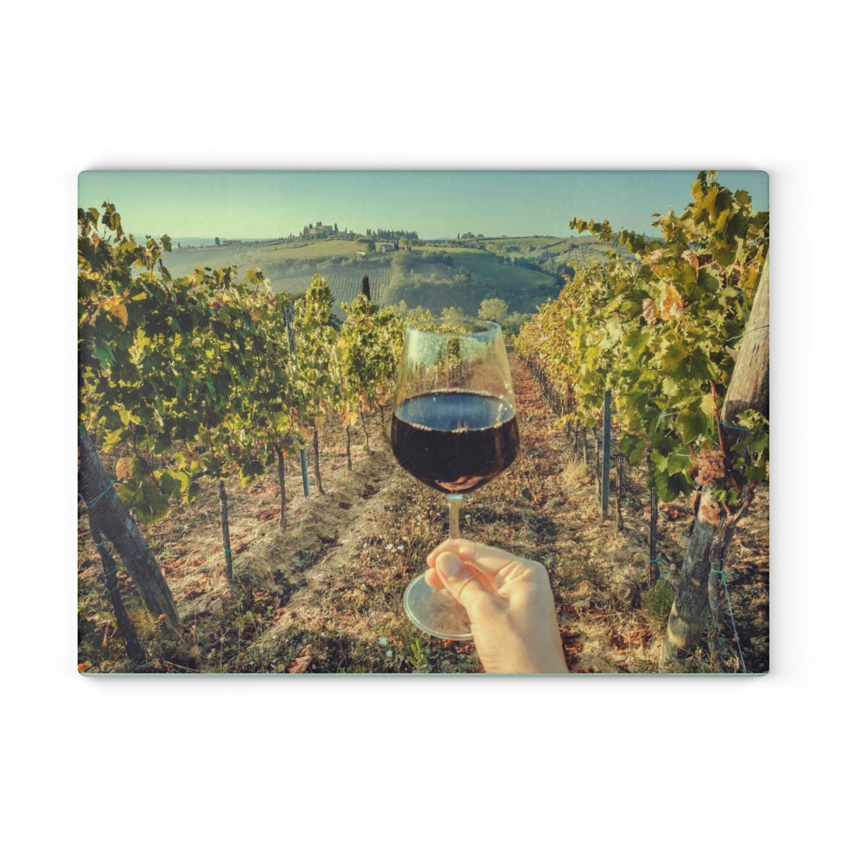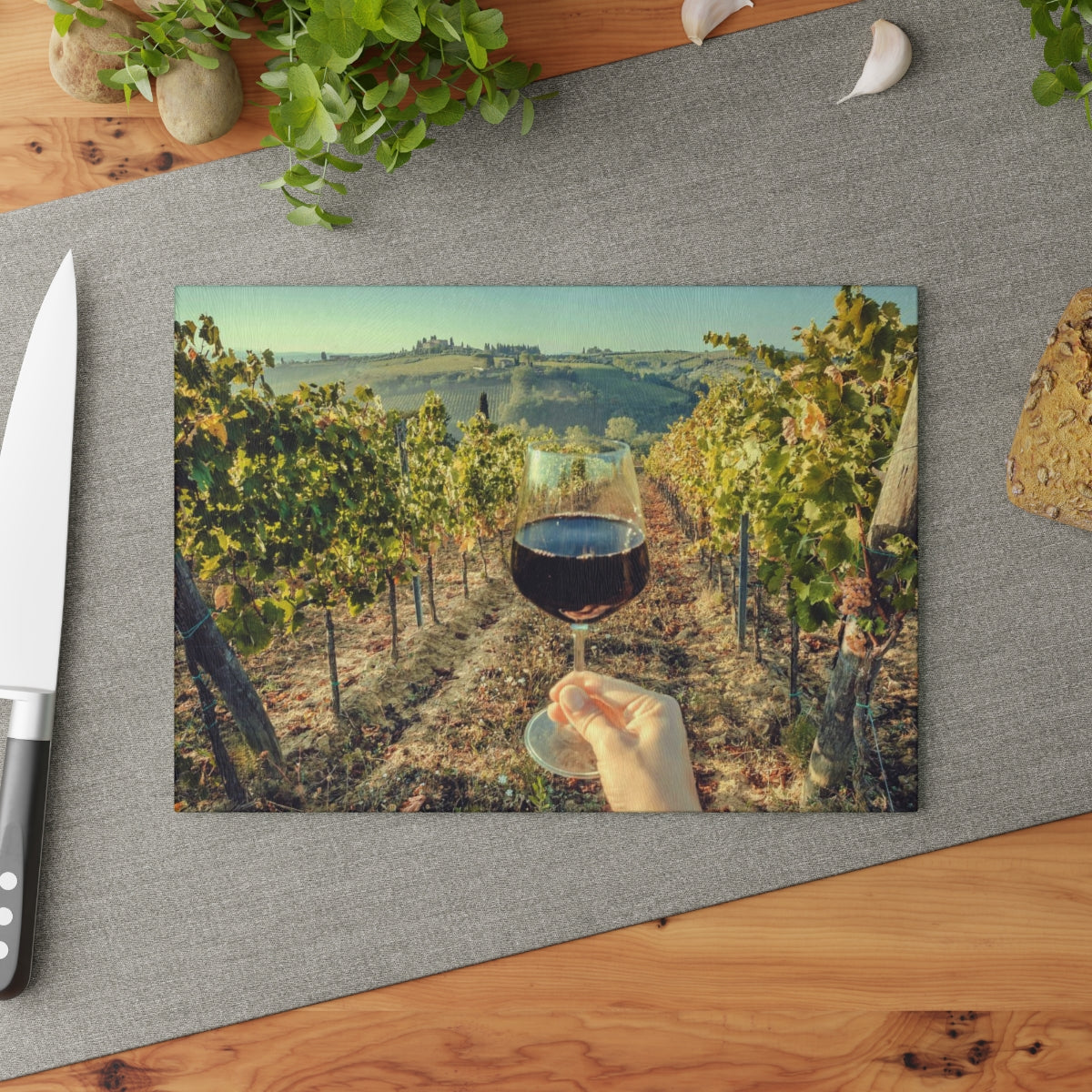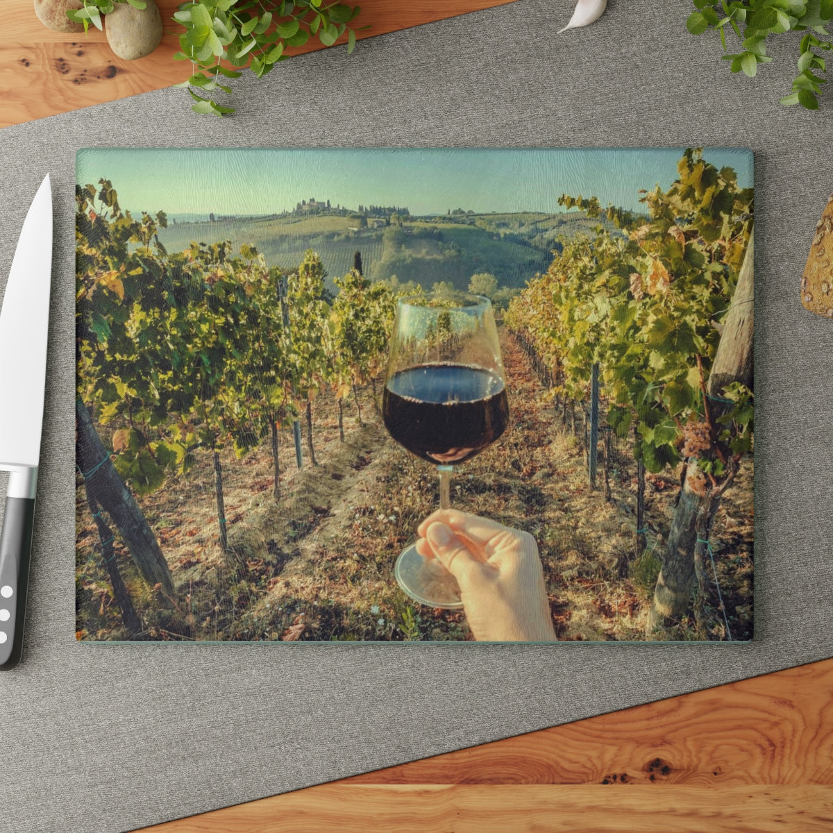 Bring a touch of Tuscany into any kitchen or living area with this custom glass cutting board. Its tampered glass material is robust and helps prepare many a tasty meal for a long time to come. The textured surface makes it an ideal chopping, slicing, and dicing area. It also can be displayed as an art piece for decor. Available in two sizes: 8" x 11" and 11" x 15".
