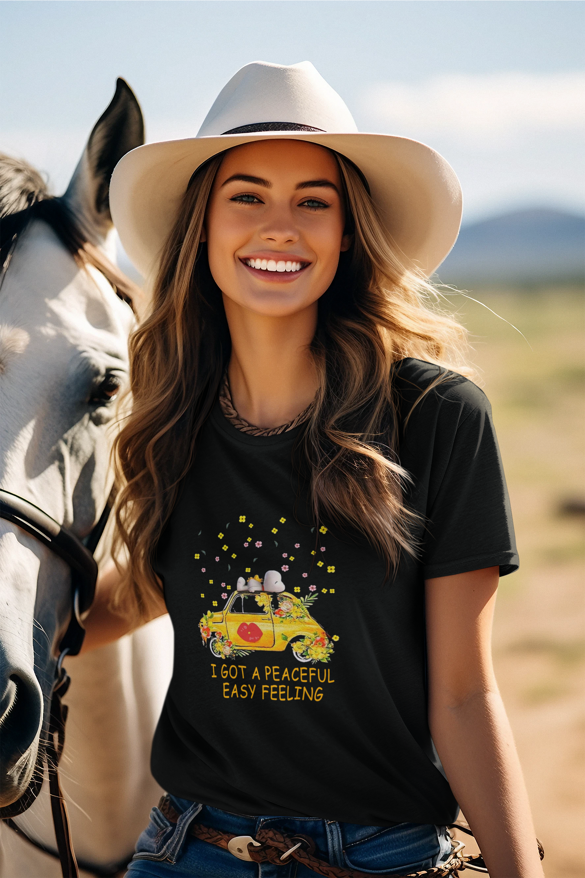 Bring Back great memories with these classic lines from the 70s. The casual tee shirt features an image of a VW which evokes a sense of nostalgia and laid-back vibes. In the center of the shirt, a classic Volkswagen with a snoopy figure is prominently displayed, capturing the essence of a bygone era associated with freedom, adventure, and a carefree spirit. The phrase “I’ve got a peaceful easy feeling” is displayed below the VW.