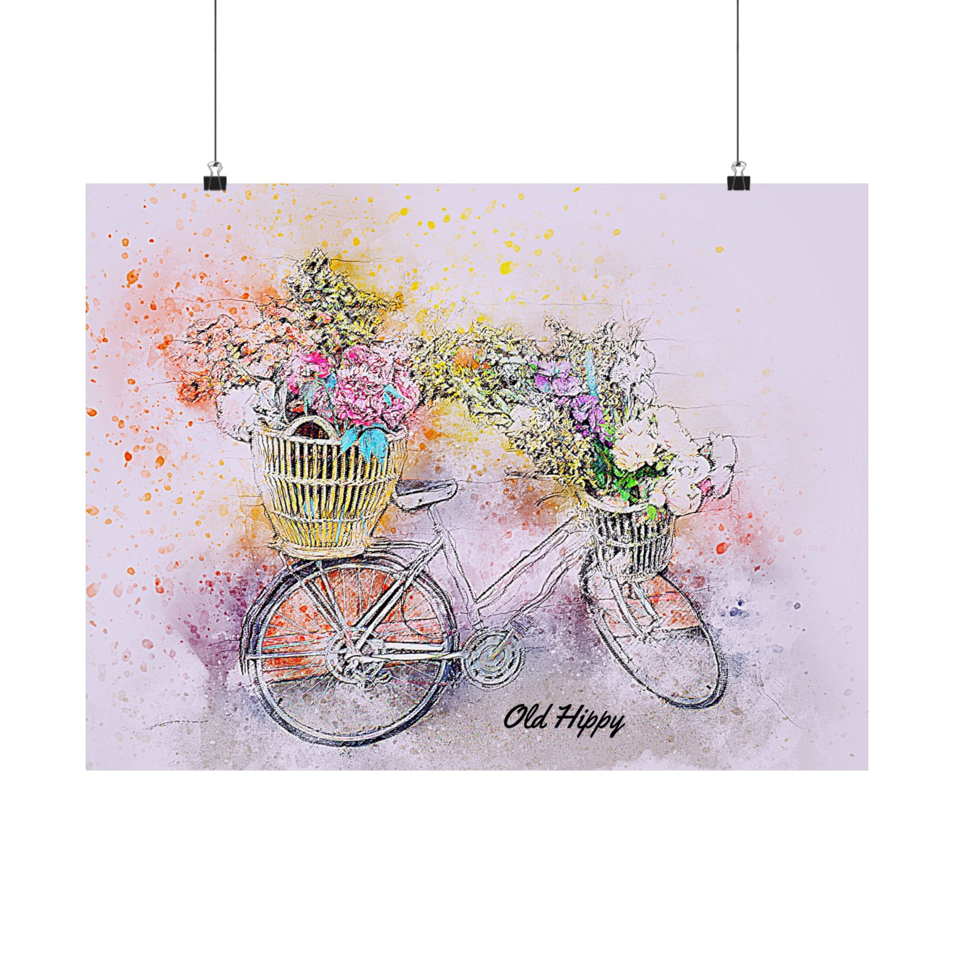 Watercolor impressionist image of a bicycle and flowers. These supreme quality print posters are suitable for framing
