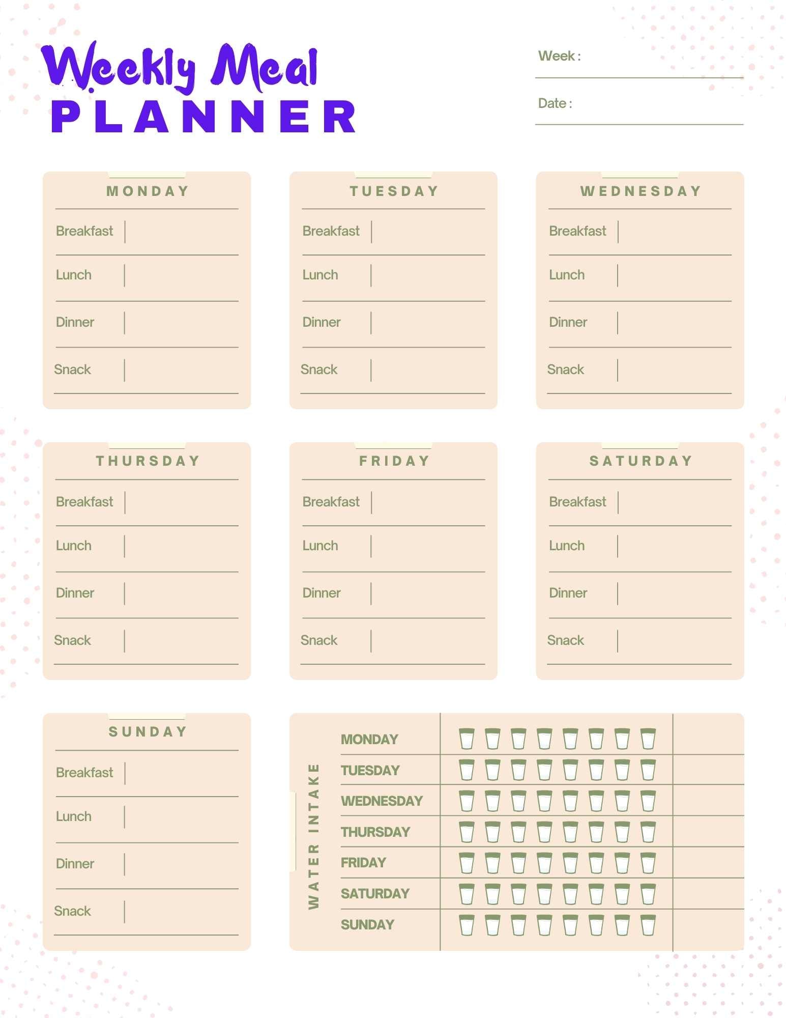 This handy meal planner gives you a way to plan a weeks meals. It also has 7 days of note sheets for added details, instructions, or comments.