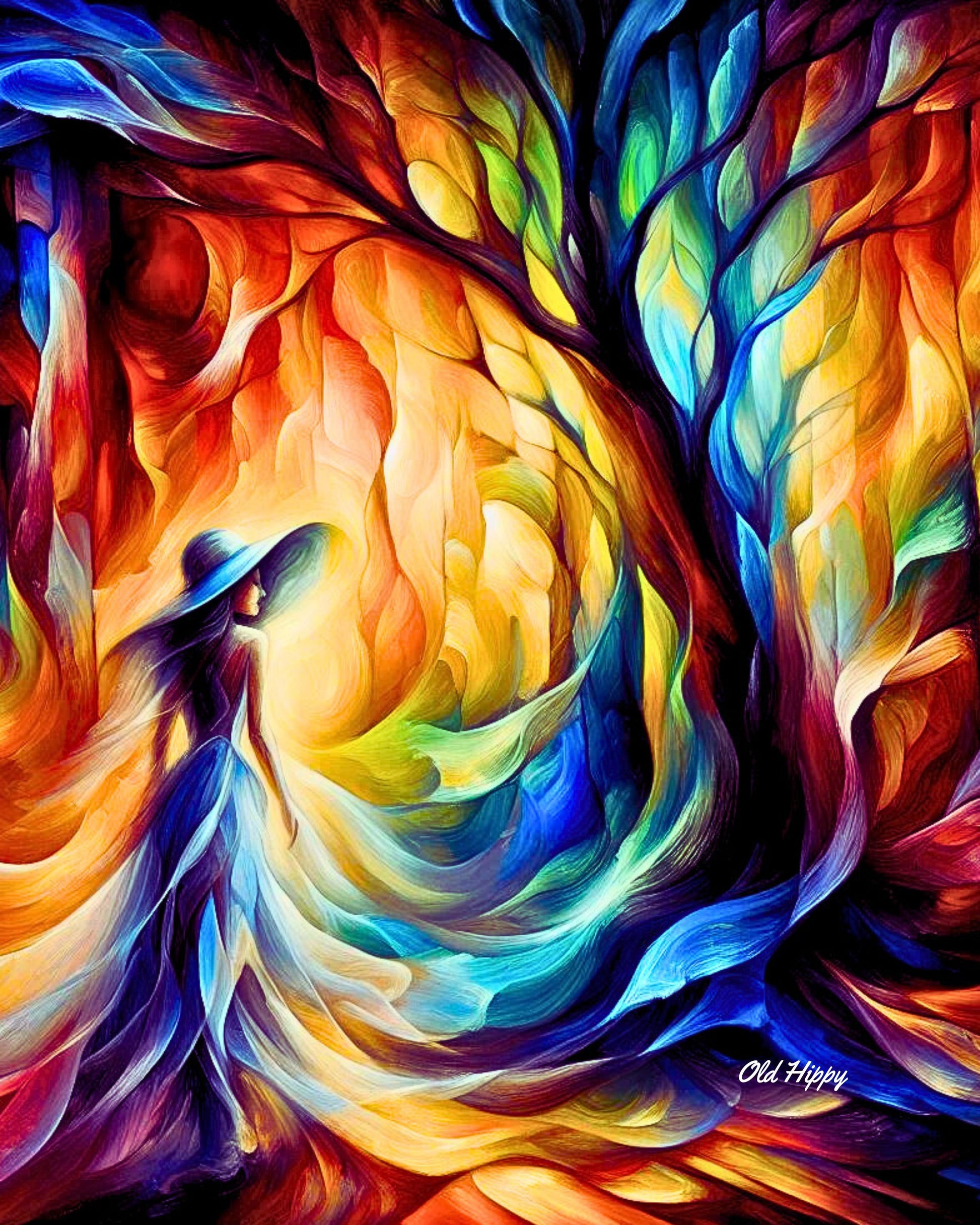 The woman appears both present and ethereal, her translucent figure drifting between light and shadow, as if woven from the very essence of the forest. Dynamic brushstroke patterns swirl like wind and flame, guiding the viewer’s eye in a rhythmic dance across the canvas. Subtle figures and forms emerge from the colors, inviting the imagination to interpret what lies hidden in the trees.