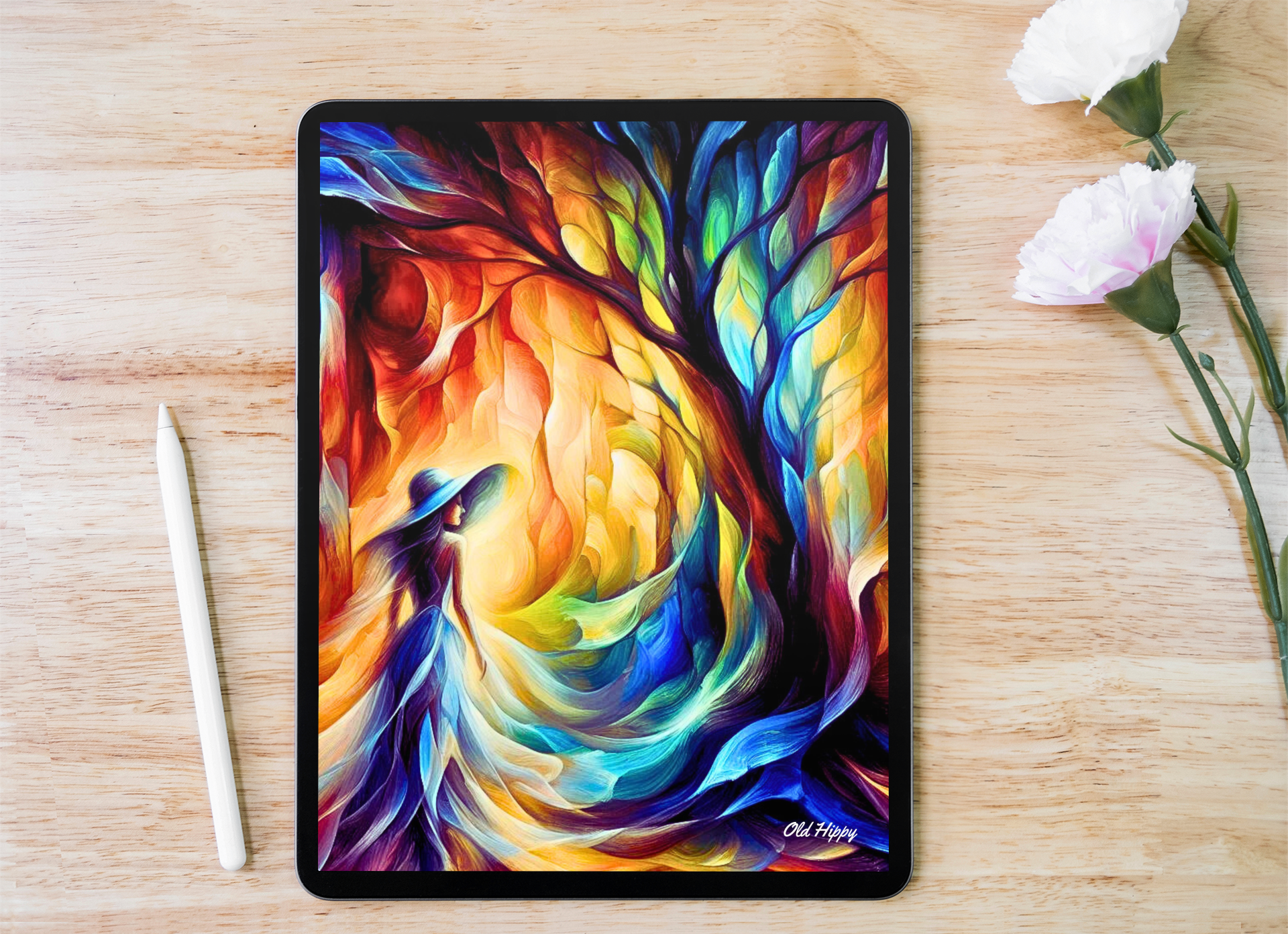 A luminous expressionist dreamscape, “Whispers in the Flamewood” captures a mysterious woman in a flowing white gown and wide-brimmed hat, seamlessly merging with the forest around her. Painted in radiant waves of electric blue, ember red, golden amber, and deep emerald, the scene evokes motion and mood—blurring the line between subject and setting.
