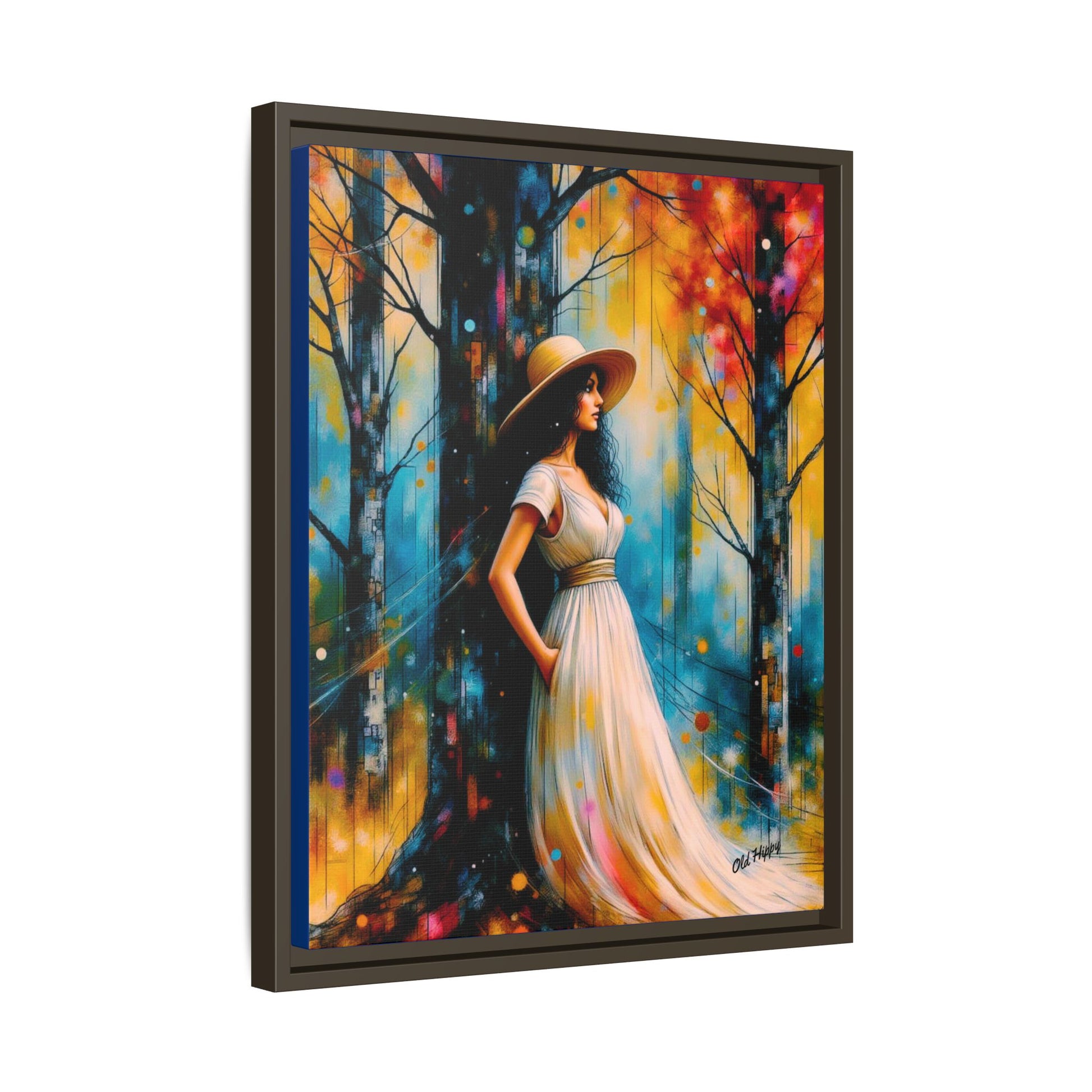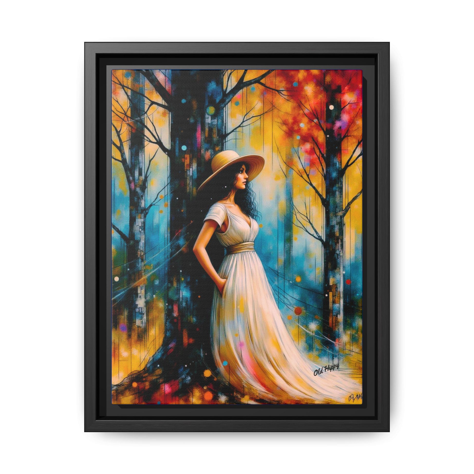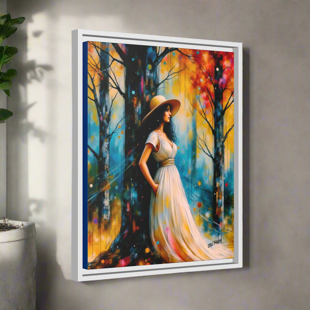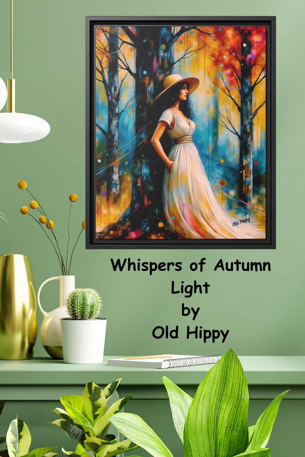 Bring the beauty of imagination to your home with “Whispers of Autumn Light”, a stunning AI-generated canvas artwork by Old Hippy. This breathtaking piece features a graceful woman in a flowing white gown and wide-brimmed hat, standing serenely among tall trees bathed in glowing shades of autumn gold, fiery reds, and deep forest blues.