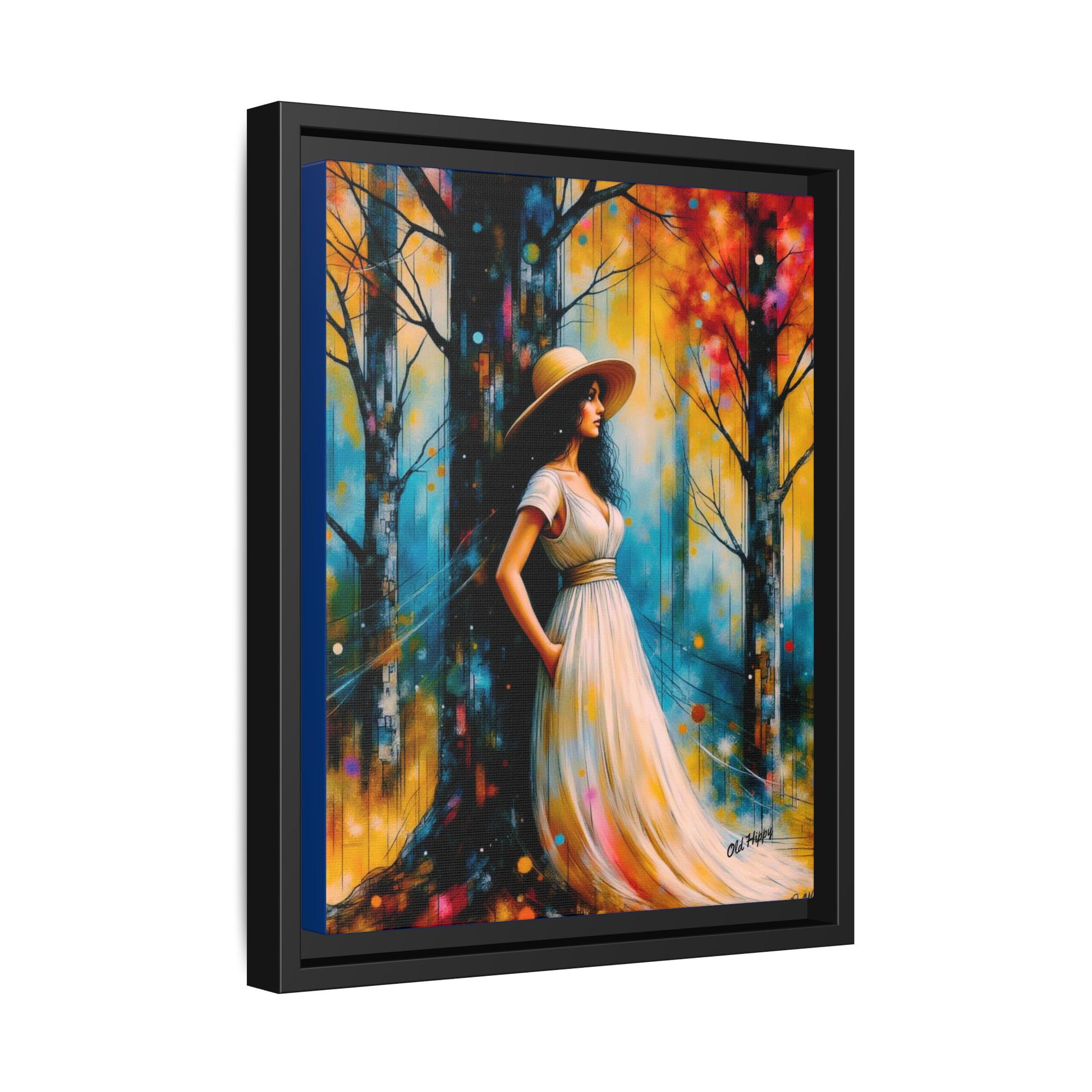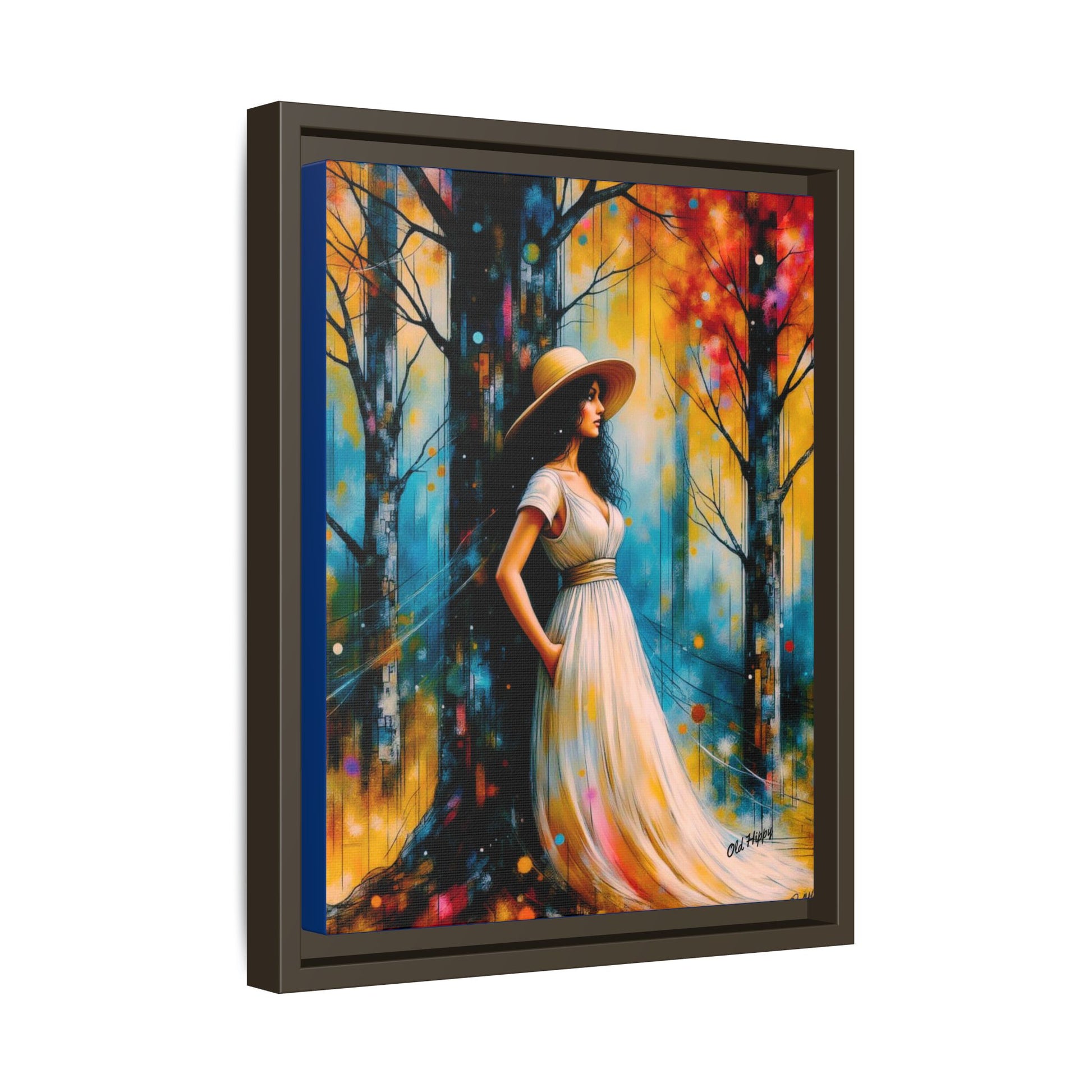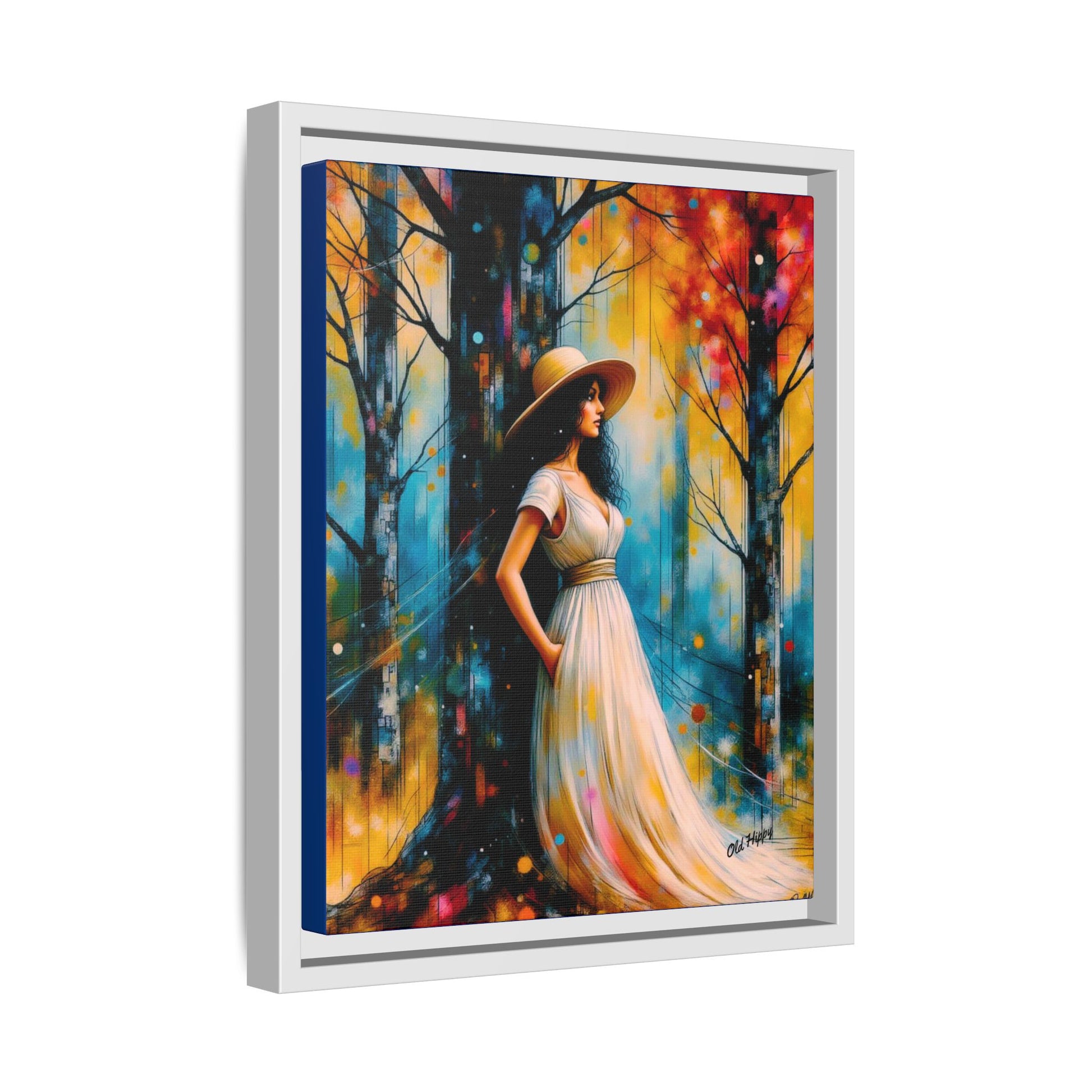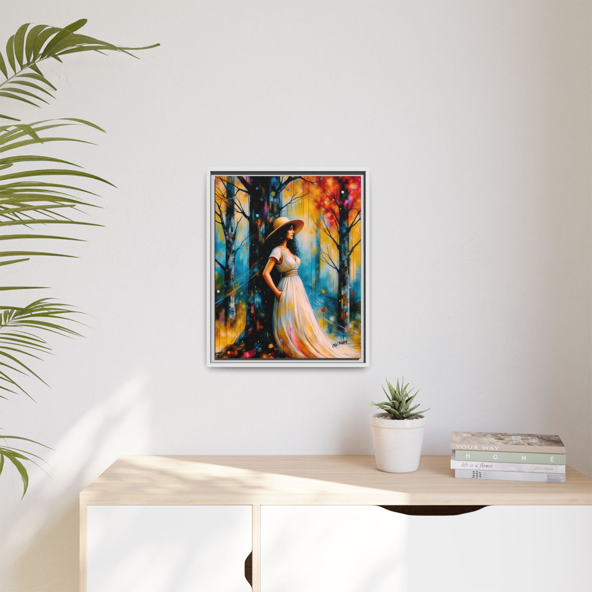 Bring the beauty of imagination to your home with “Whispers of Autumn Light”, a stunning AI-generated canvas artwork by Old Hippy. This breathtaking piece features a graceful woman in a flowing white gown and wide-brimmed hat, standing serenely among tall trees bathed in glowing shades of autumn gold, fiery reds, and deep forest blues.