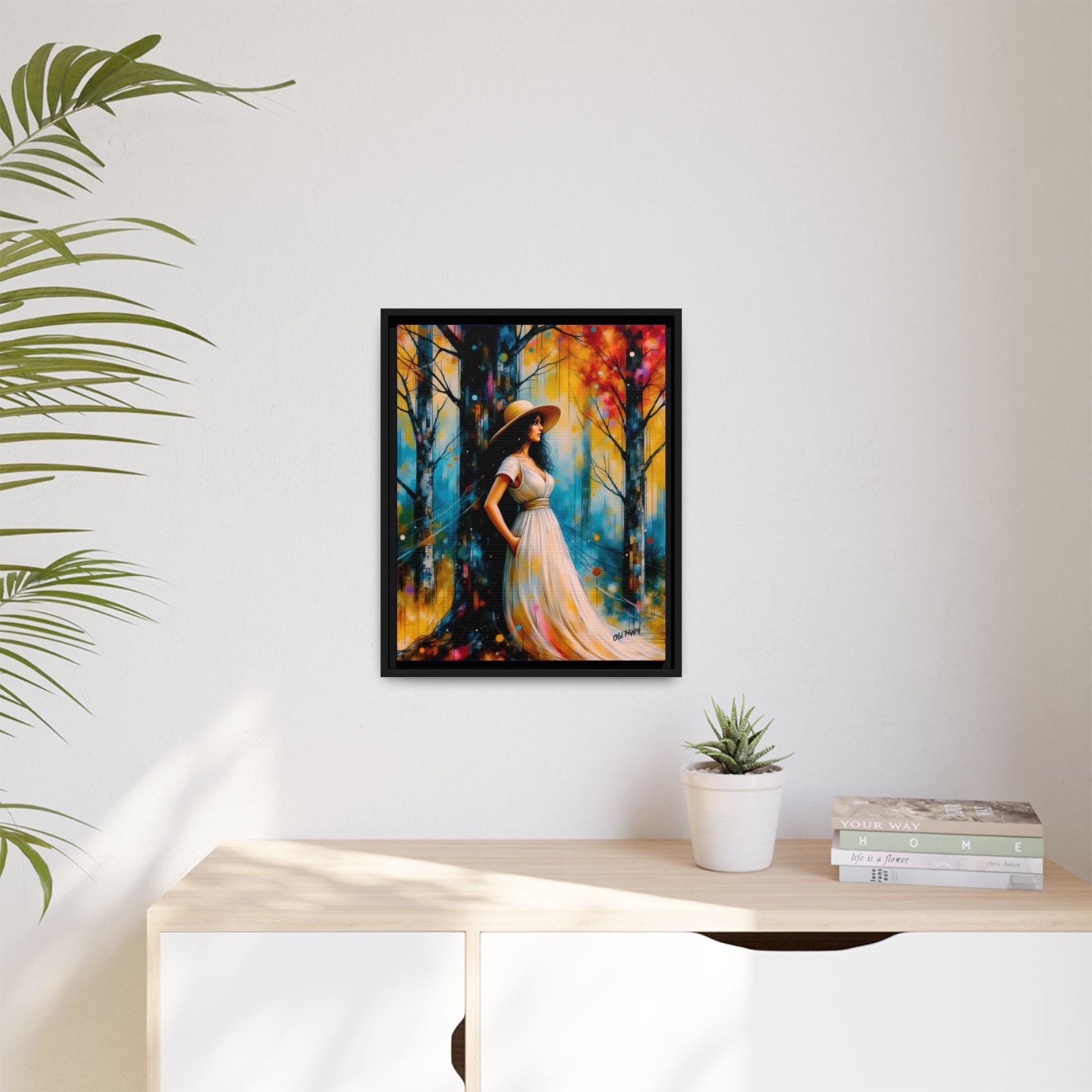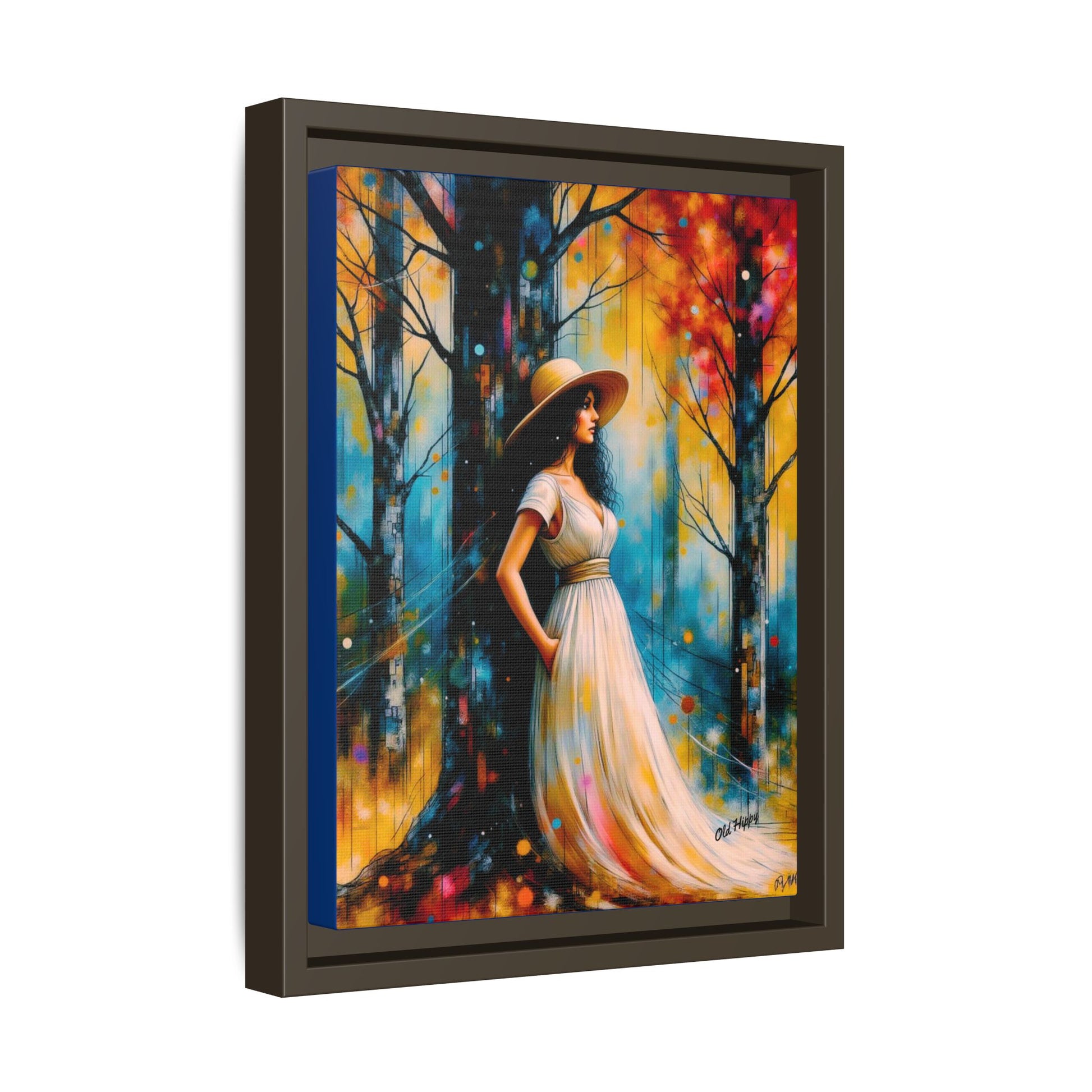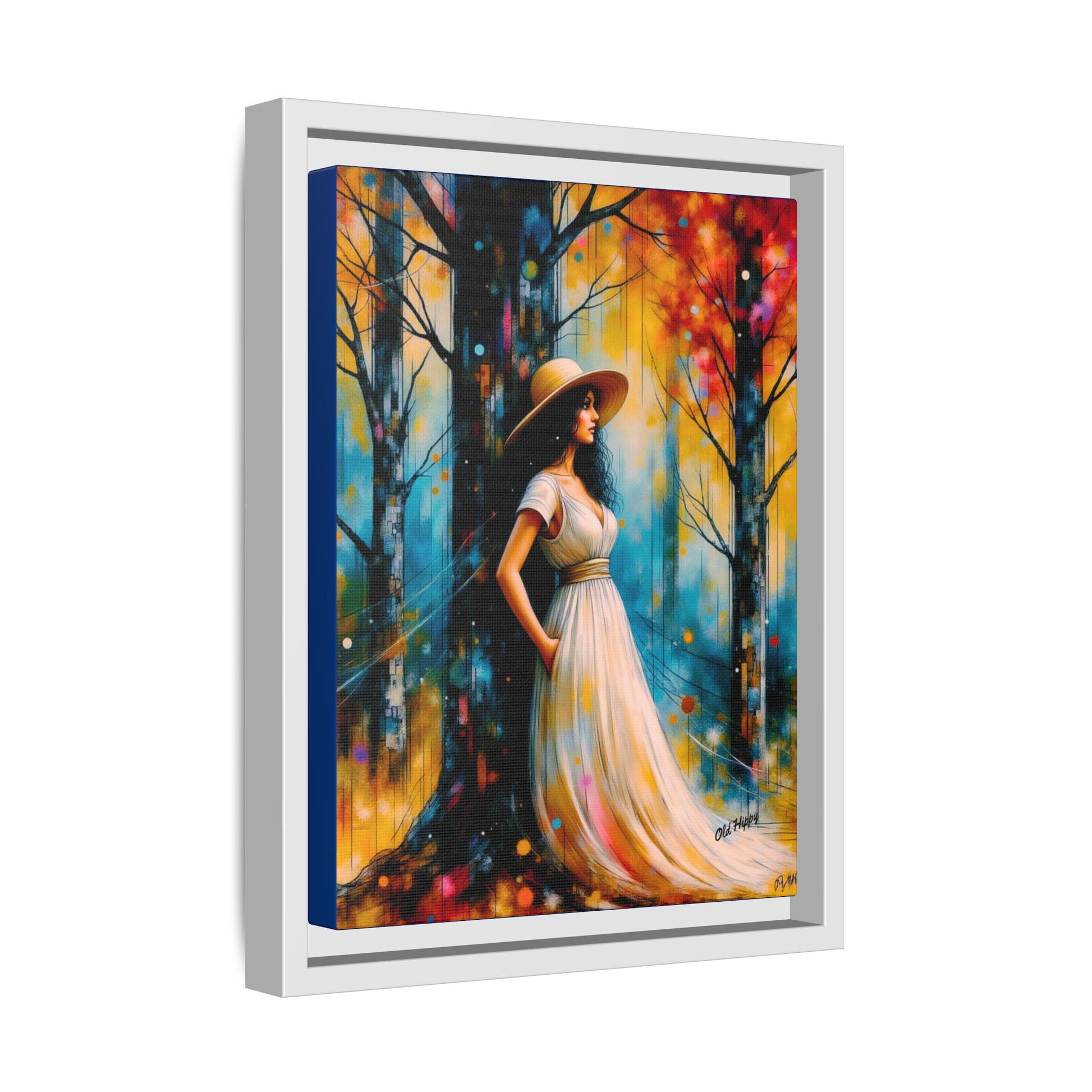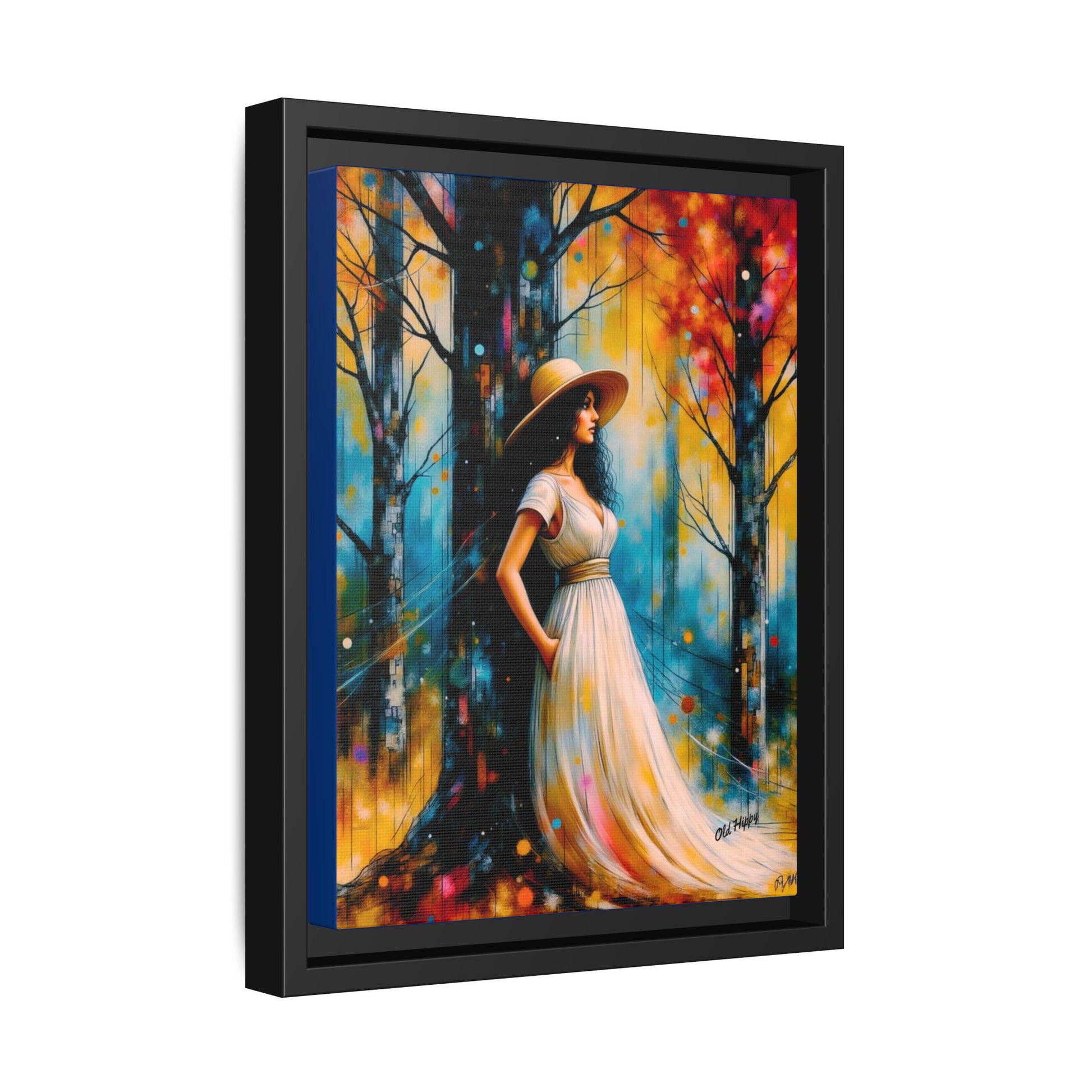 Bring the beauty of imagination to your home with “Whispers of Autumn Light”, a stunning AI-generated canvas artwork by Old Hippy. This breathtaking piece features a graceful woman in a flowing white gown and wide-brimmed hat, standing serenely among tall trees bathed in glowing shades of autumn gold, fiery reds, and deep forest blues.