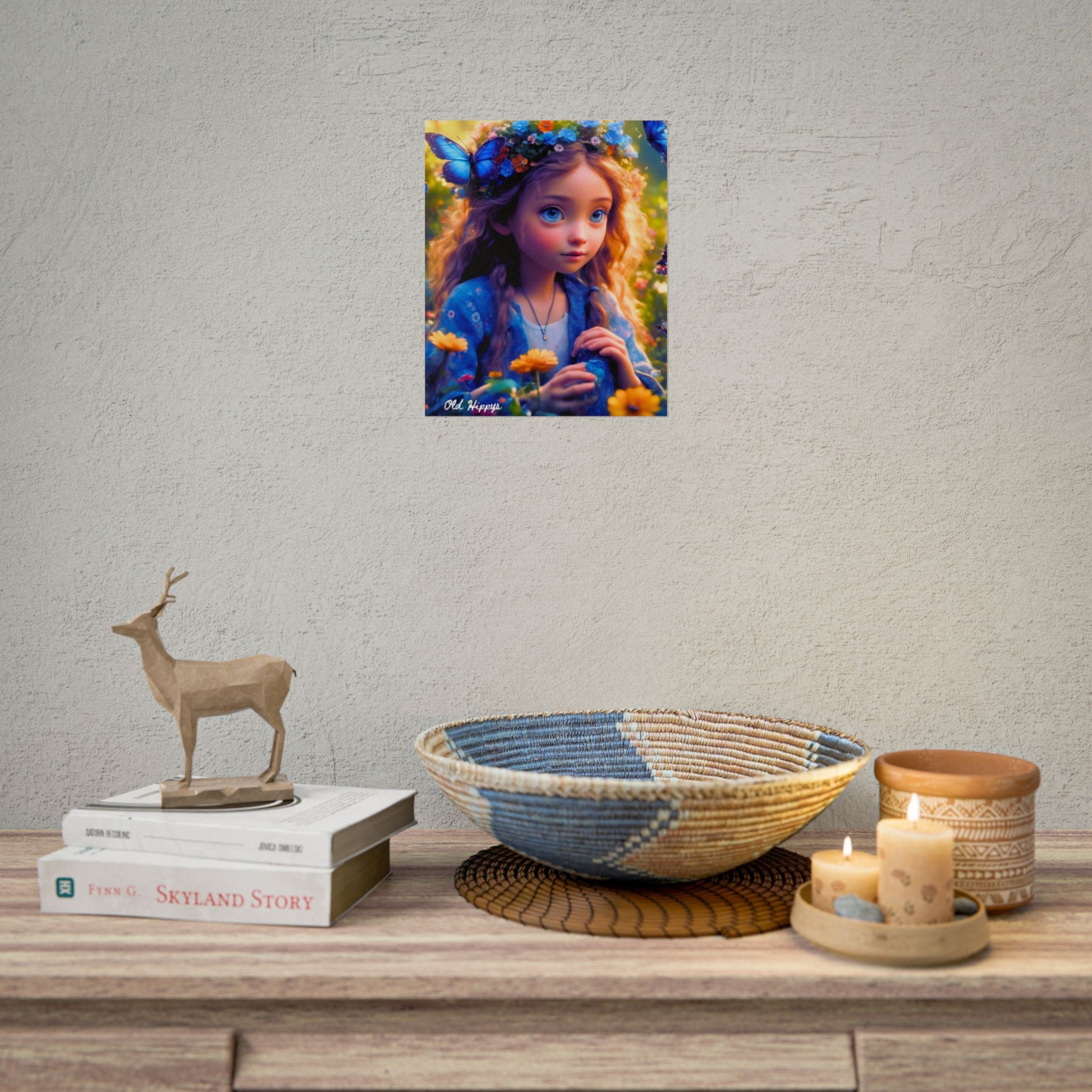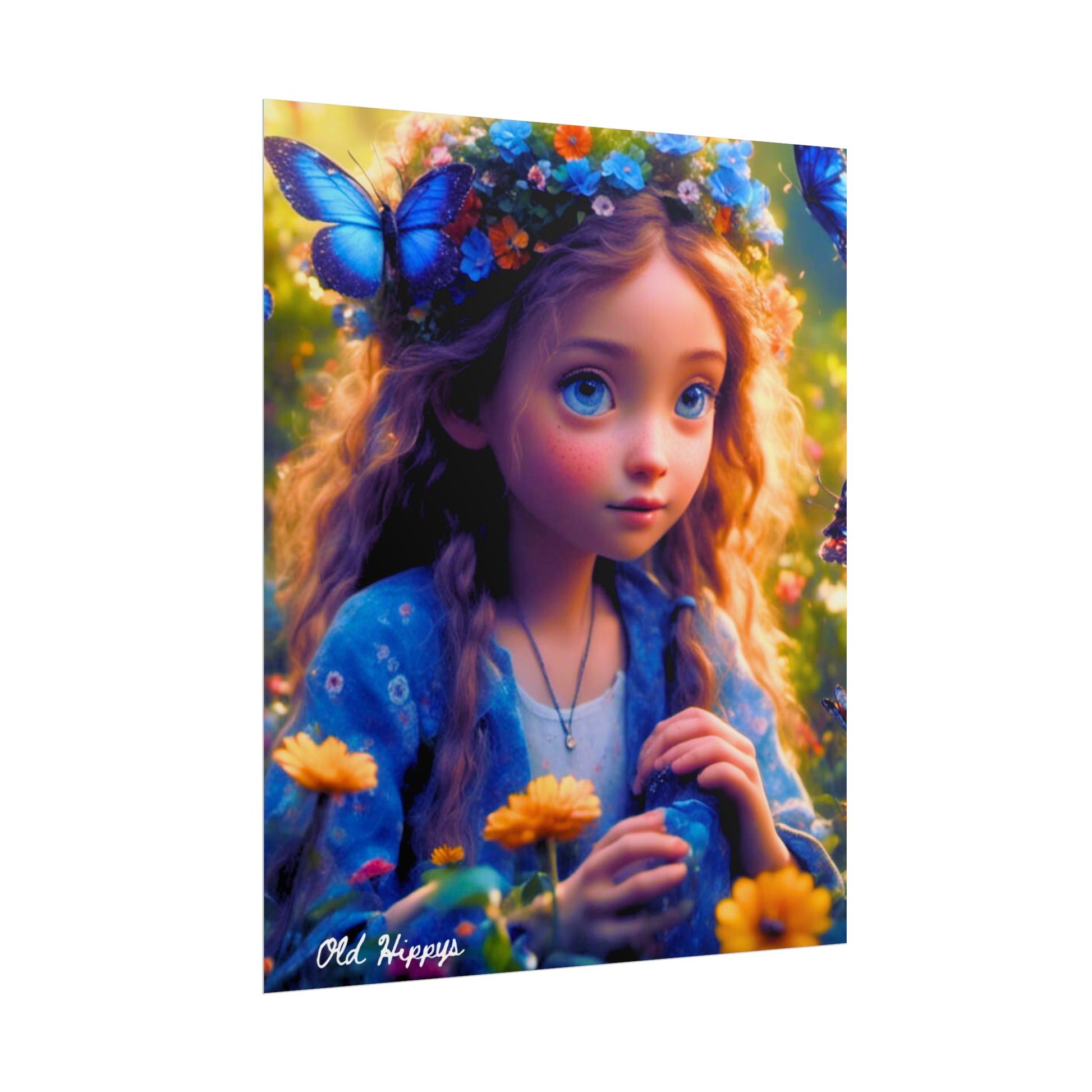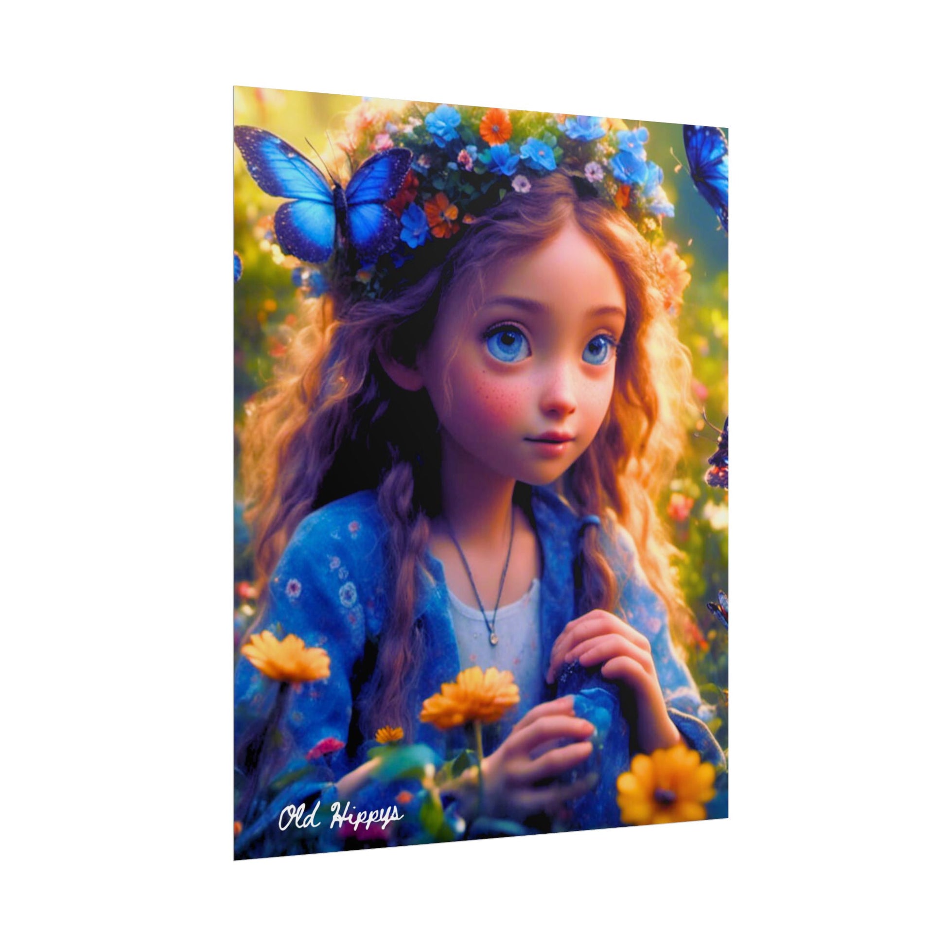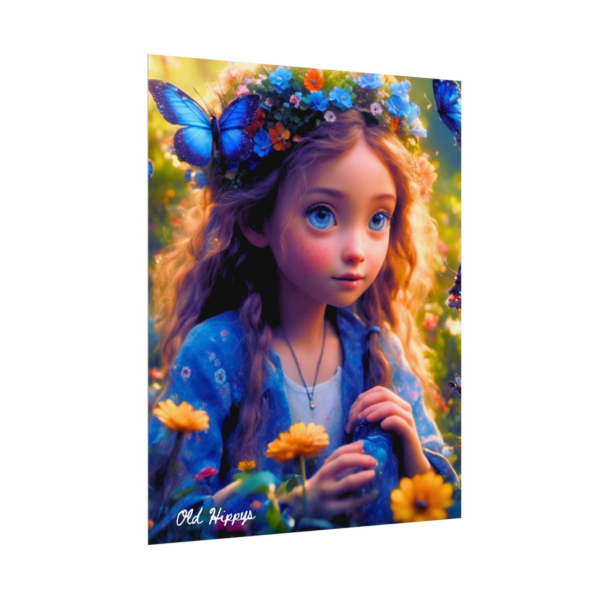 The digital painting portrays a young hippie woman, characterized by her big blue eyes that exude a sense of wonder and peace. Her appearance is hyper-realistic, with intricate details that bring her lifelike features into sharp focus. The colors in the painting are vibrant, enhancing the natural beauty of the scene.