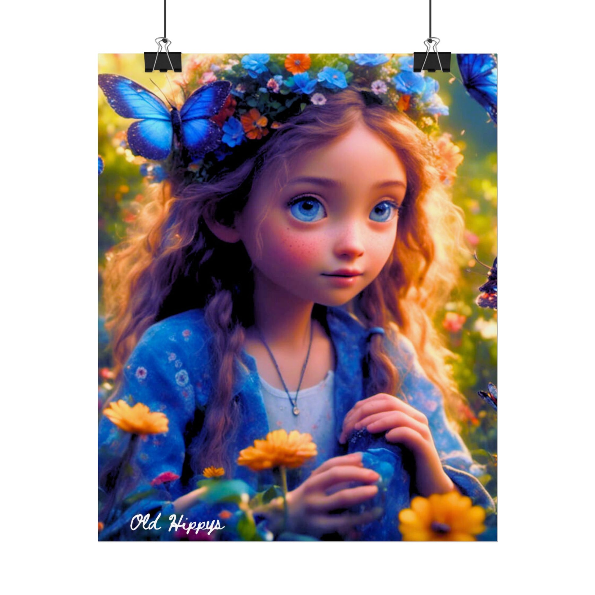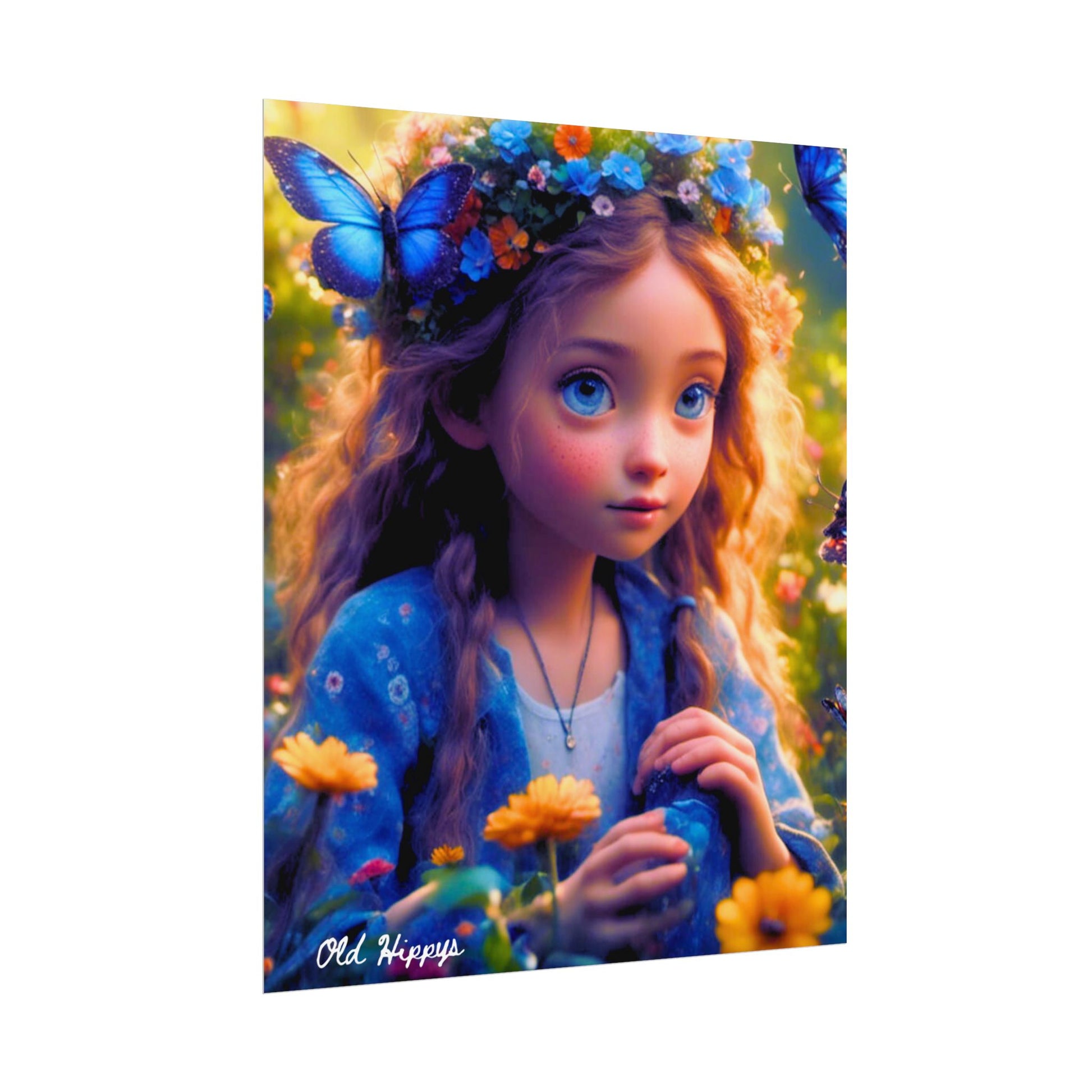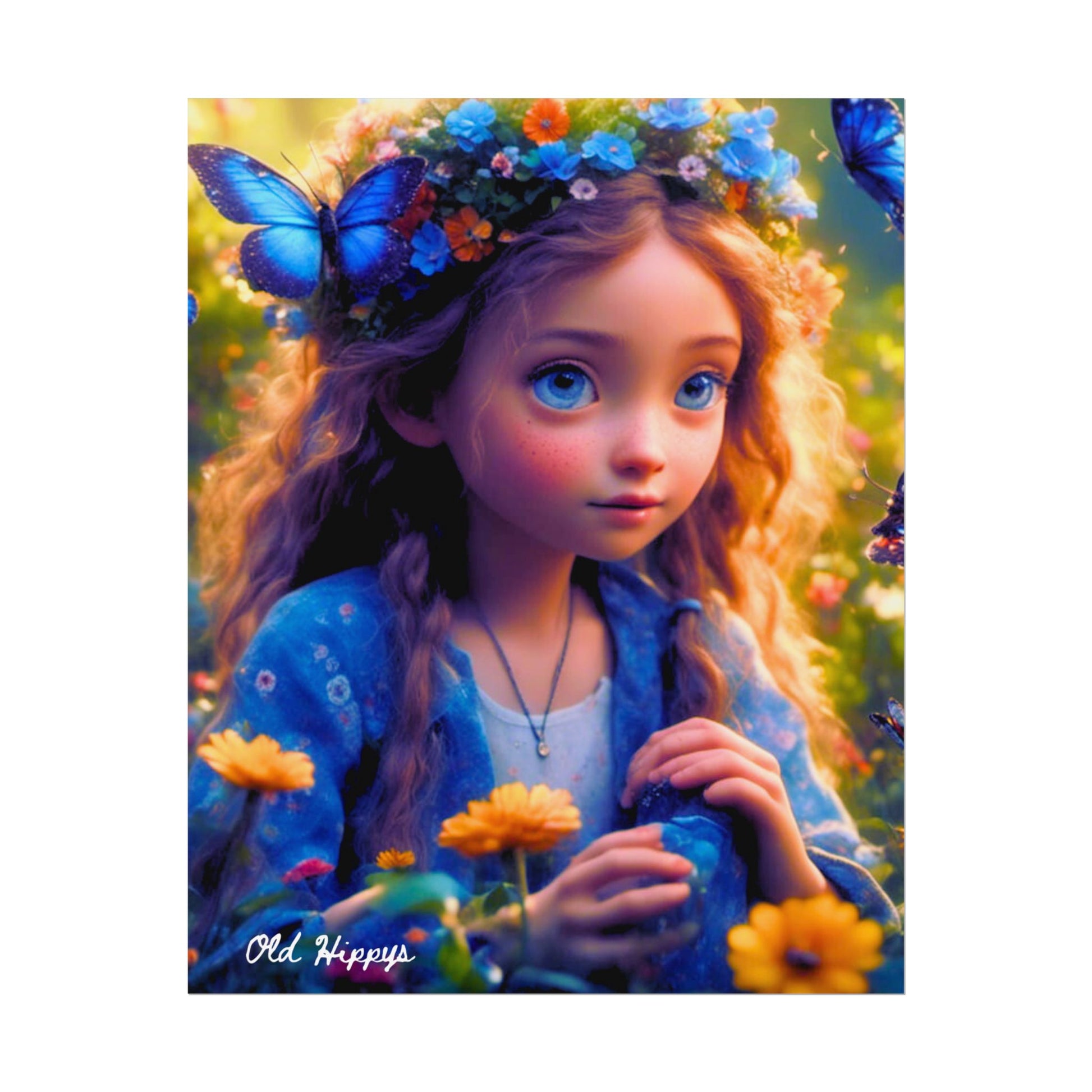 The digital painting portrays a young hippie woman, characterized by her big blue eyes that exude a sense of wonder and peace. Her appearance is hyper-realistic, with intricate details that bring her lifelike features into sharp focus. The colors in the painting are vibrant, enhancing the natural beauty of the scene.