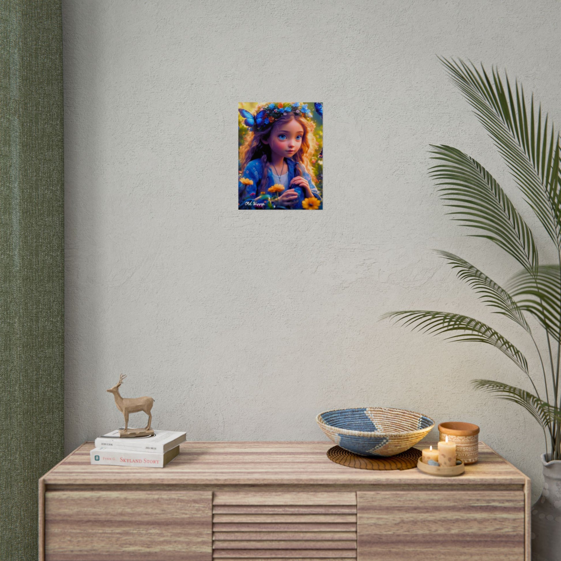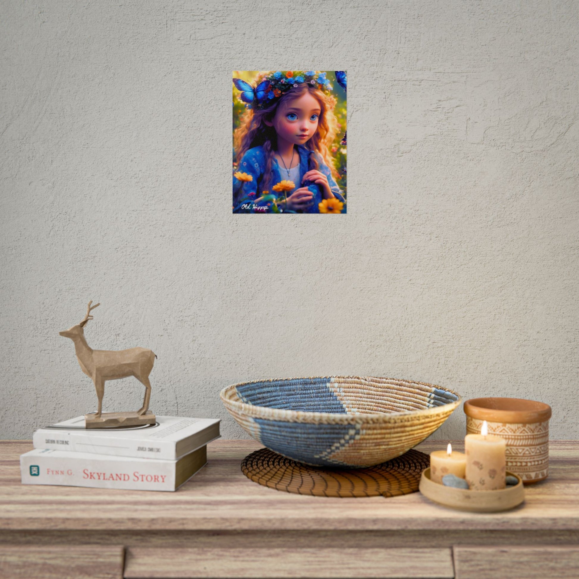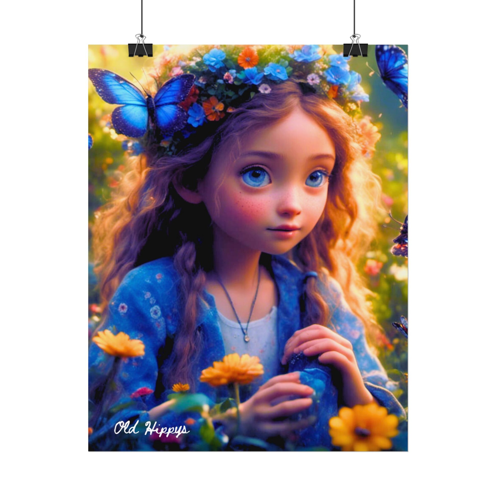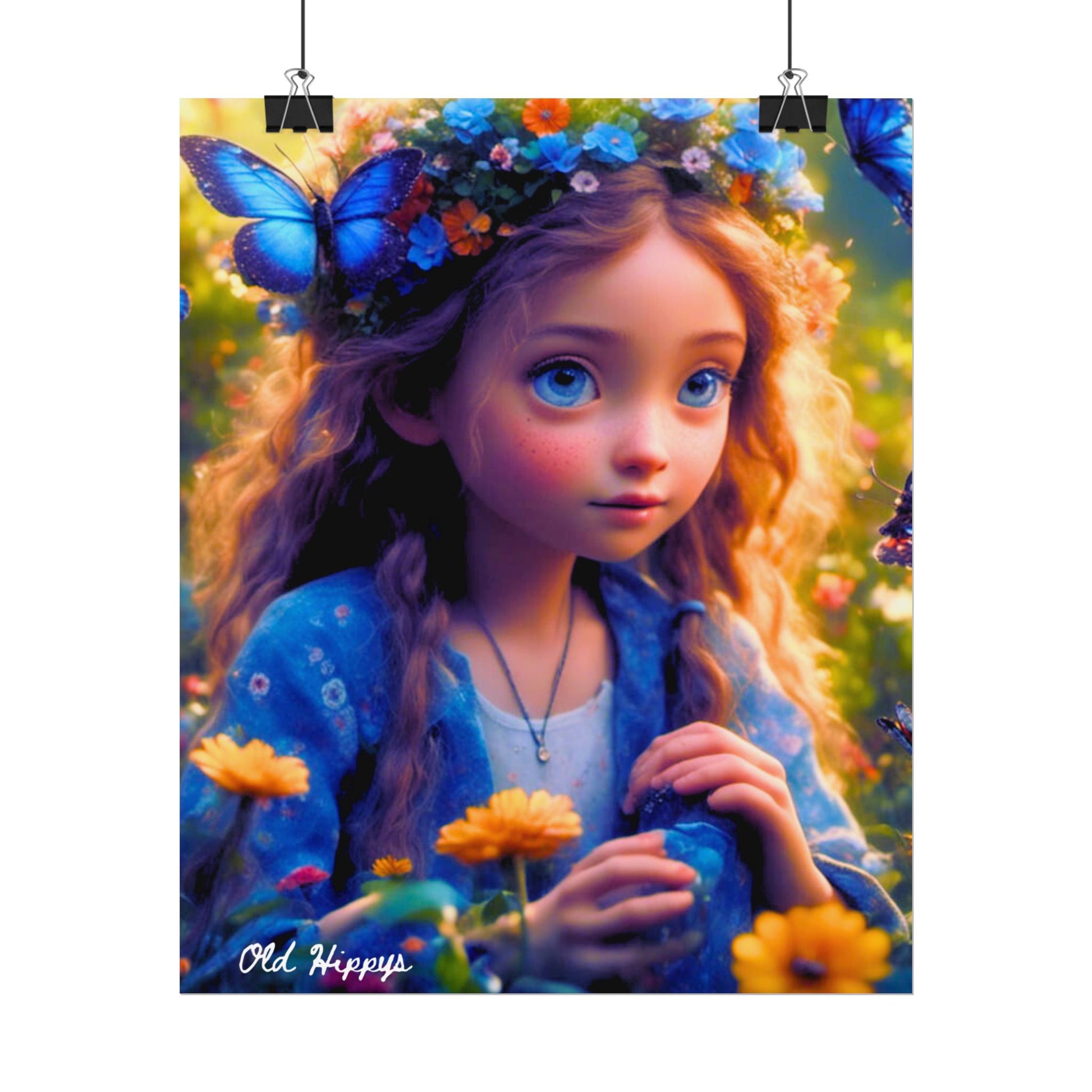 The digital painting portrays a young hippie woman, characterized by her big blue eyes that exude a sense of wonder and peace. Her appearance is hyper-realistic, with intricate details that bring her lifelike features into sharp focus. The colors in the painting are vibrant, enhancing the natural beauty of the scene.